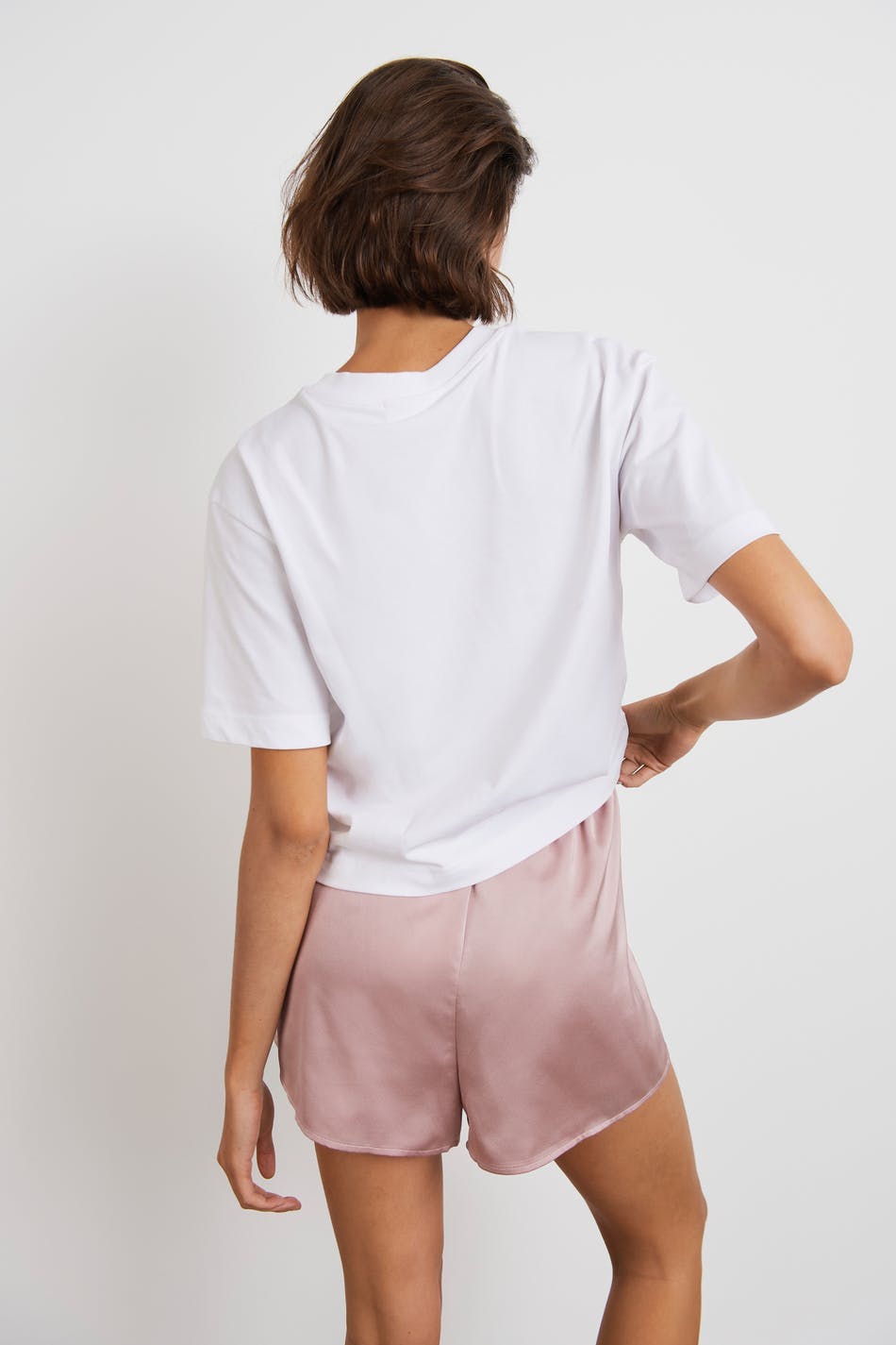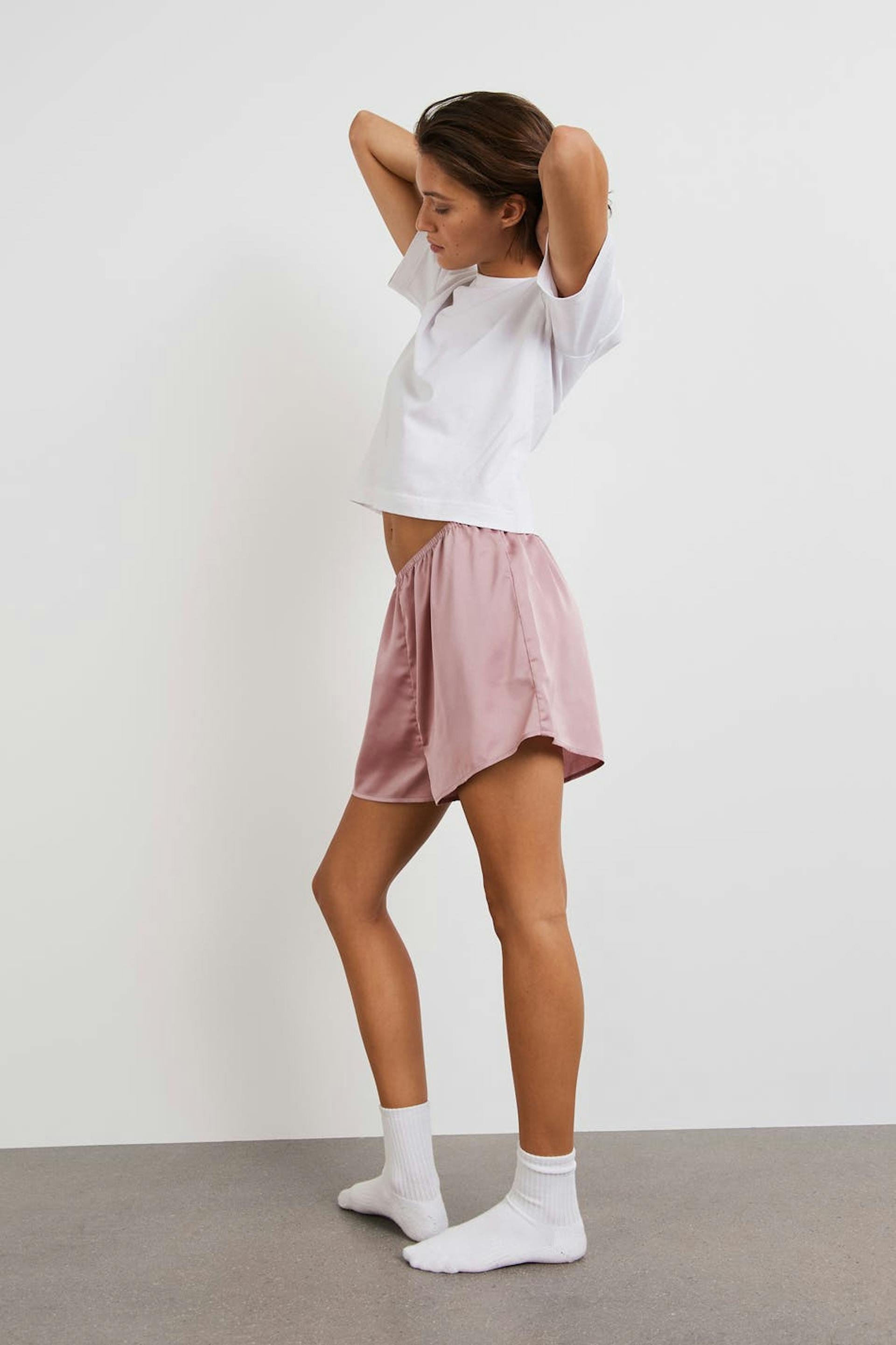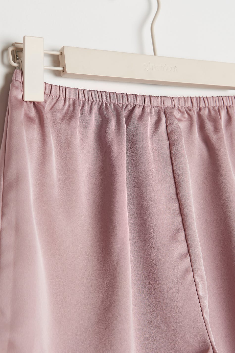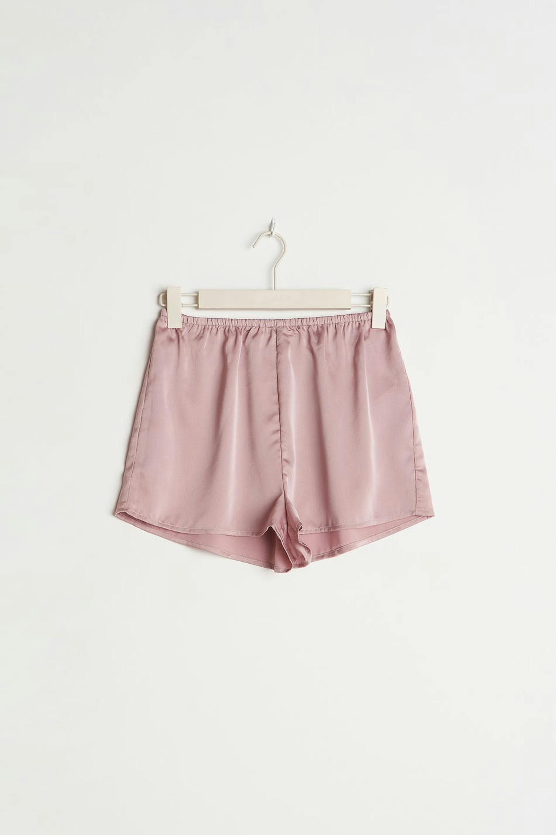 Korte pyjamasshorts med en vævet kvalitet i satin. Shortsene er pink og har en elastik ved taljen.