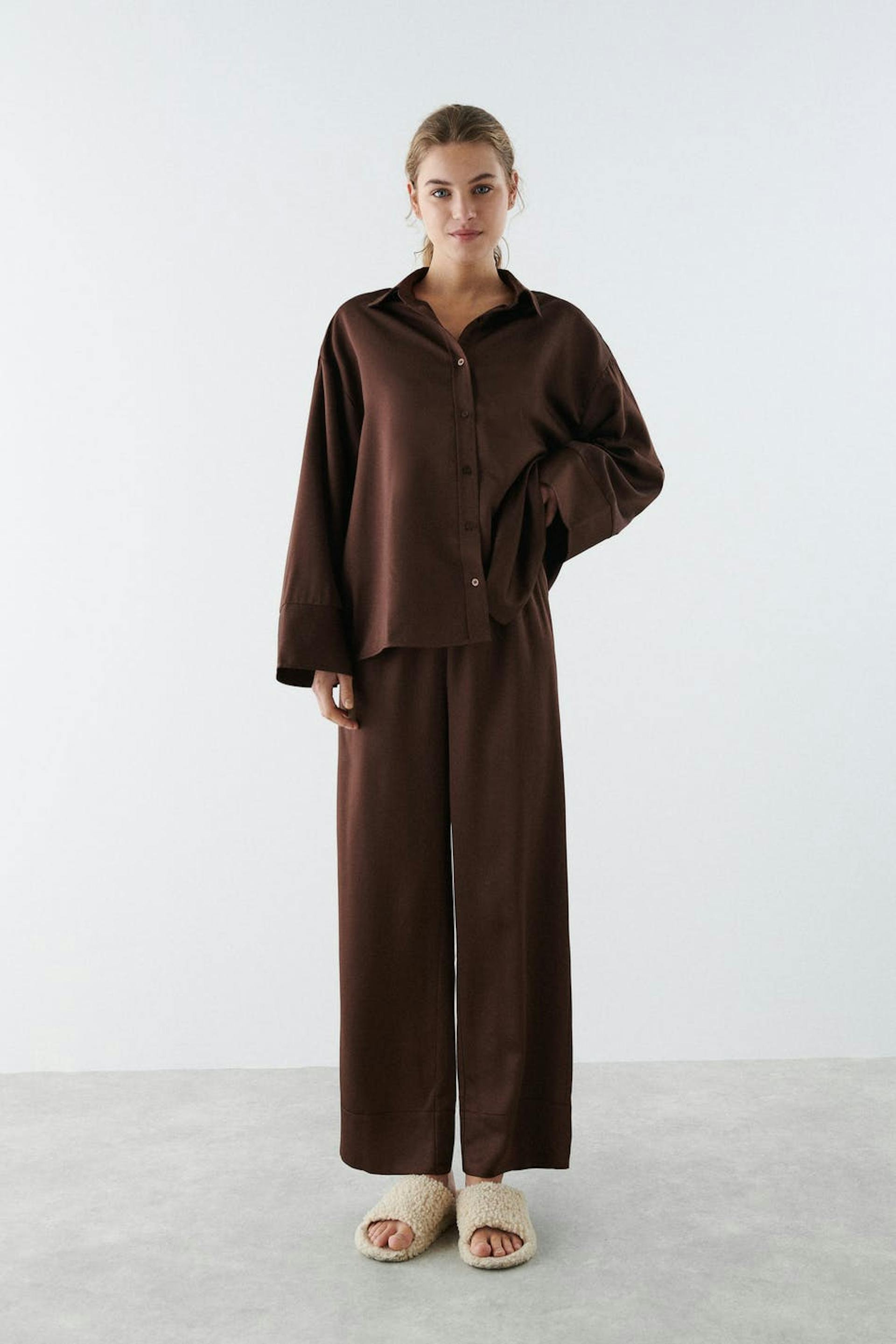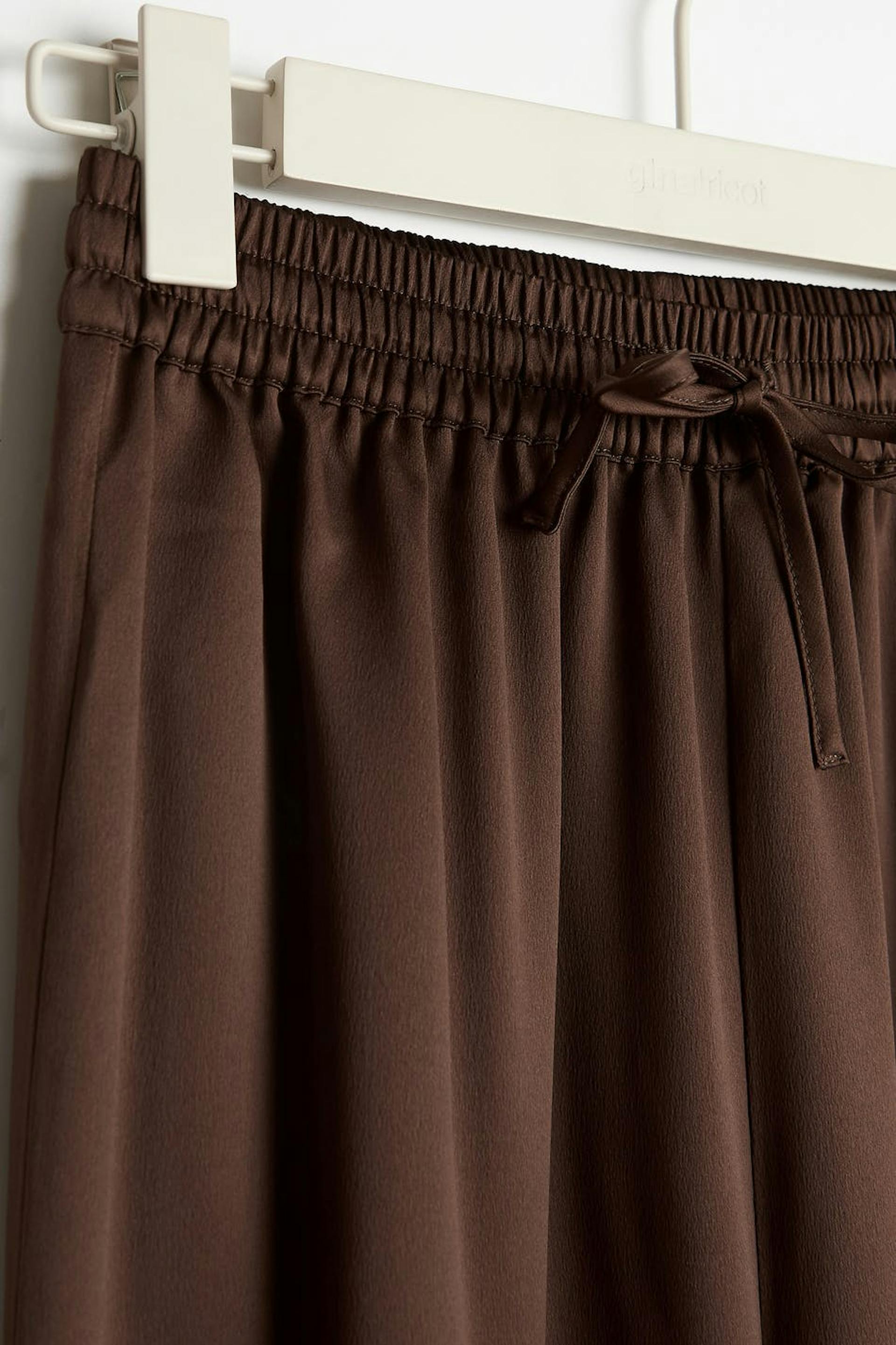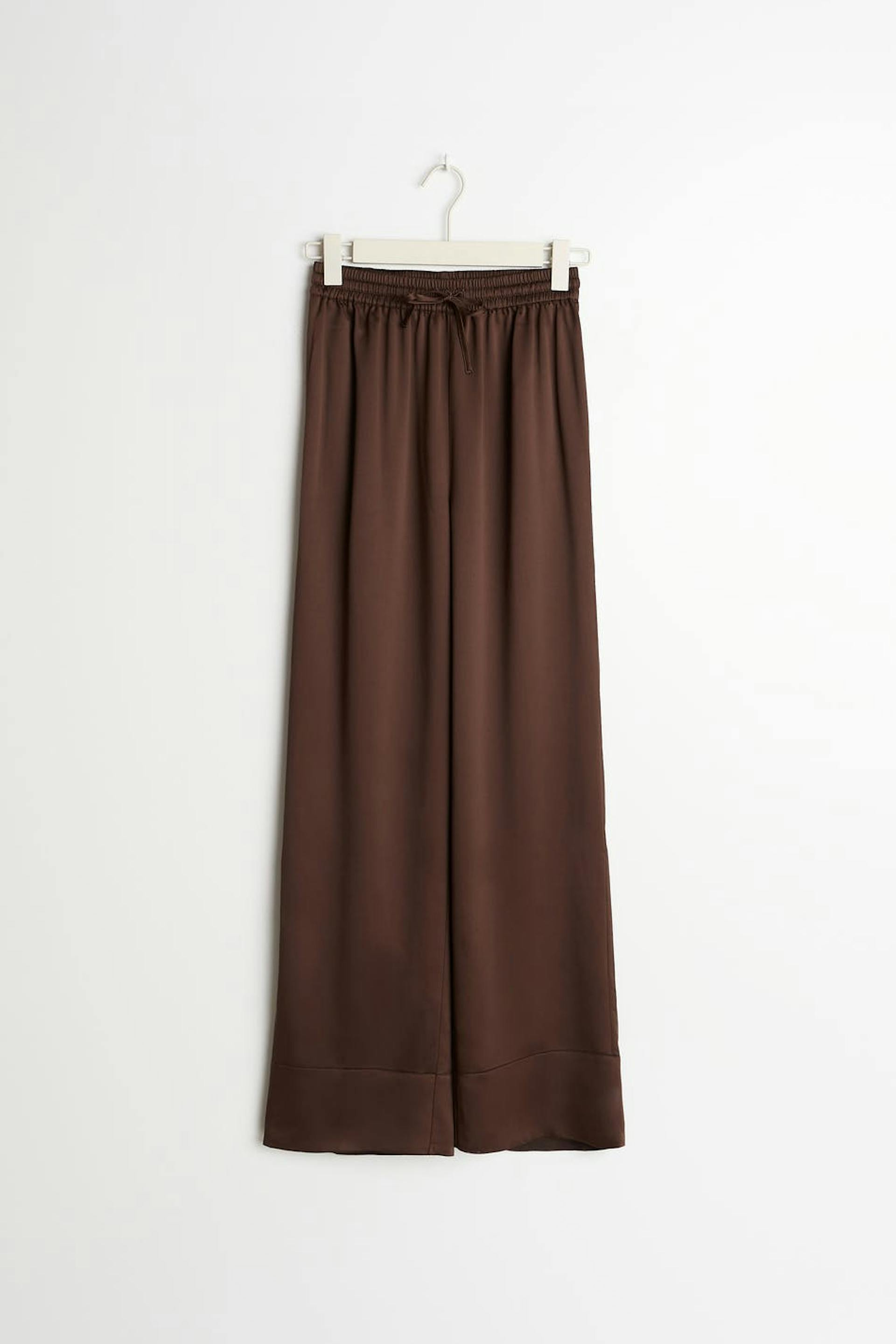 Oversizede pyjamasbukser med satinfølelse. Pyjamasbukserne er brune og har brede bukseben. De har en elastisk træksnørre ved taljen og høje manchetter ved enden af benene.
