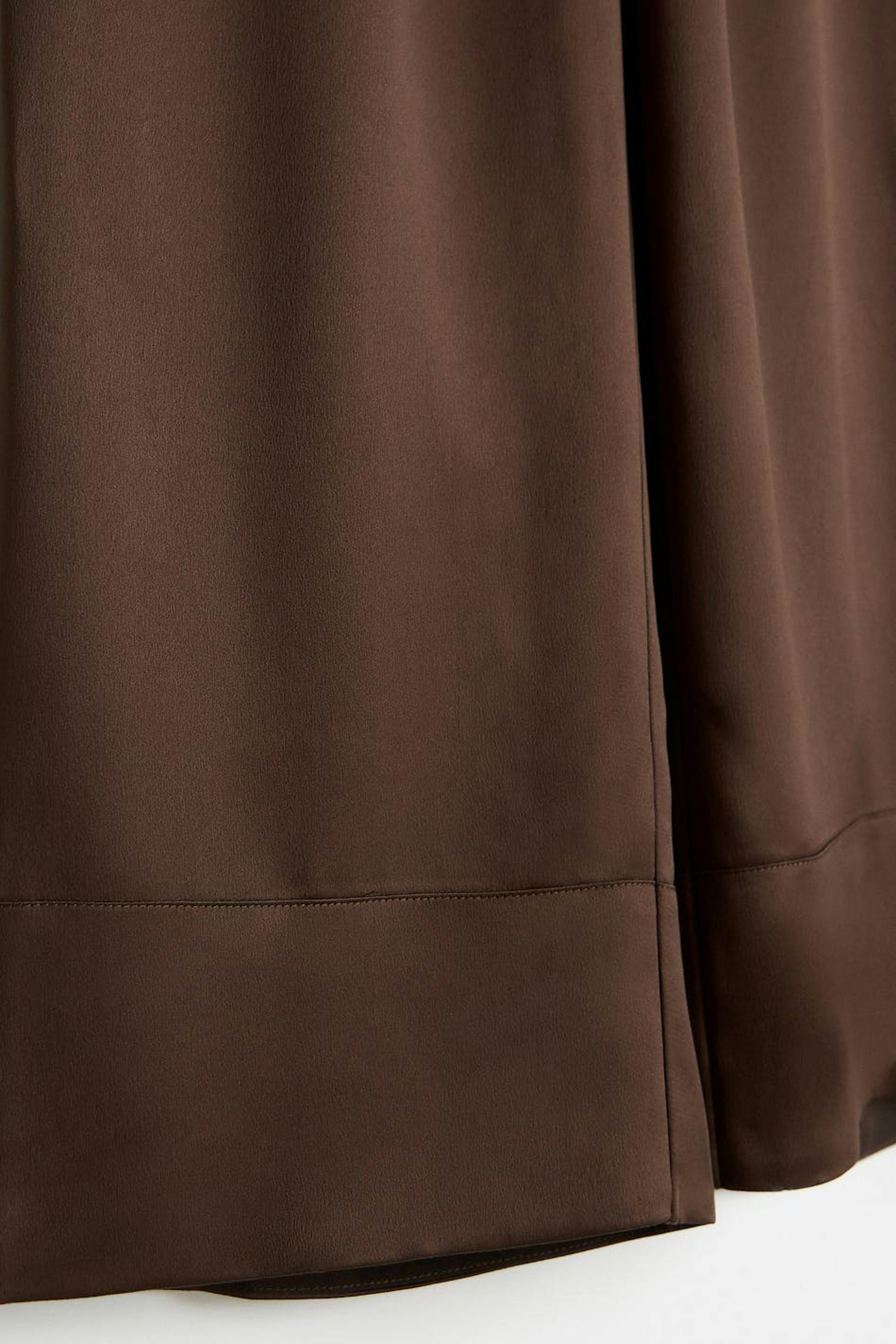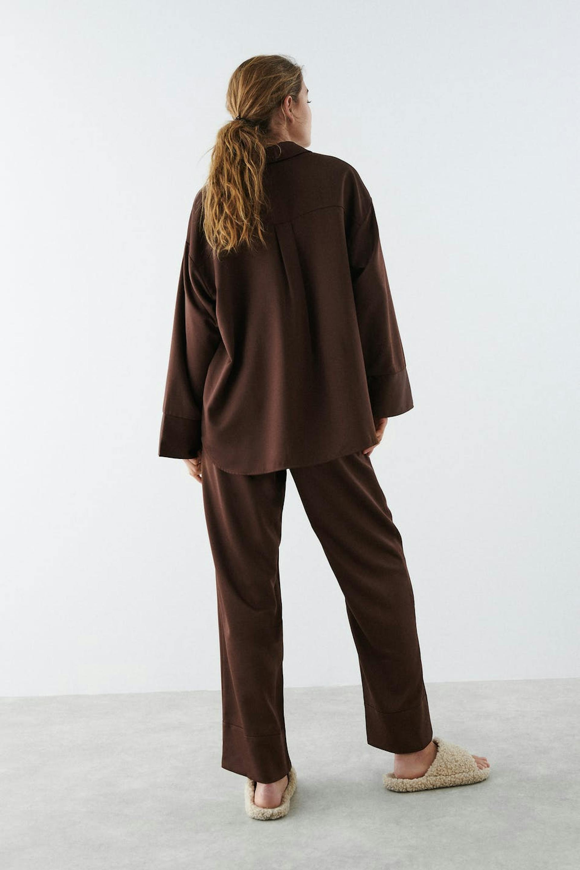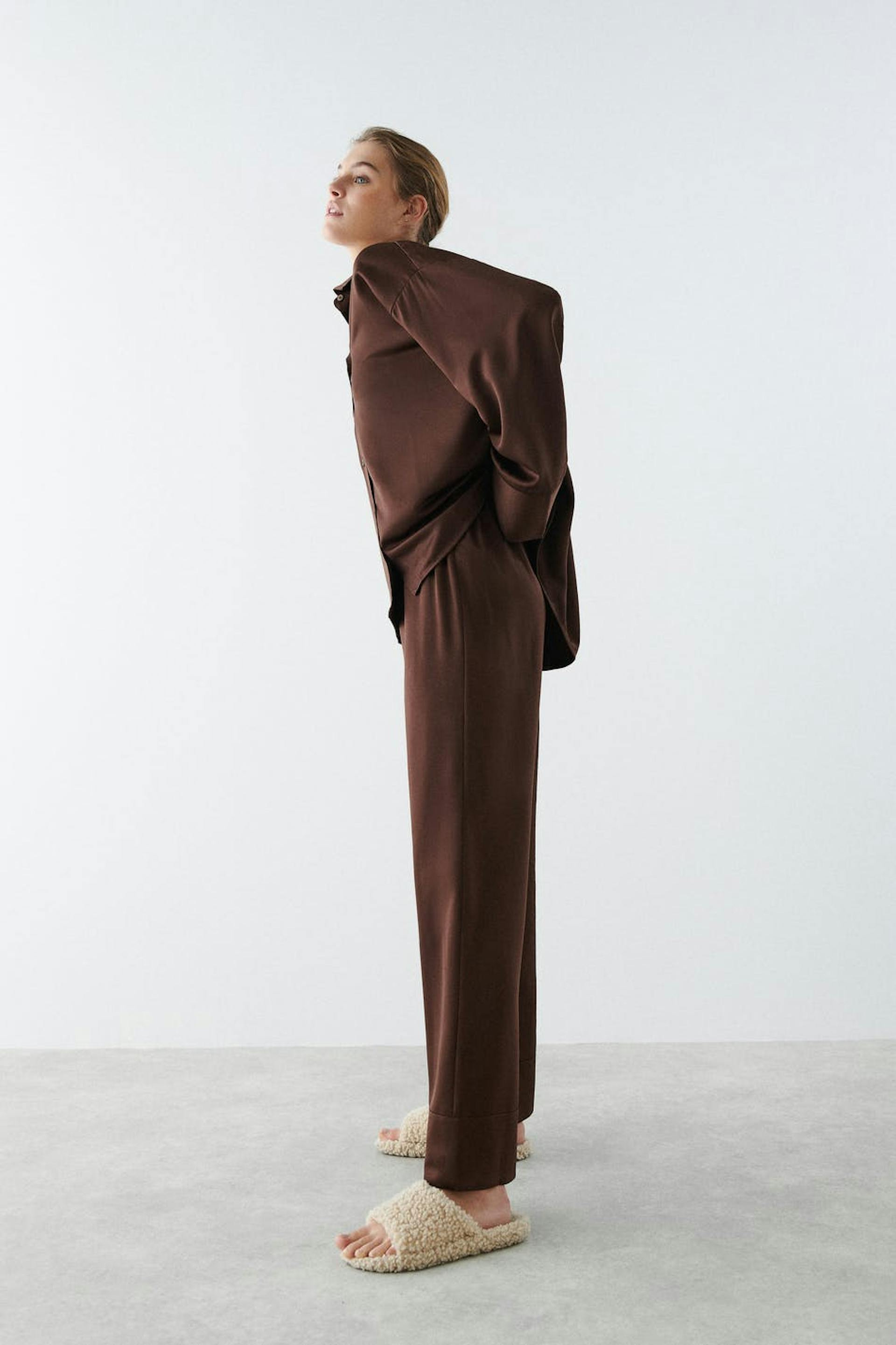 Oversizede pyjamasbukser med satinfølelse. Pyjamasbukserne er brune og har brede bukseben. De har en elastisk træksnørre ved taljen og høje manchetter ved enden af benene.
