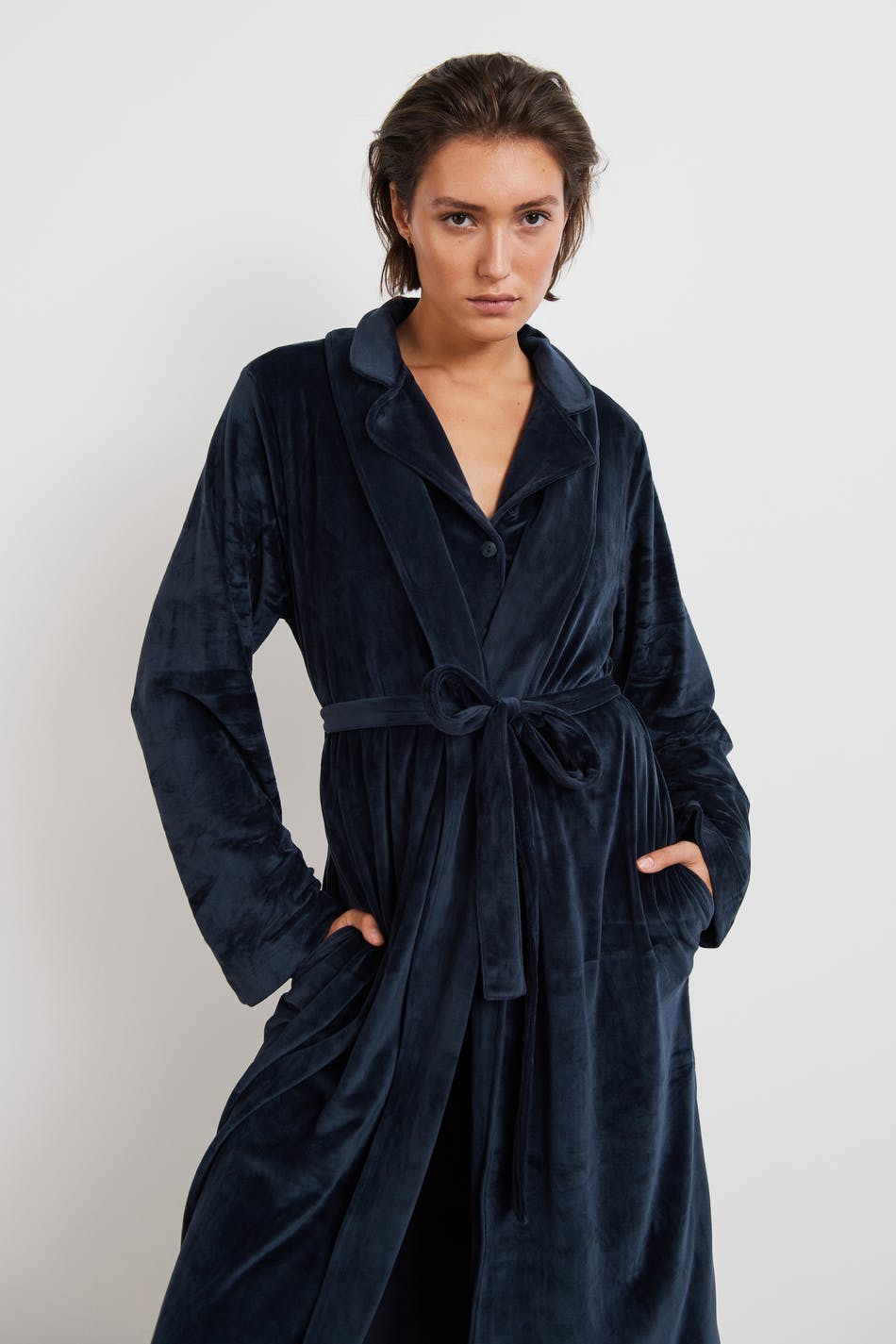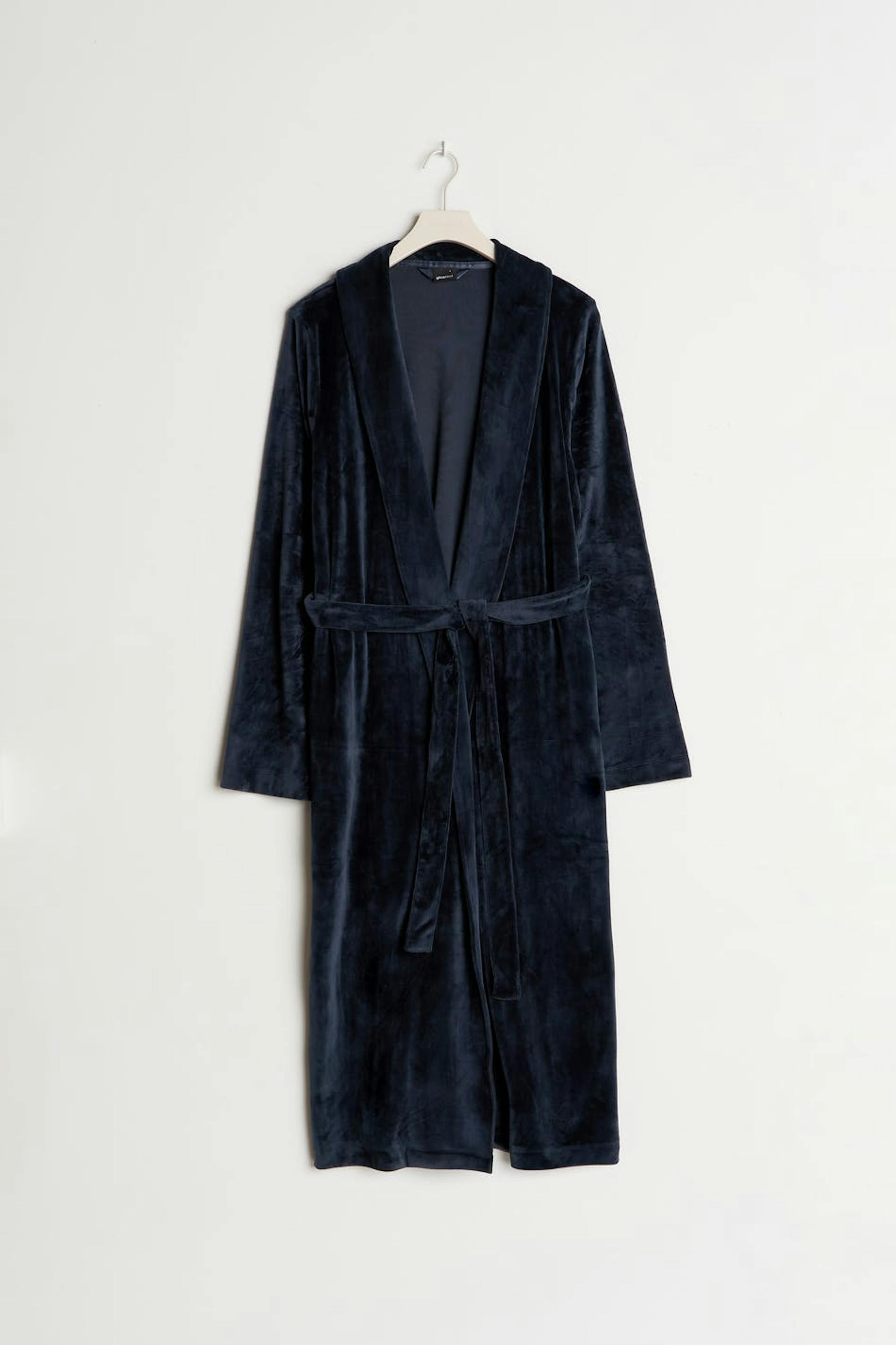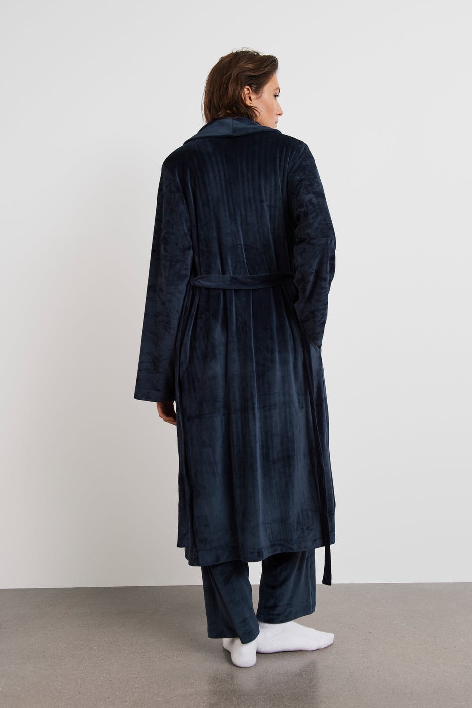 Velour morgenkåbe med et bindebælte ved taljen. Morgenkåben er marineblå og har en blød kvalitet. Holdes væk fra ild.