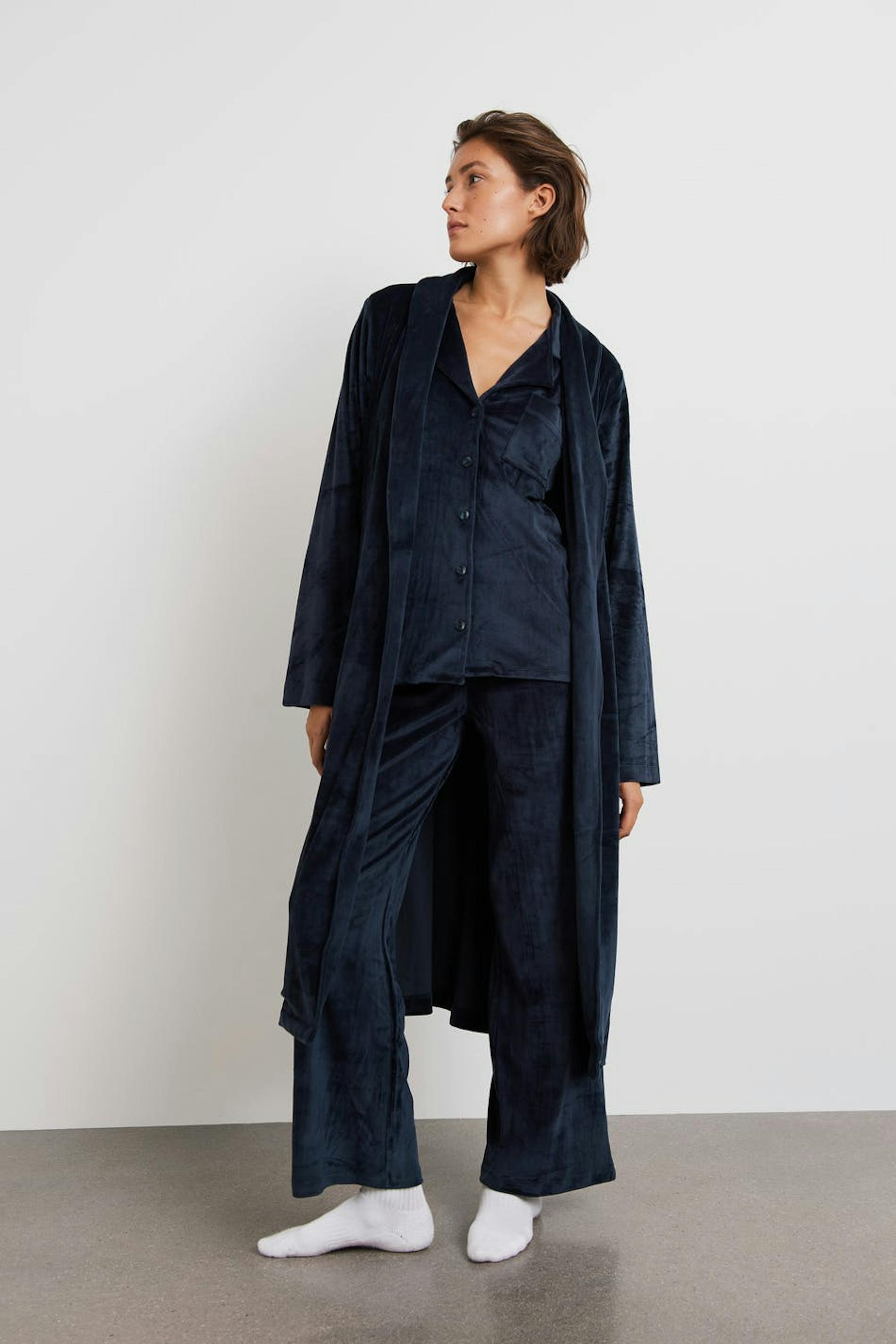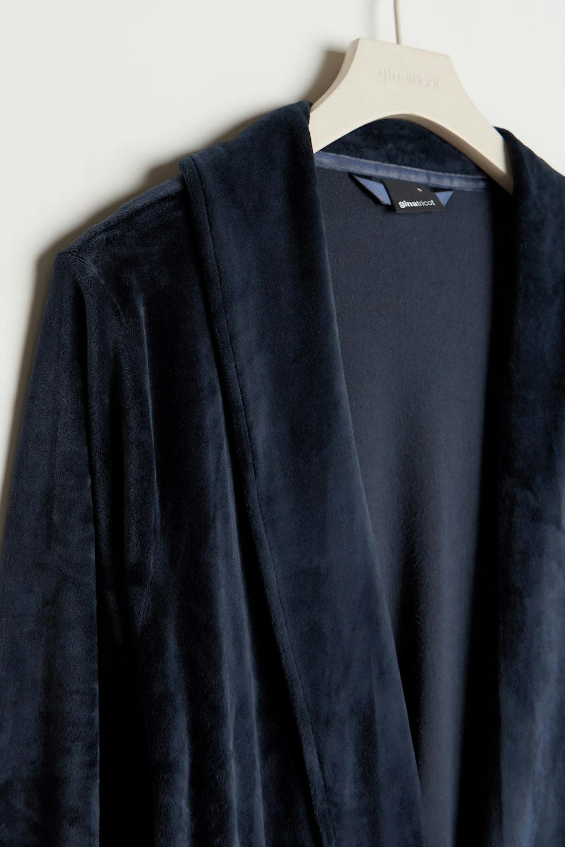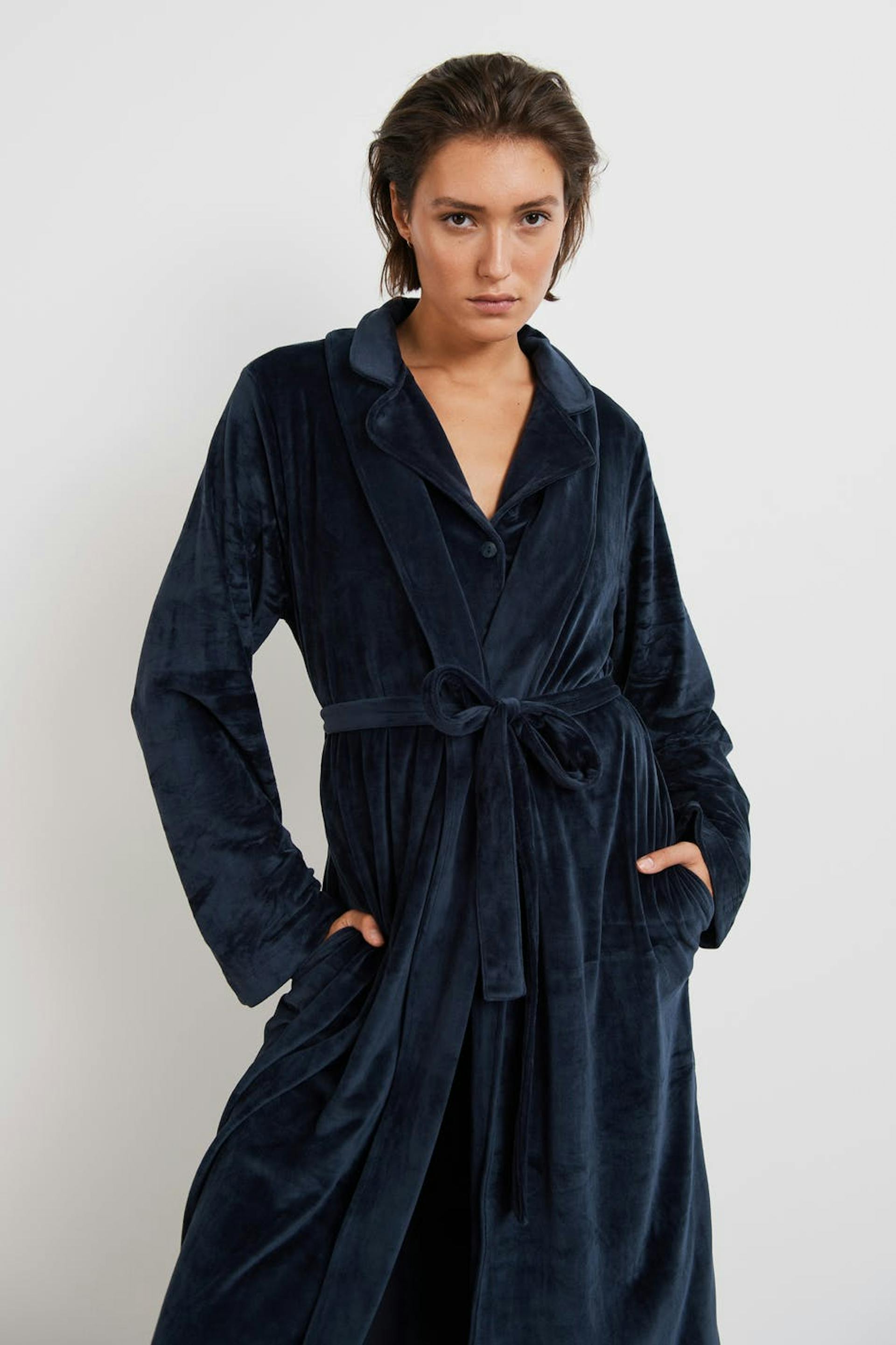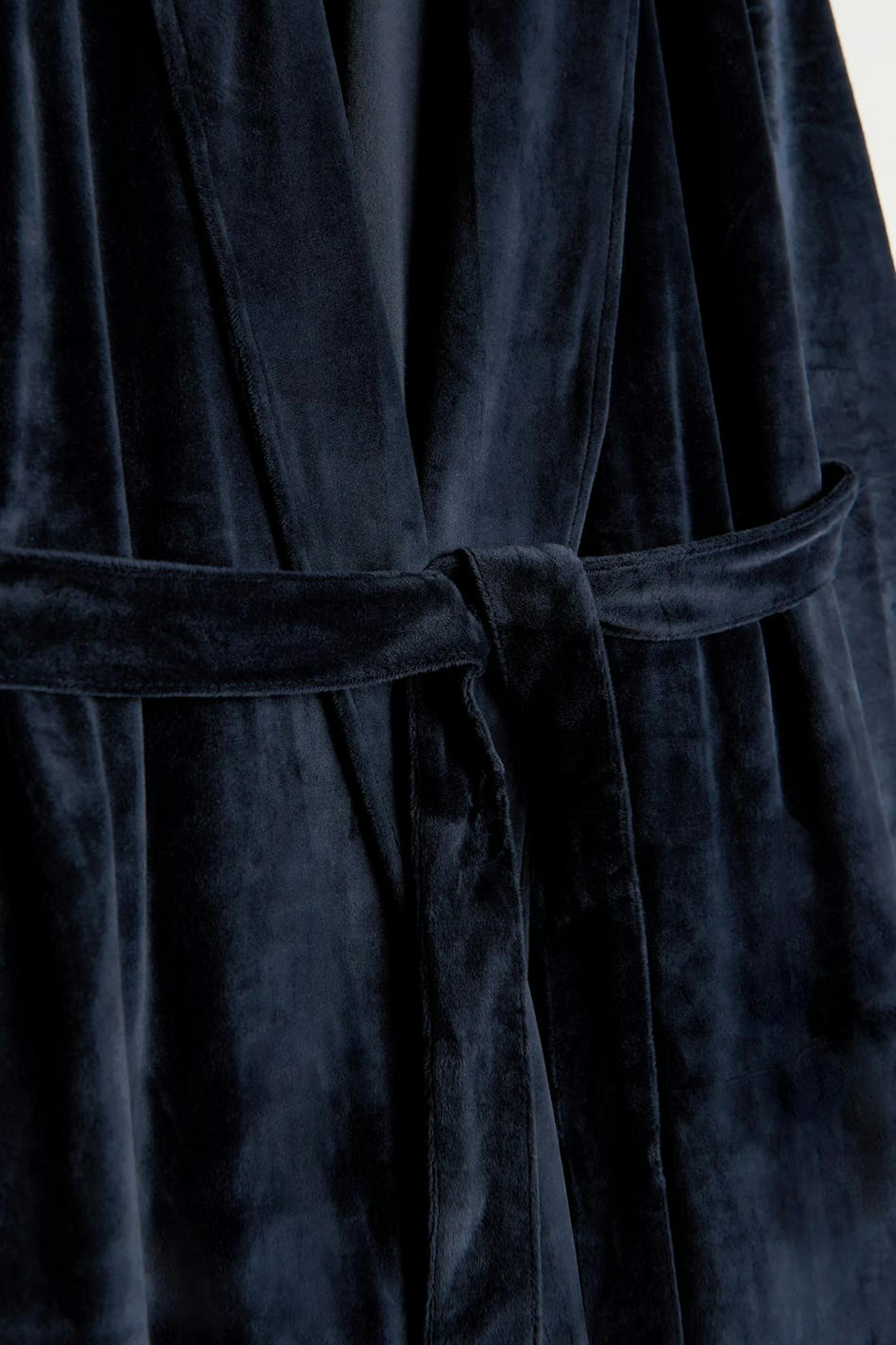 Velour morgenkåbe med et bindebælte ved taljen. Morgenkåben er marineblå og har en blød kvalitet. Holdes væk fra ild.