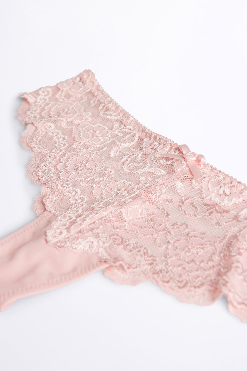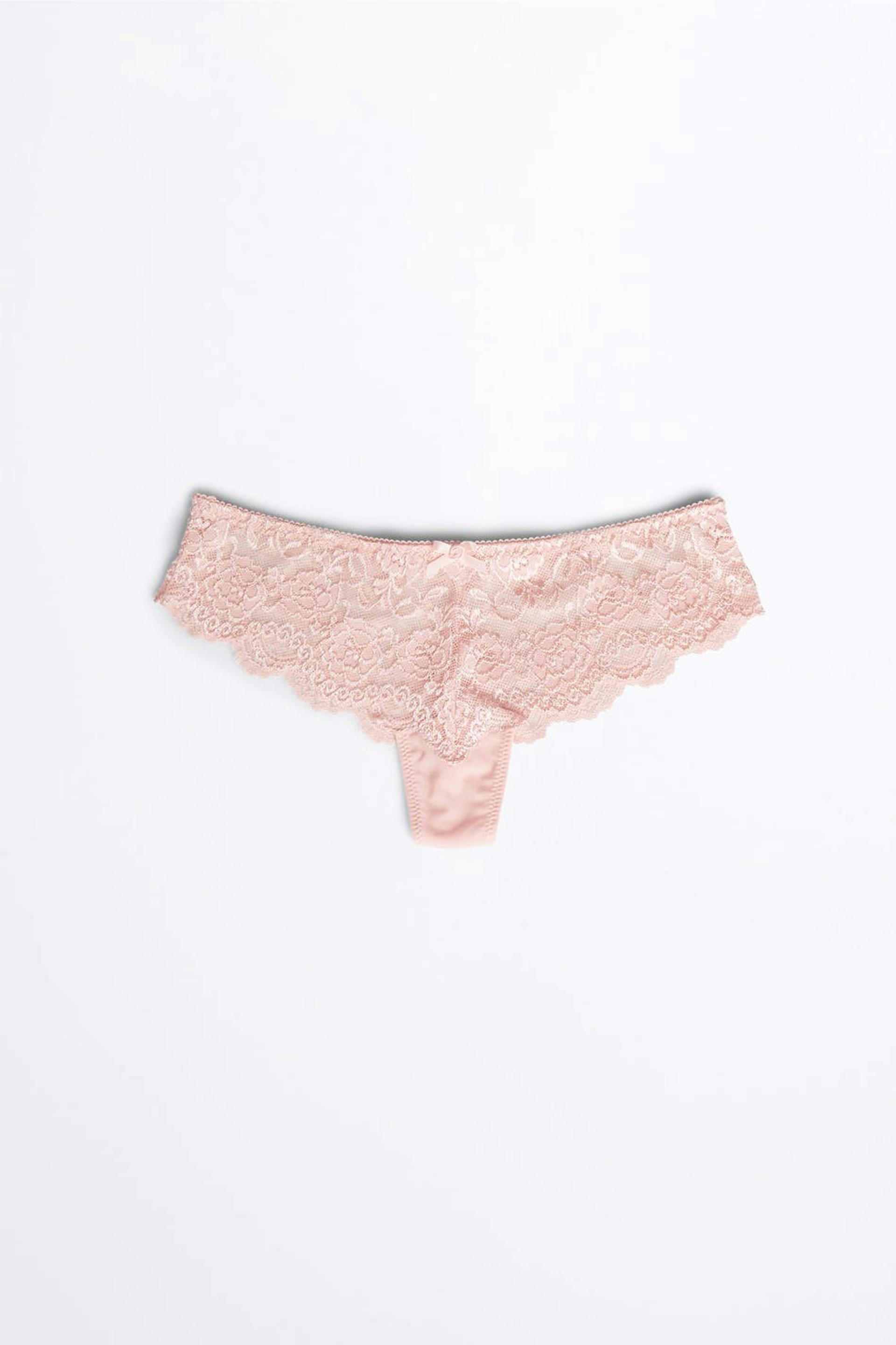 Stringtrusse med et for i bomuld mellem benene. Stringtrussen er lyserød. Den er fremstillet af blonde.