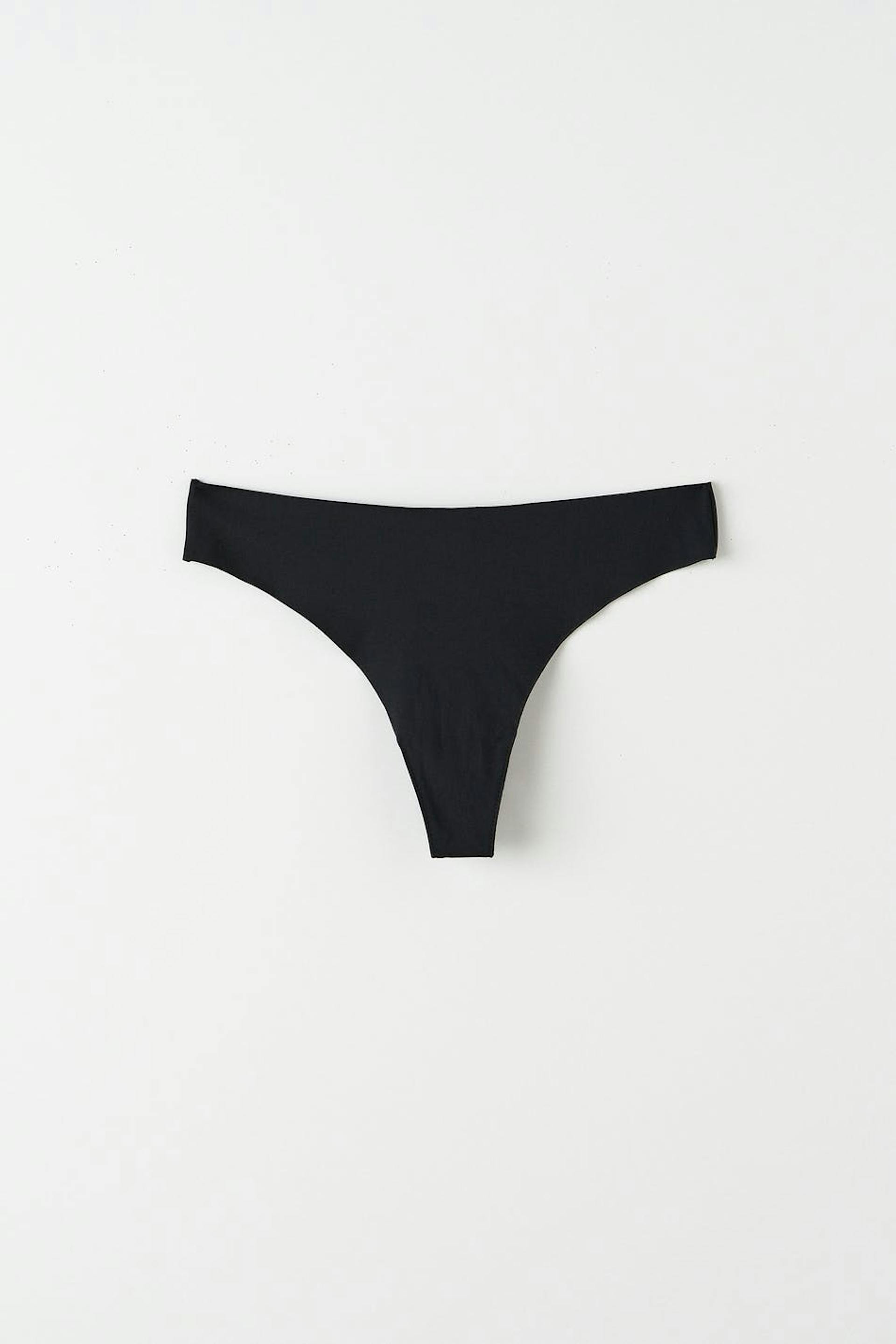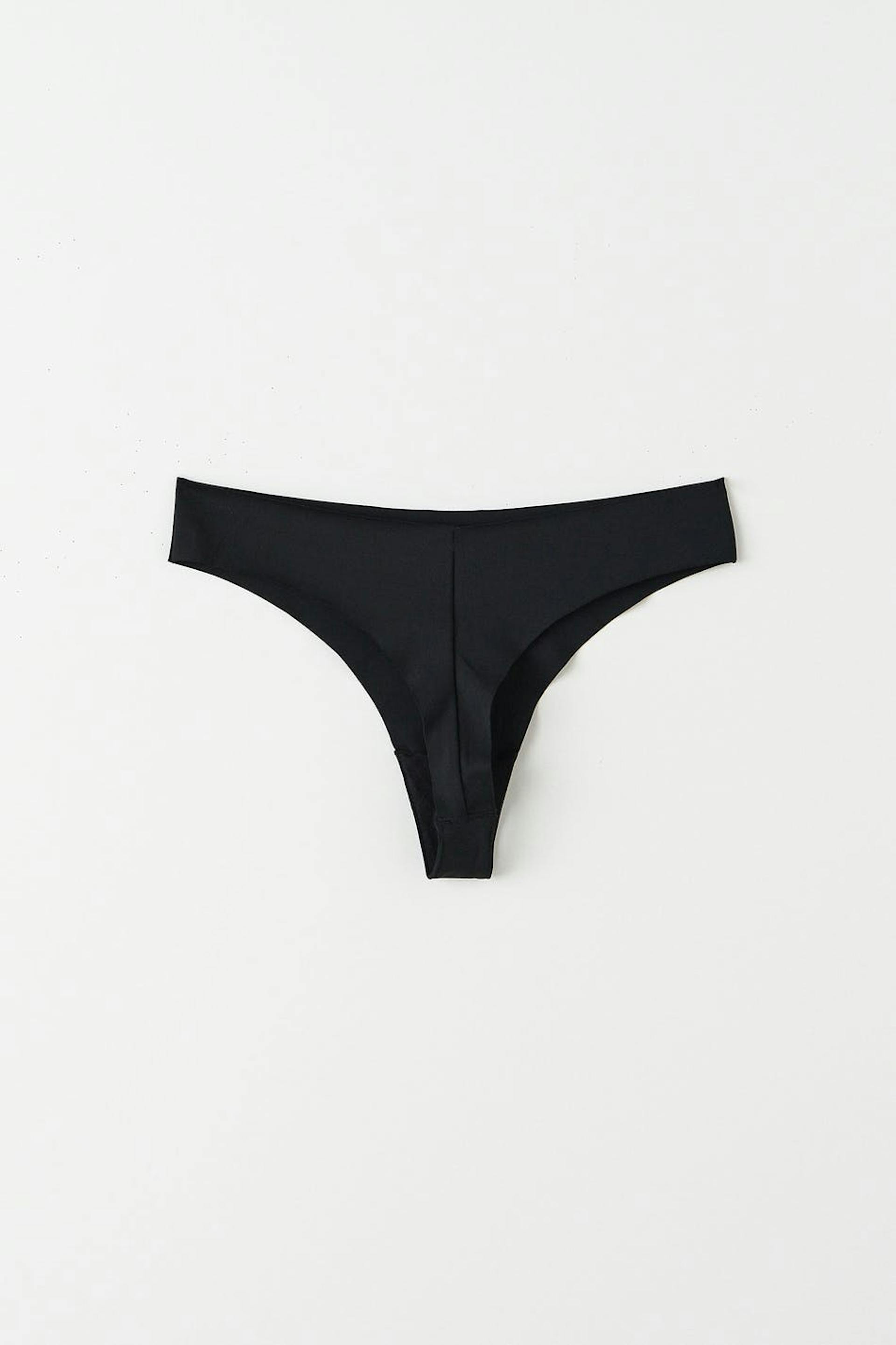 Stringtrusser med et for i bomuld mellem benene. Stringtrusserne er sorte. De er fremstillet af mikrofiber.
