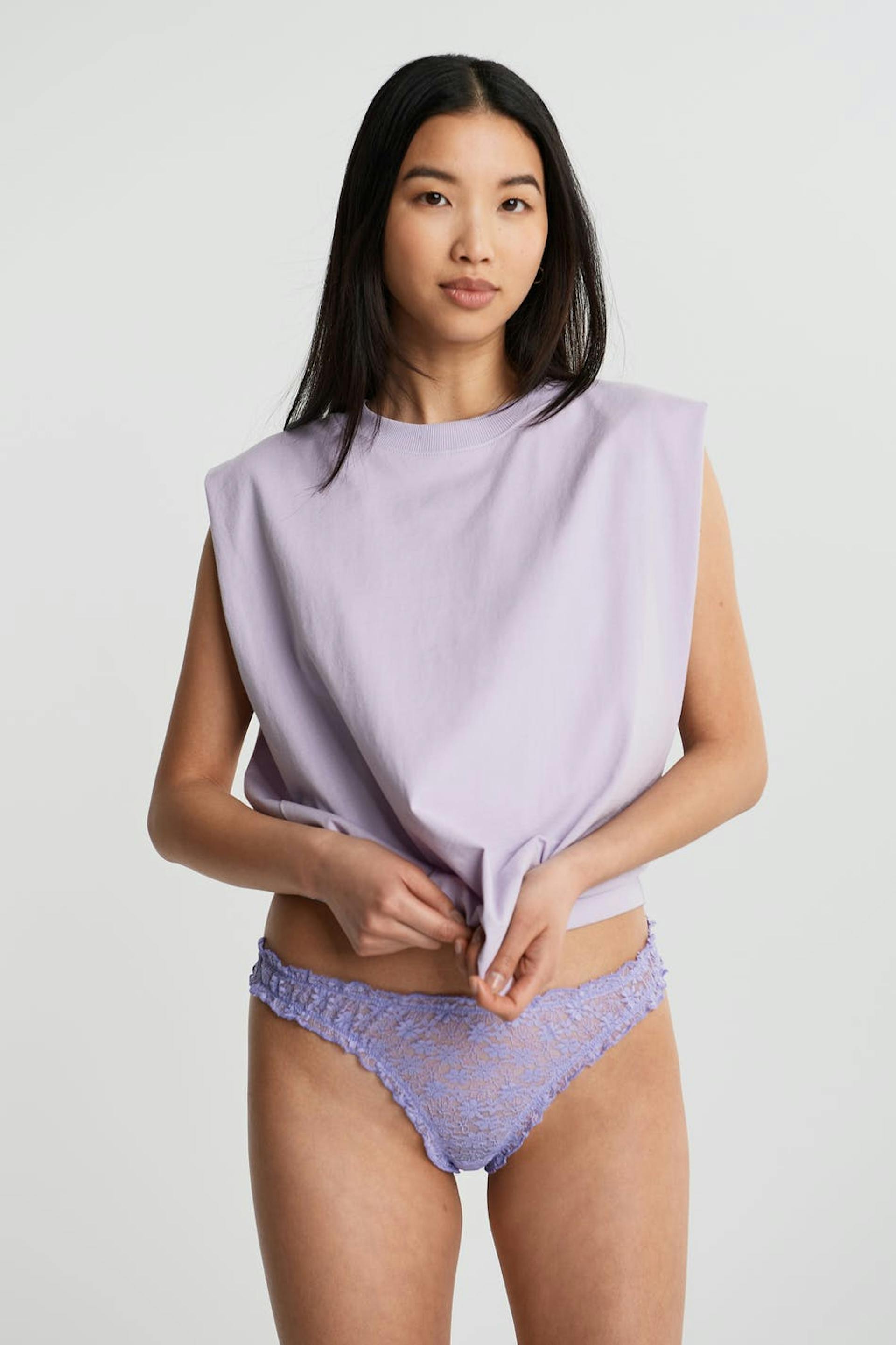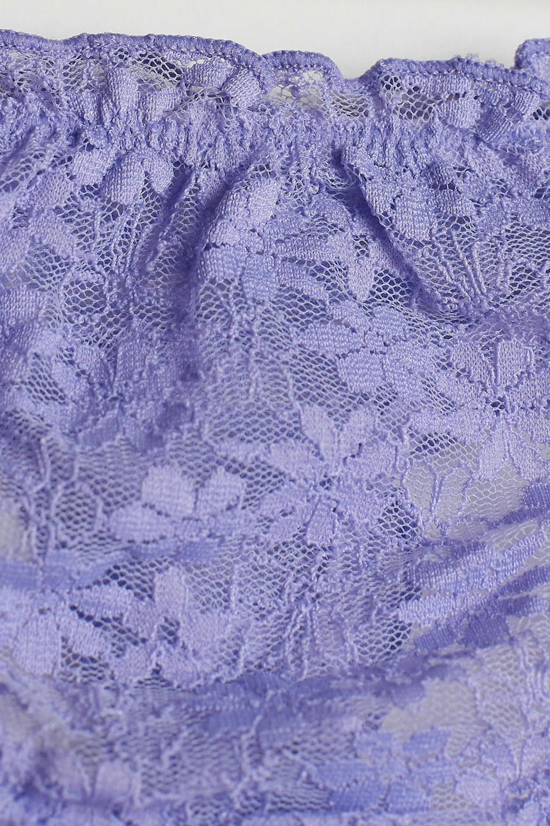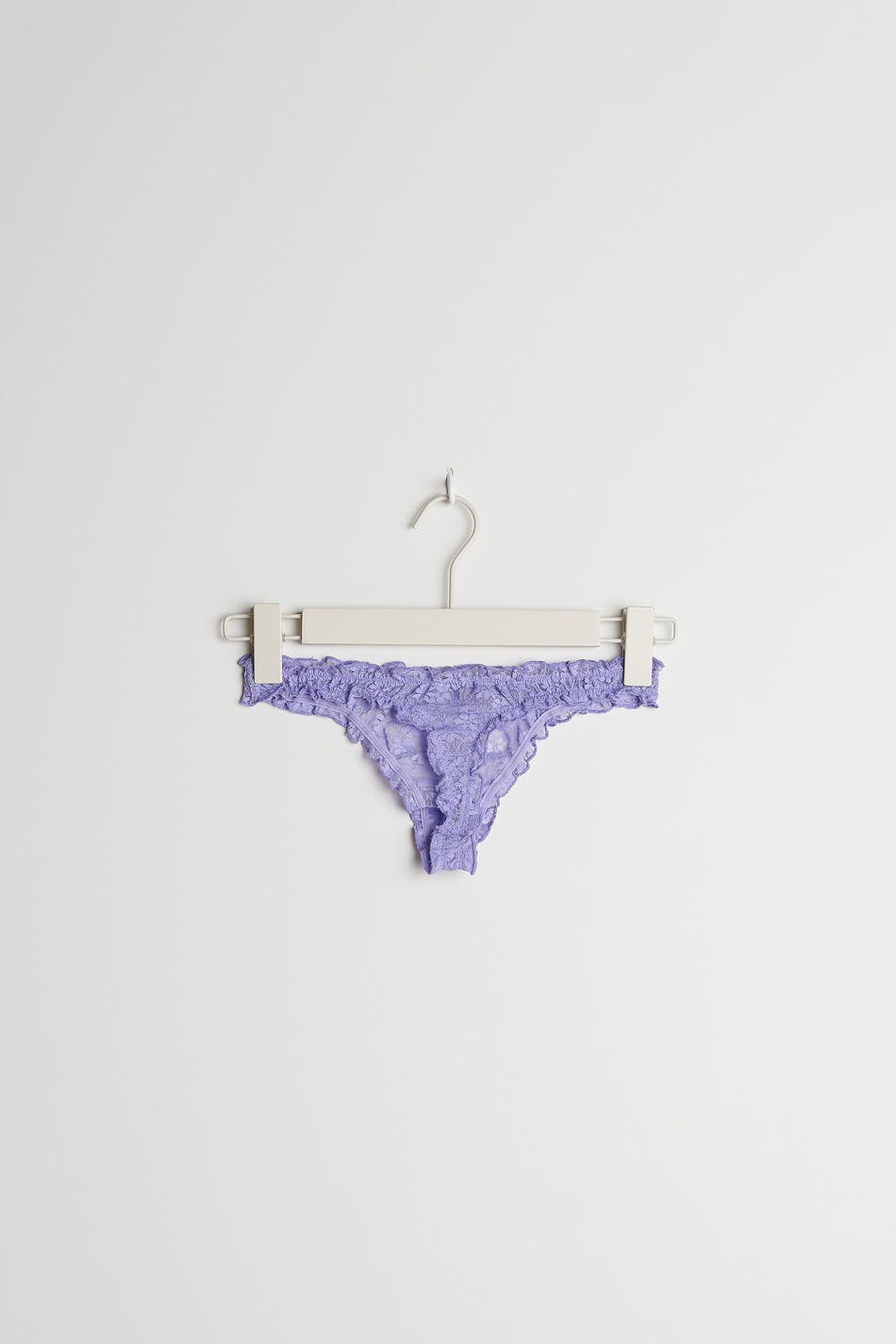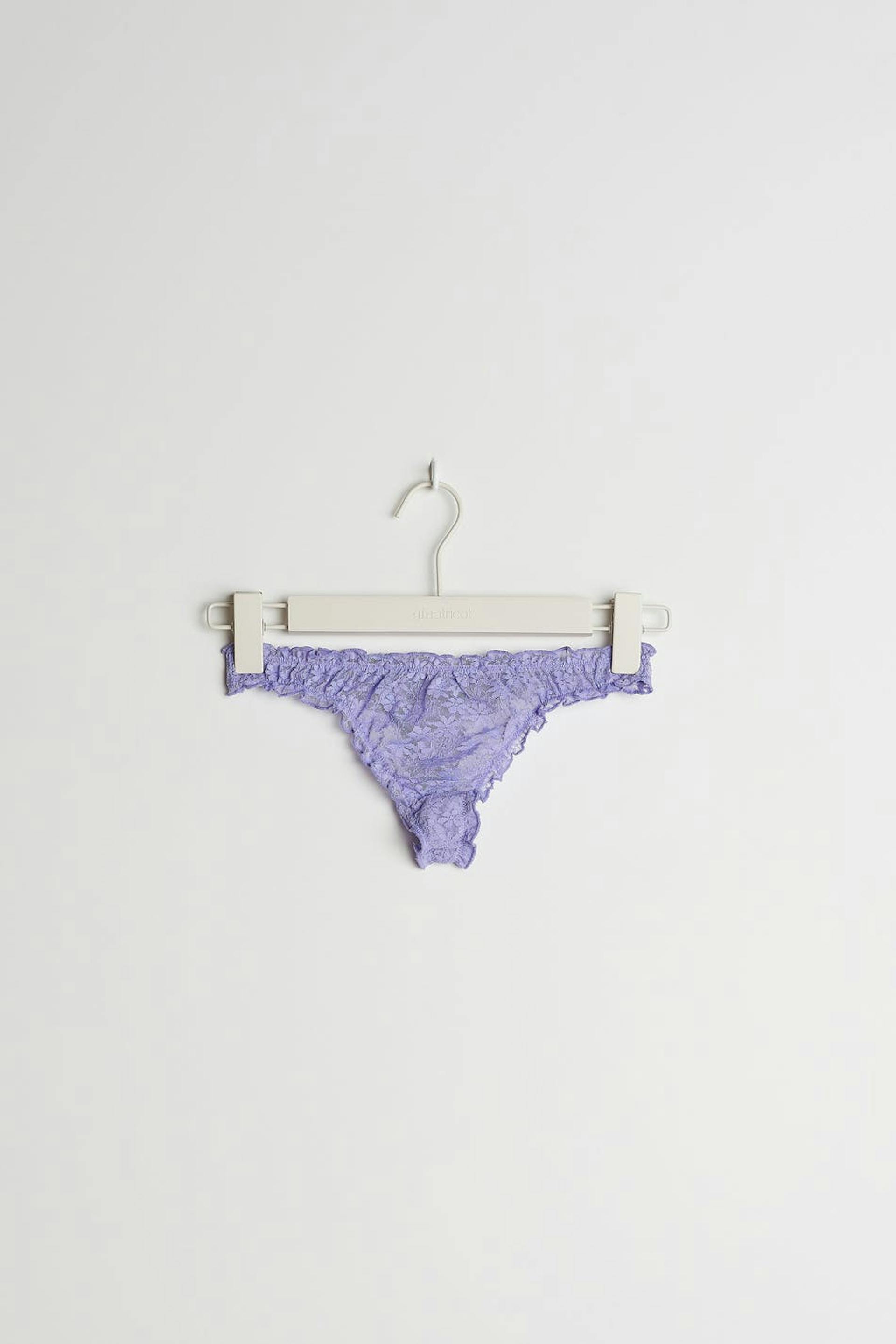 Trusse med volanter på kanten. Trussen er lilla og har et for i bomuld mellem benene. Den er fremstillet af blonde.