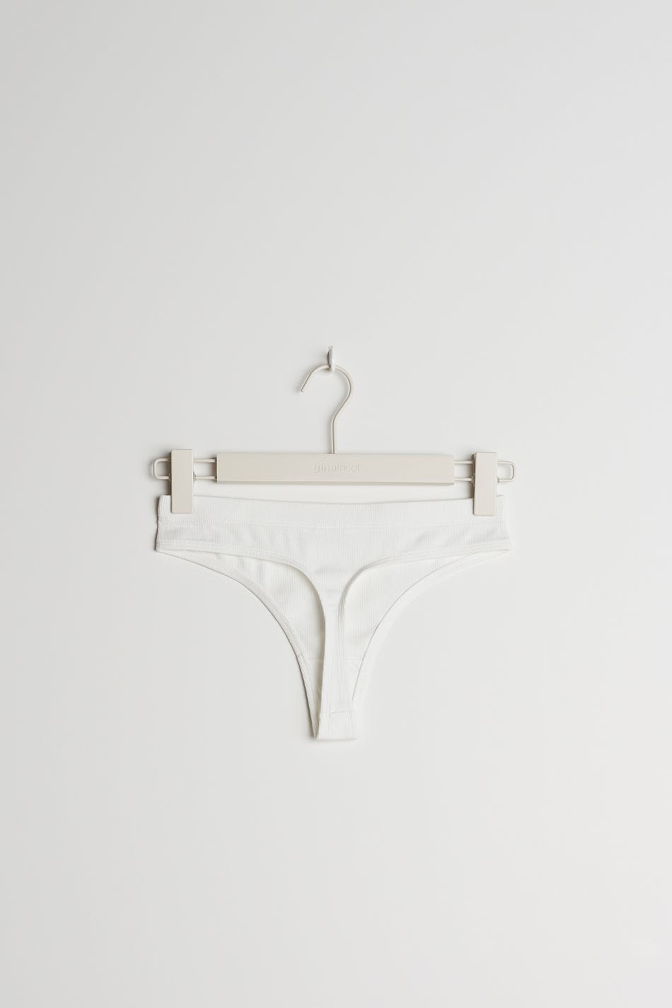 Bløde stringtrusser. Stringtrusserne er hvide og ribbede.