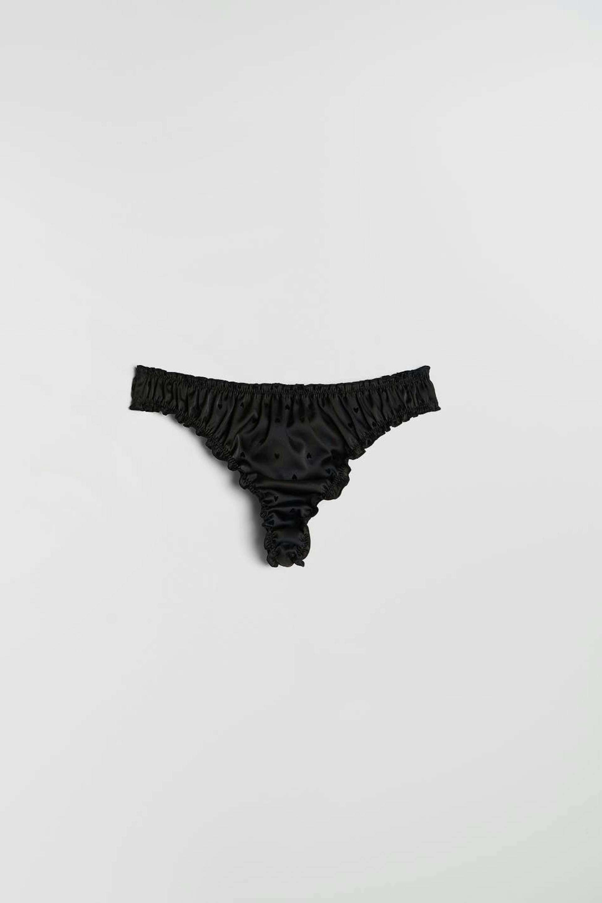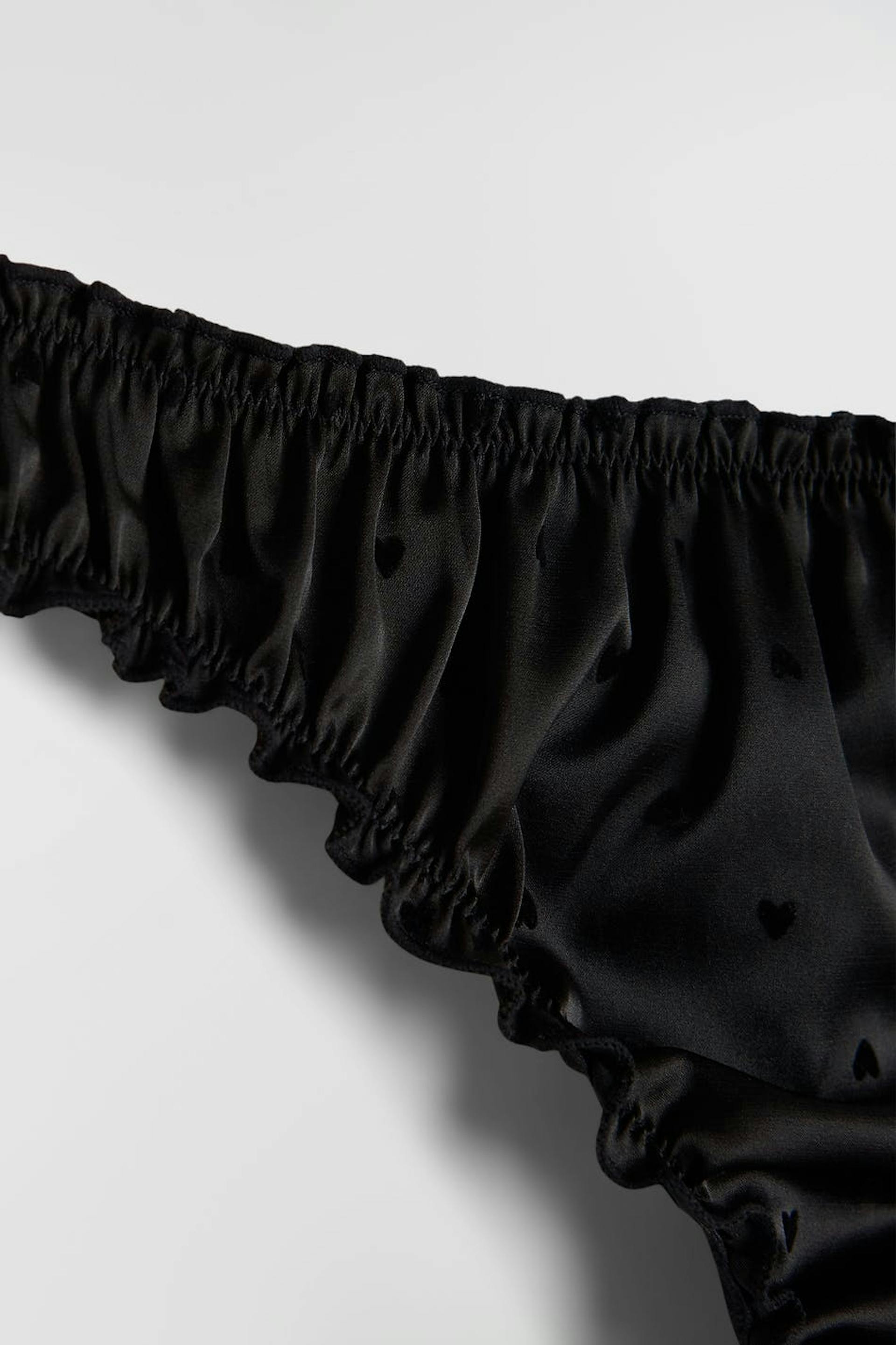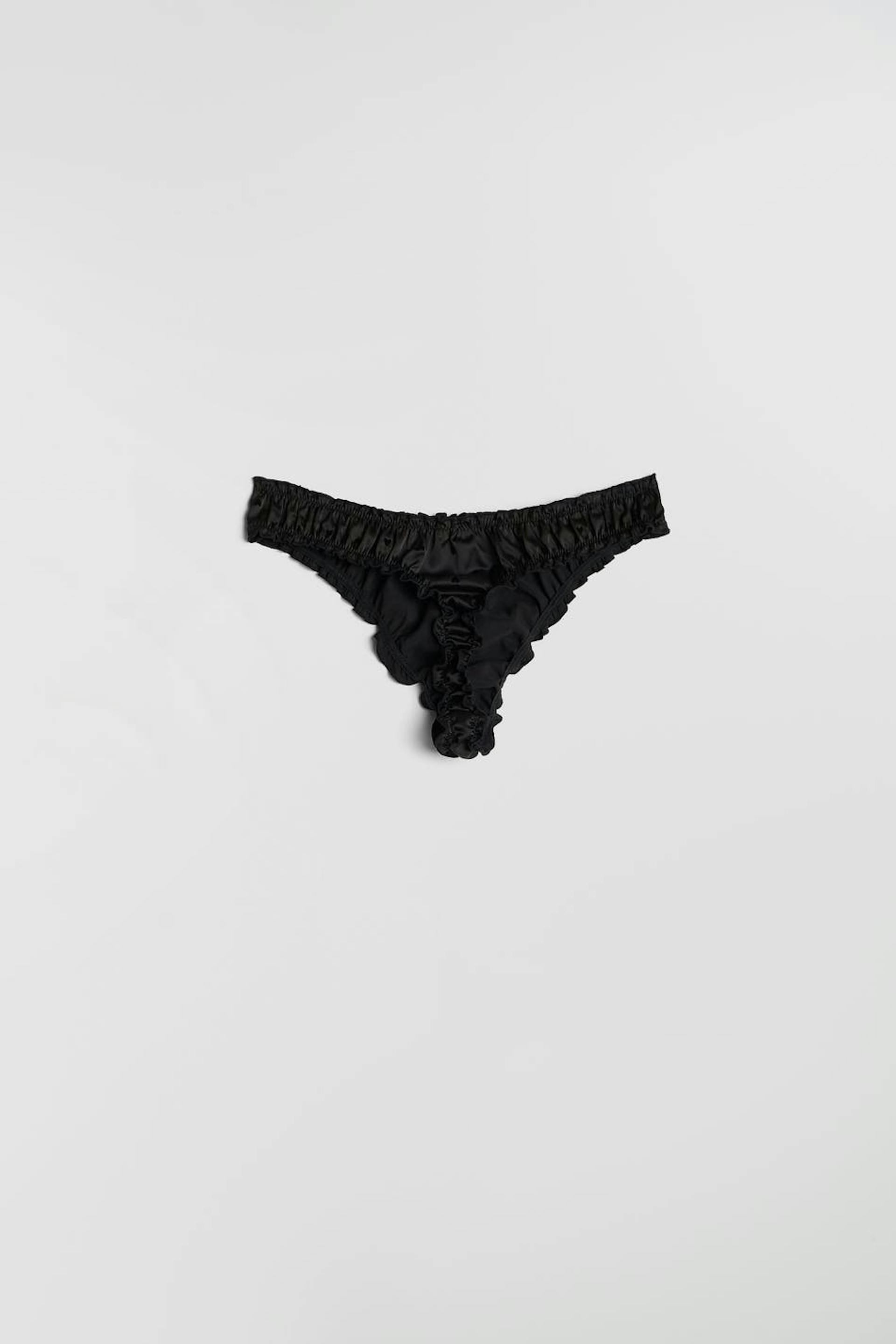 Satin string with frills at all openings. Cotton lining at crotch. Supplier: Crown-Max (H.K.) Ltd Production unit: Huizhou Jiaye Garment Co Ltd