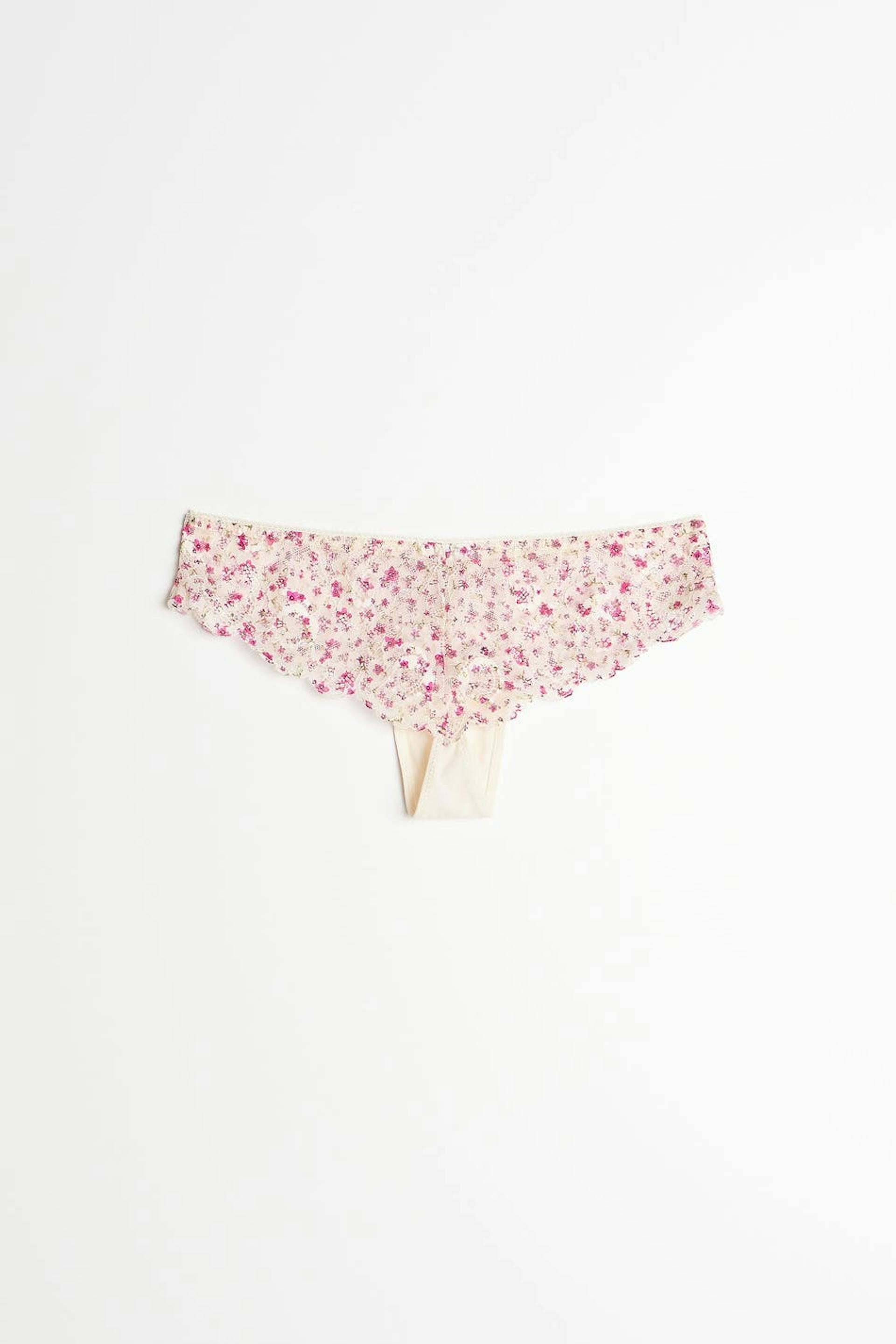 Stringtrusser med en blonde og foret skridt. Stringtrusserne er pink og har et blomstret mønster.