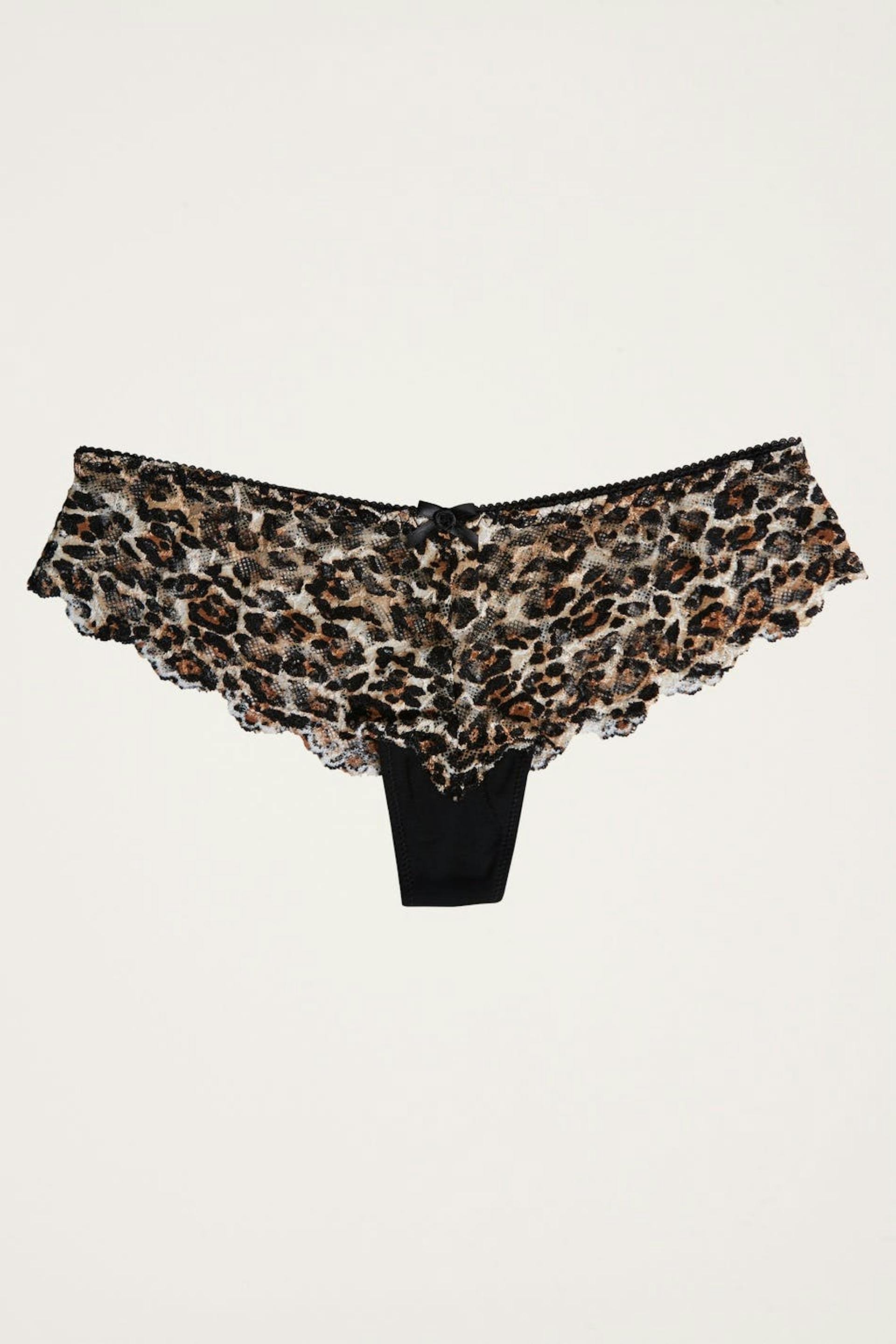 Stringtrusse med en dekorativ sløjfe ved fronten. Stringtrussen er leopard. Den er fremstillet af blonde.