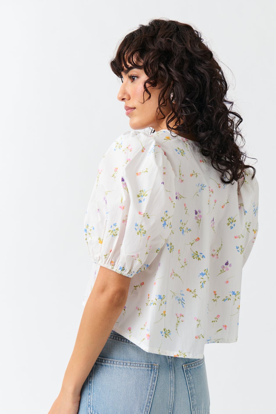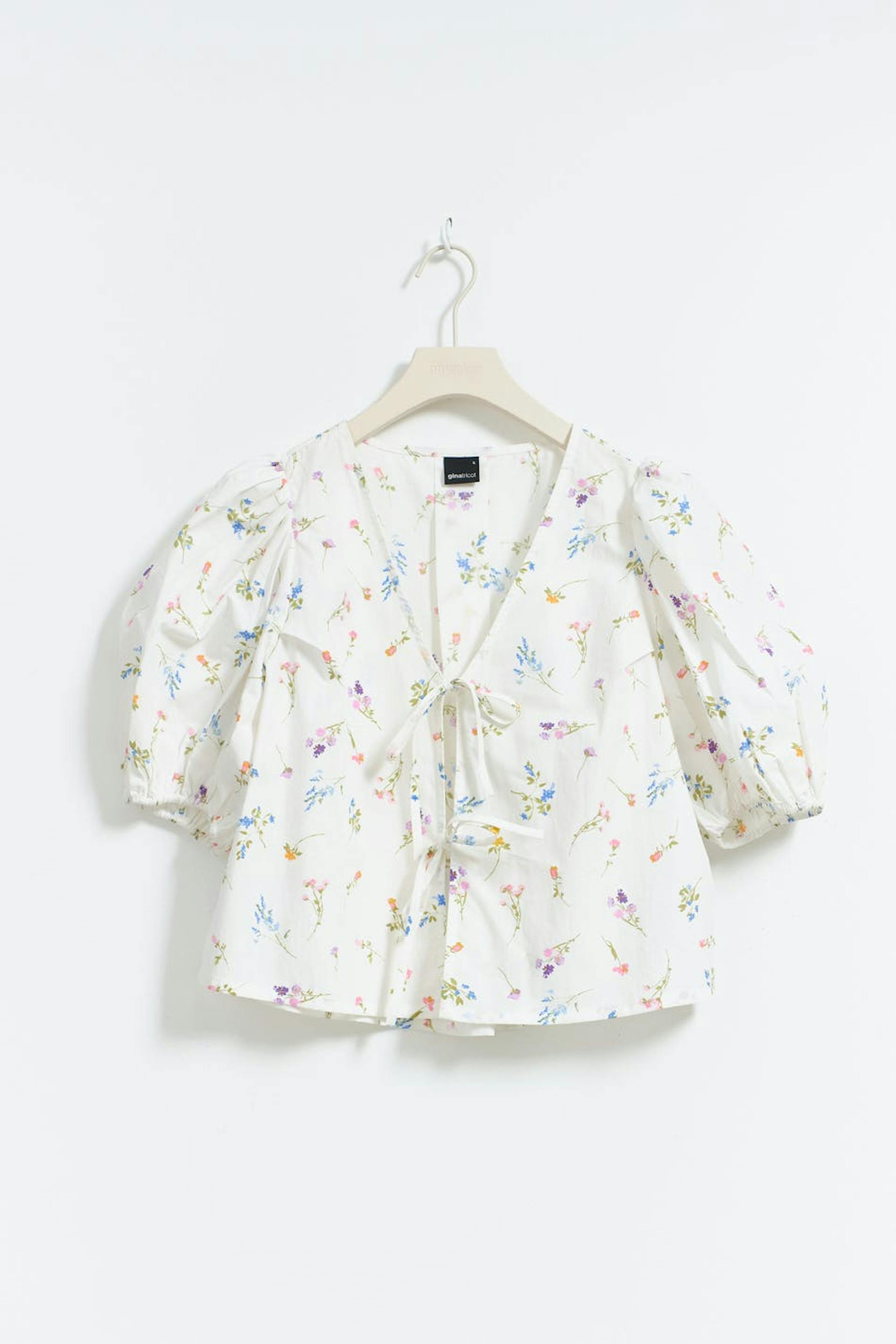 Blomstret bluse med kort pufærmer. Blusen er hvid, grøn og blå. Den har knudelukning ved fronten, v-udskæring og croppet længde.