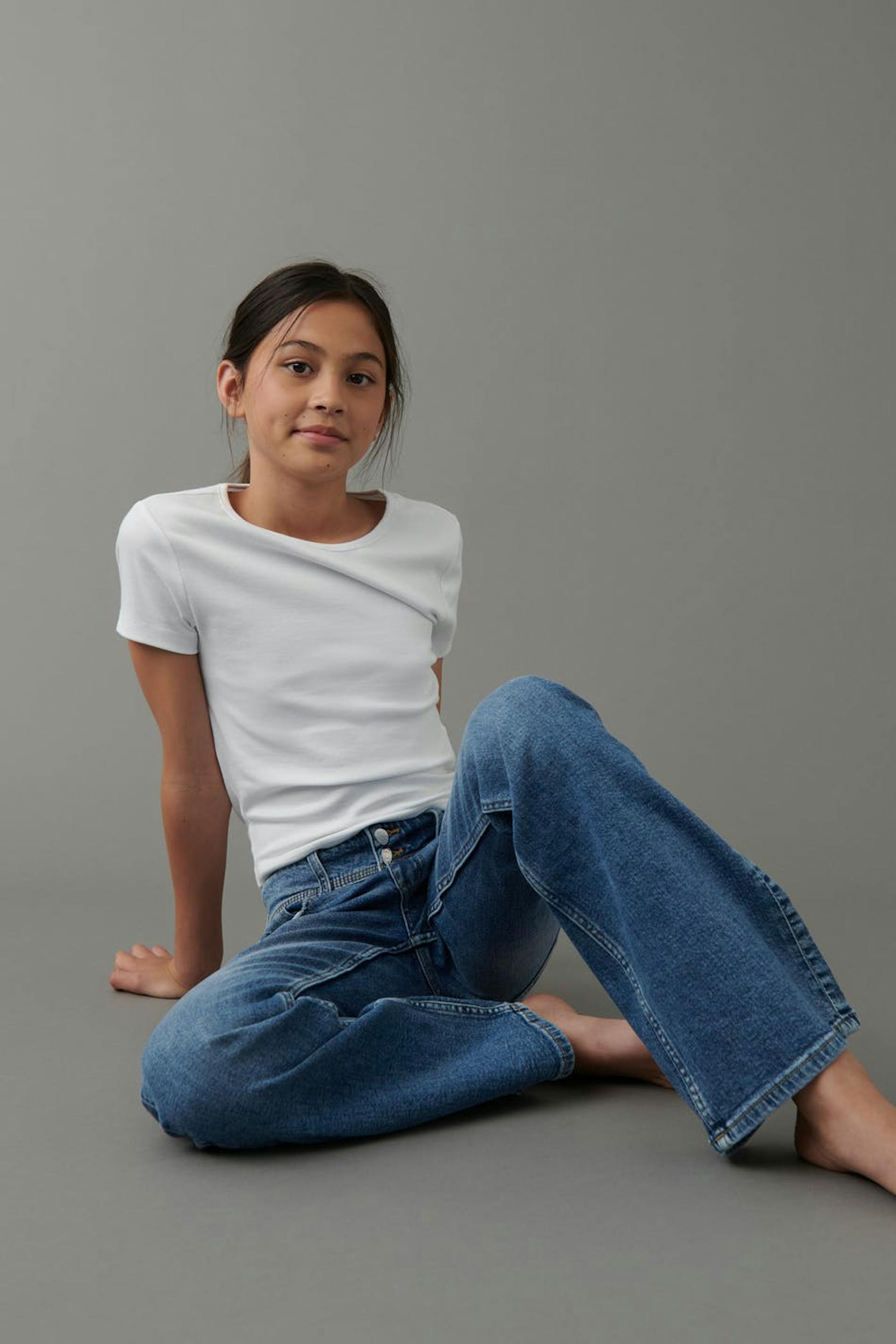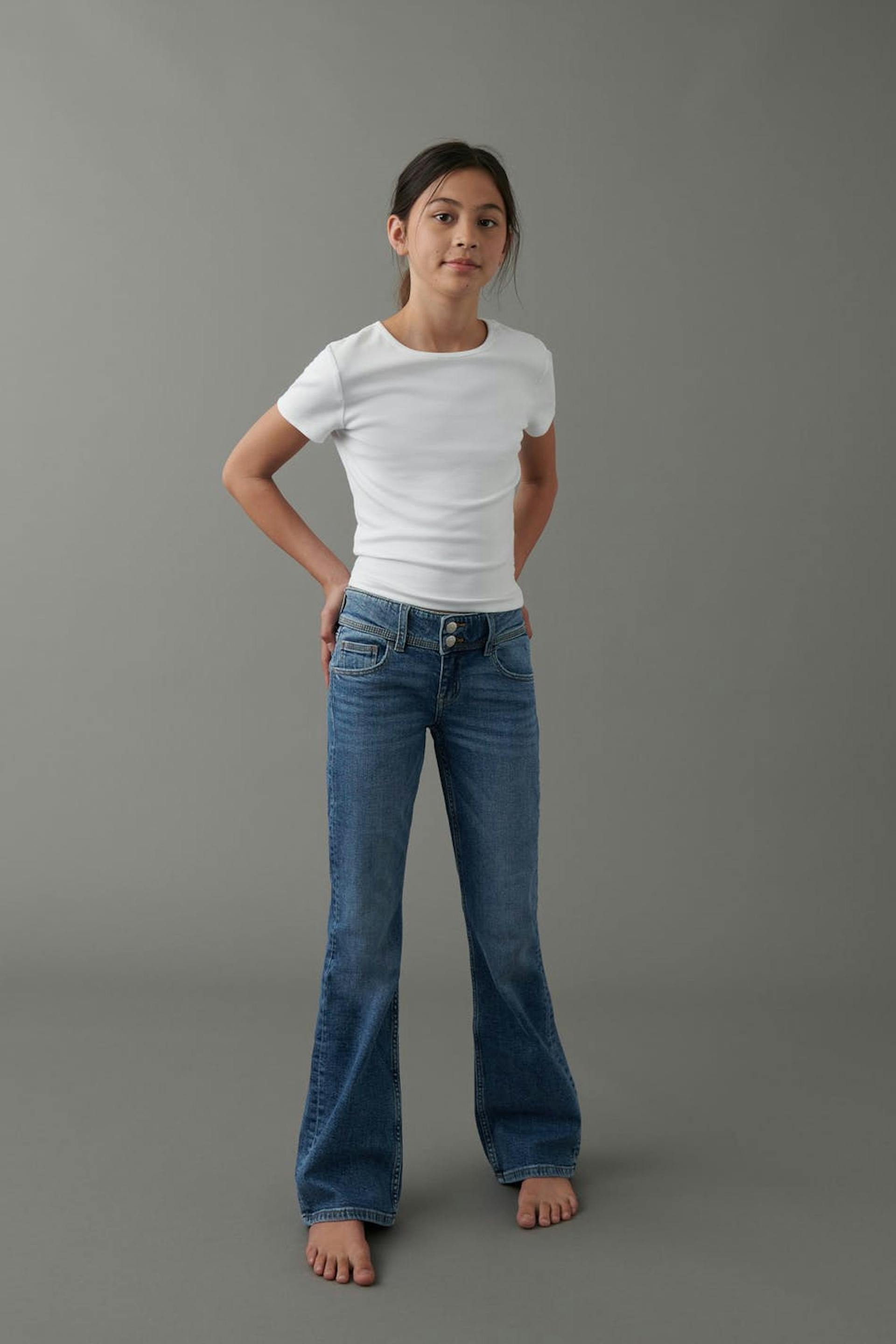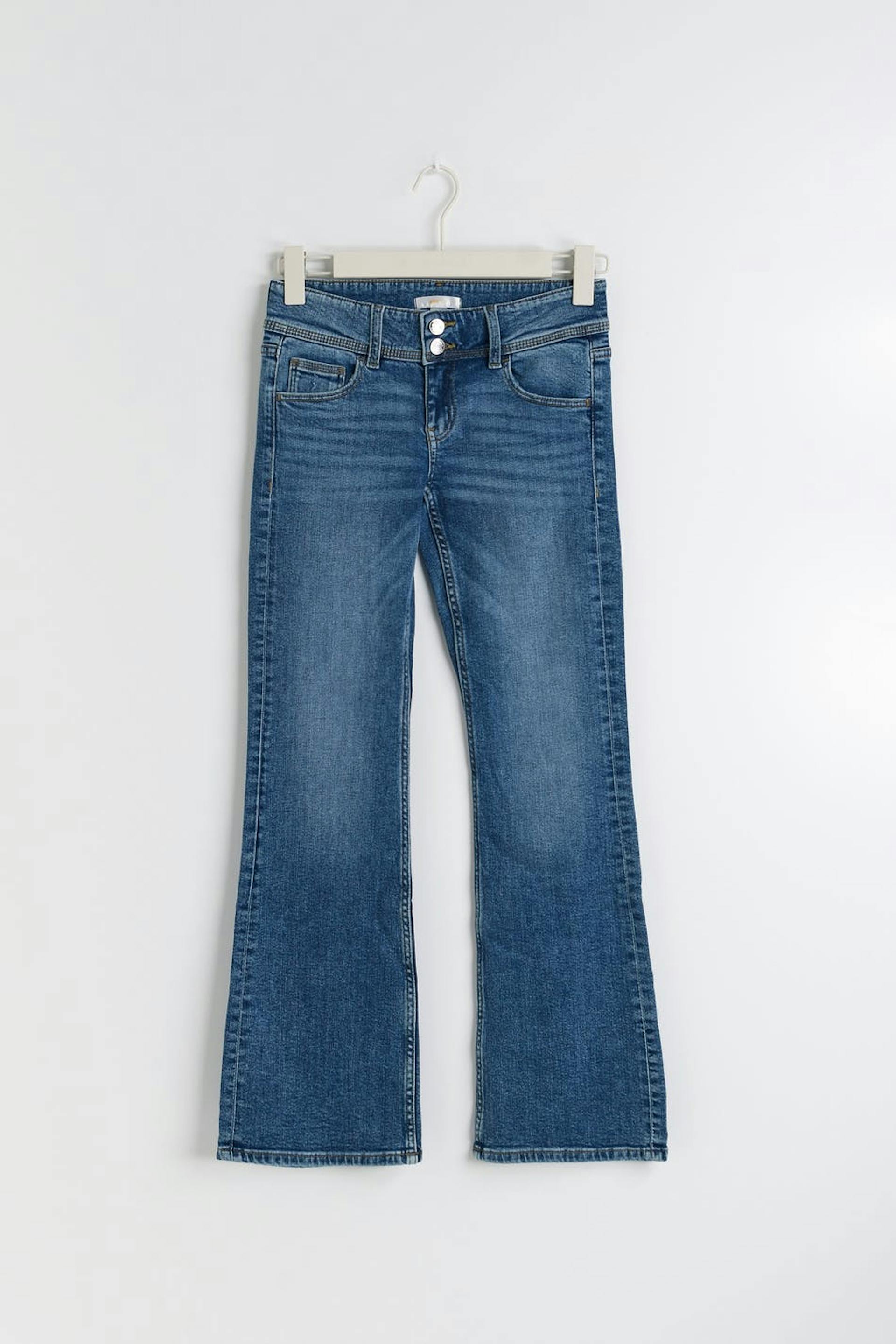 Bootcut jeans fra Gina Tricot Young med lav talje. Jeansene er blå og har udsvingende ben med maxi. De har lavt stretch, sømdetaljer ved fronten, baglommer med knapper, dobbelte knapper ved fronten og justérbar elastik ved taljen.