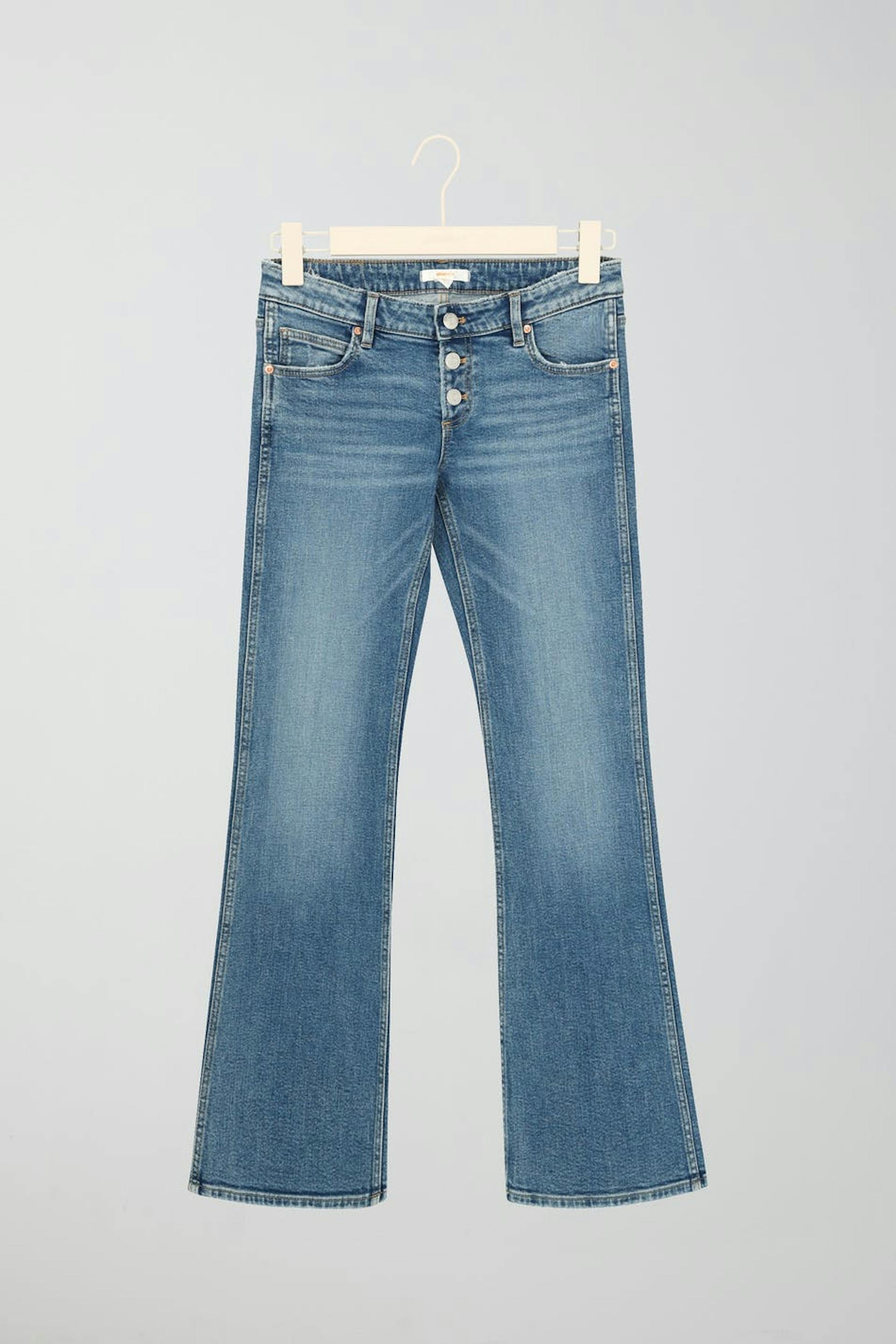 70'er-inspirerede jeans med lav talje. Jeansene er blå og har udsvingende ben med maxi. De har lavt stretch, knaplukning, justérbar elastik ved taljen, ekstra lange ben og lommer foran og bagpå.