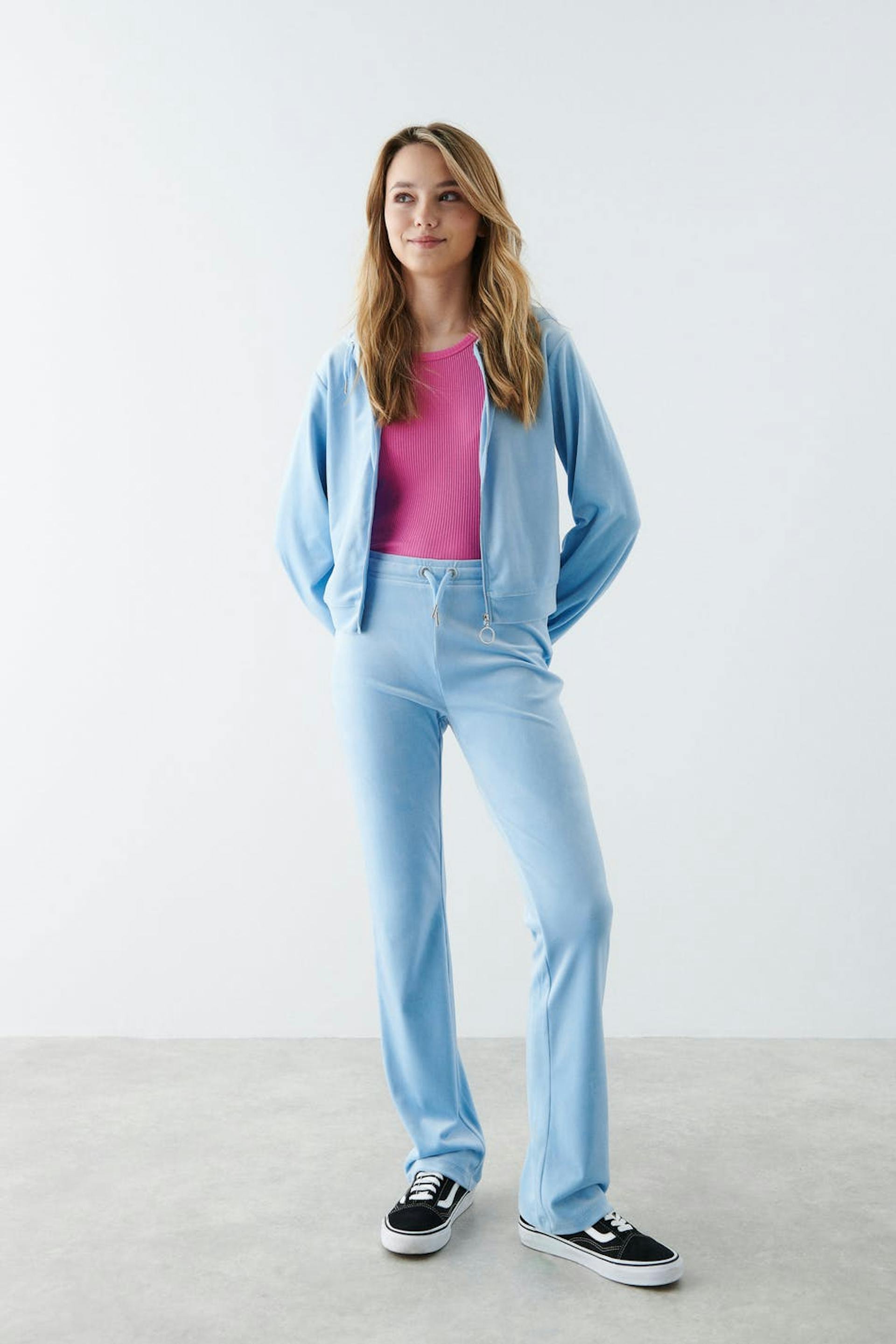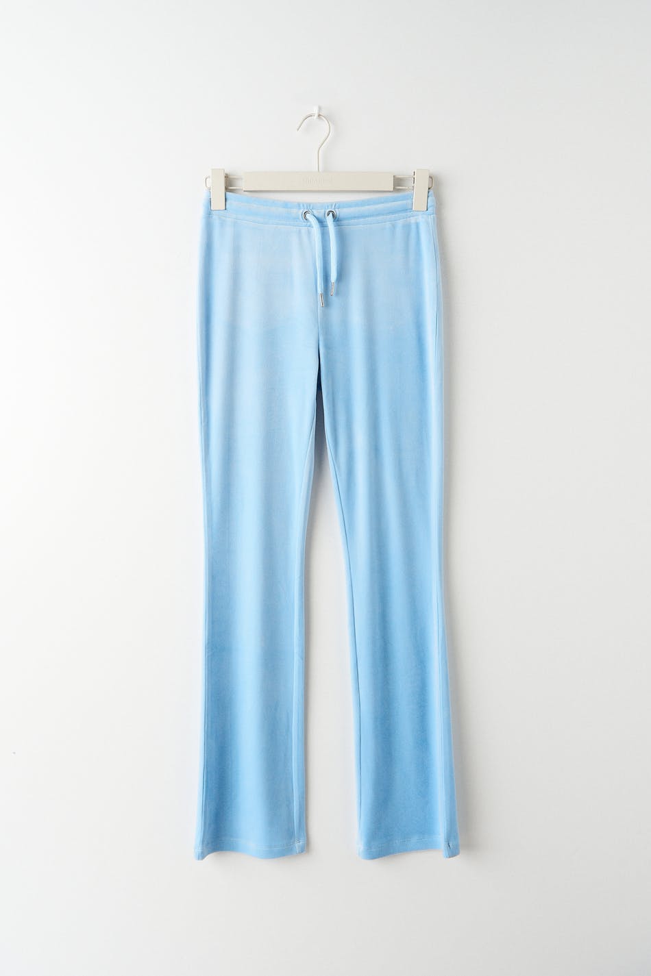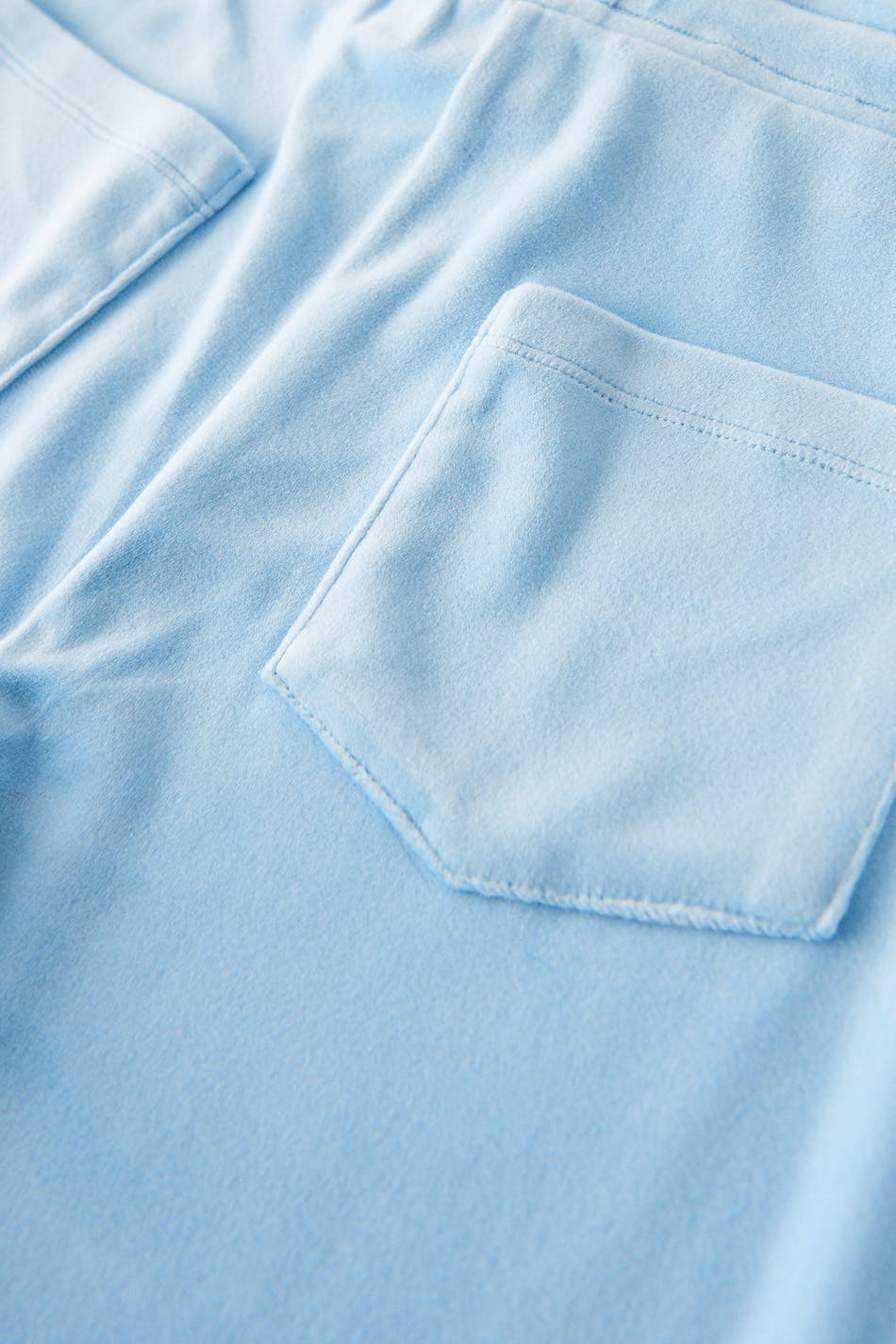 Bløde træningsbukser i velour med baglommer. Bukserne er blå og har en elastisk talje med stropper ved fronten.