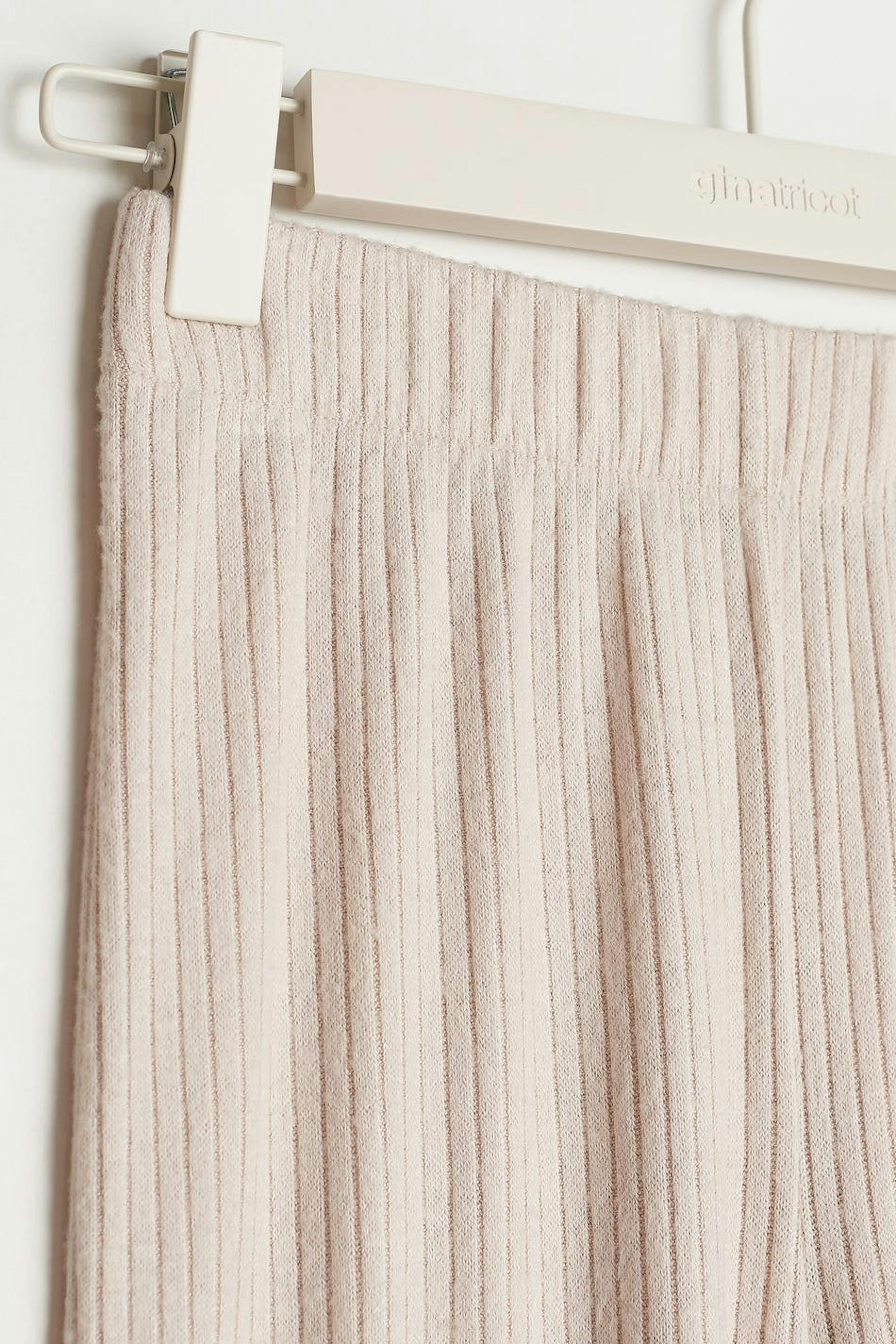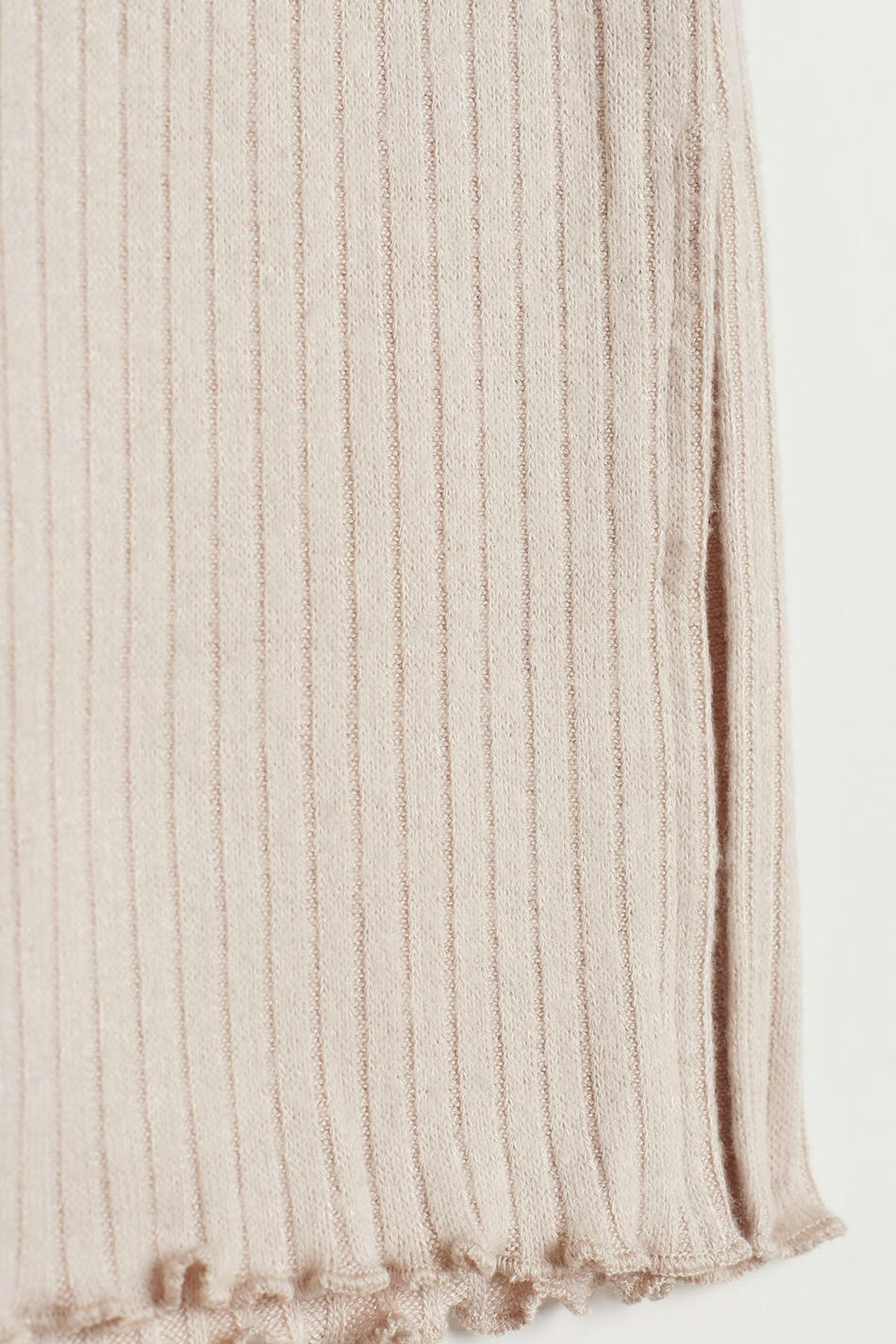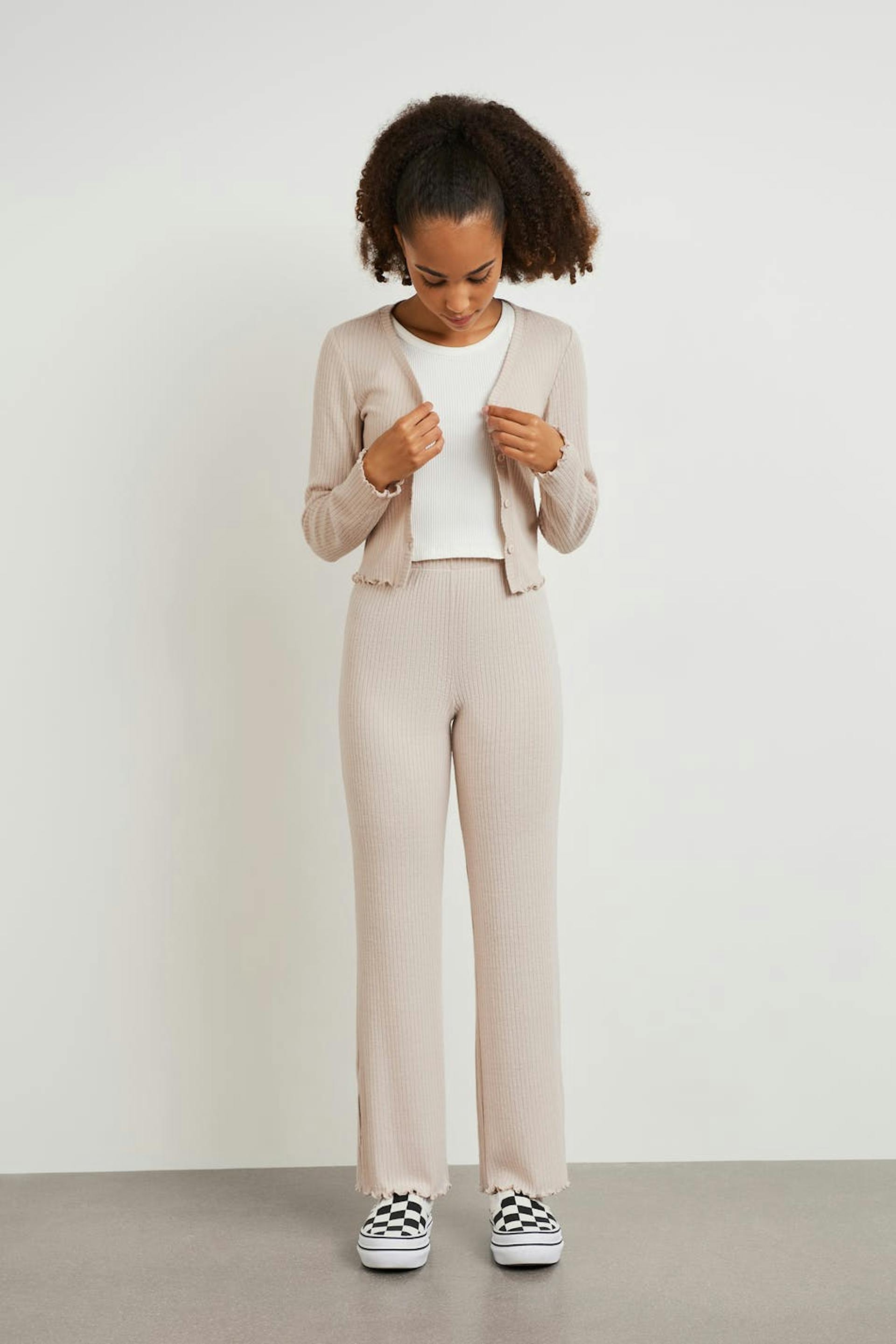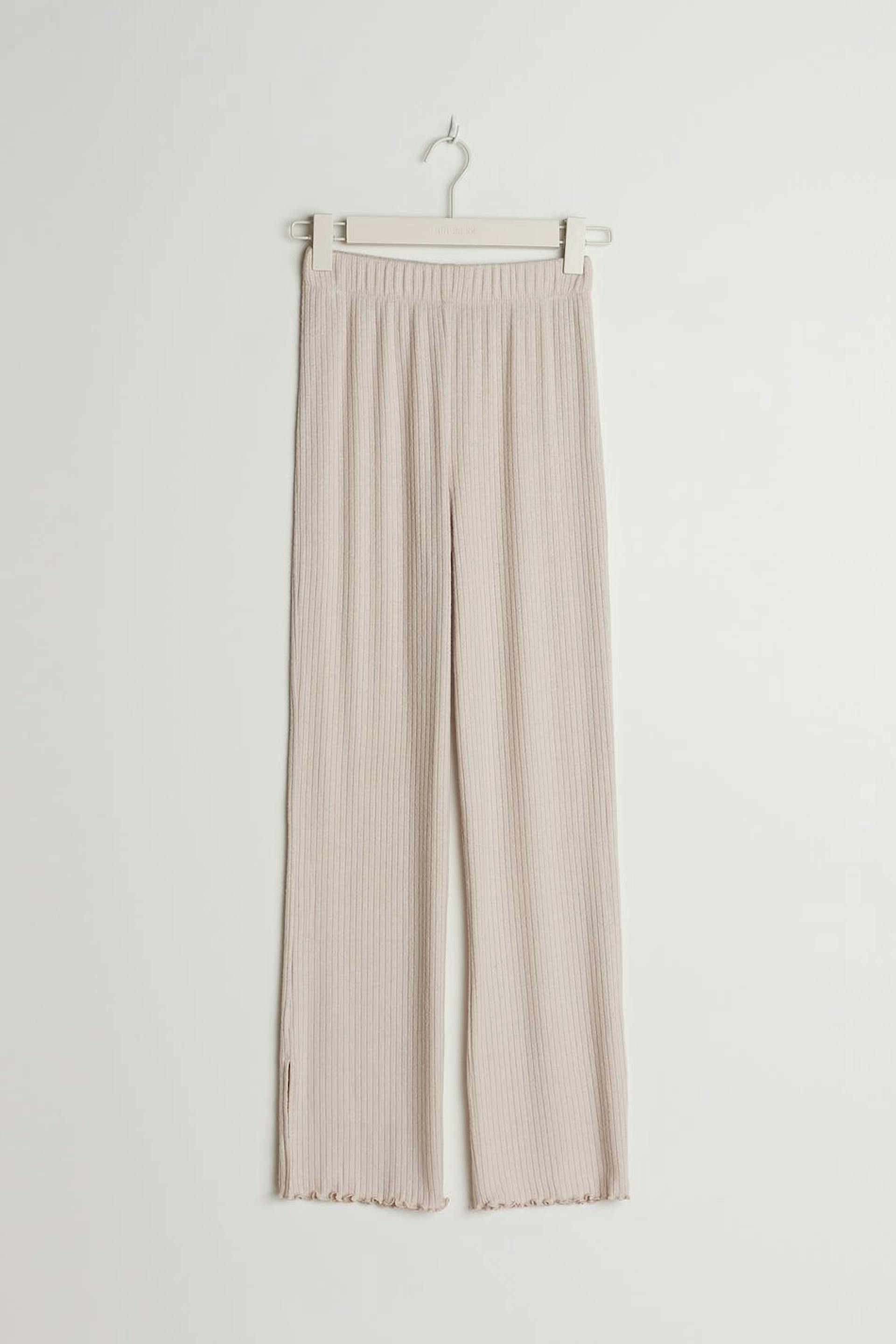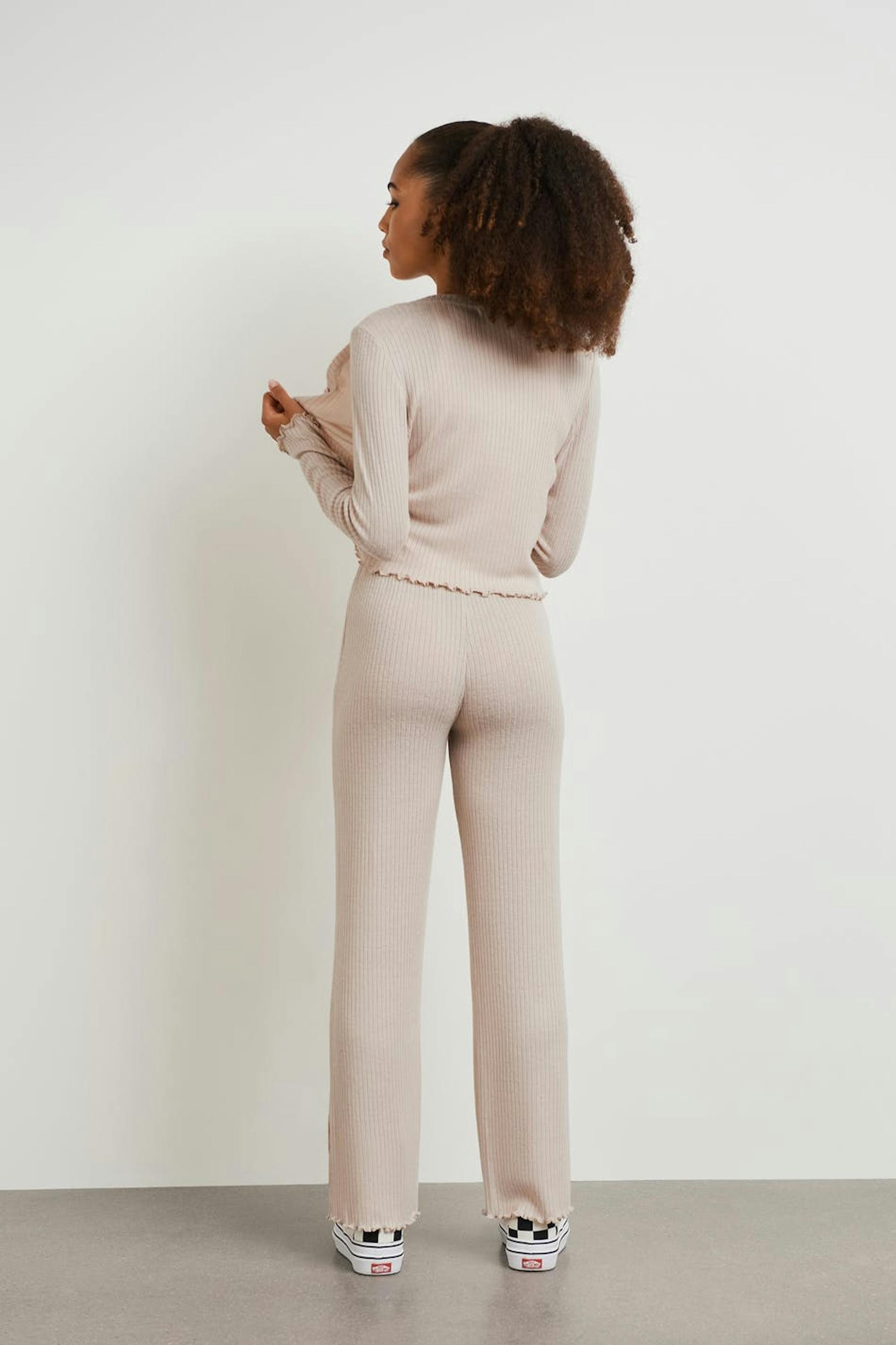 Ribbede bukser fra Young-sortimentet vårt med en normal pasform. Bukserne er beige og har en elastik ved taljen. De har små, dekorative volanter og slidser ved enden af benene.