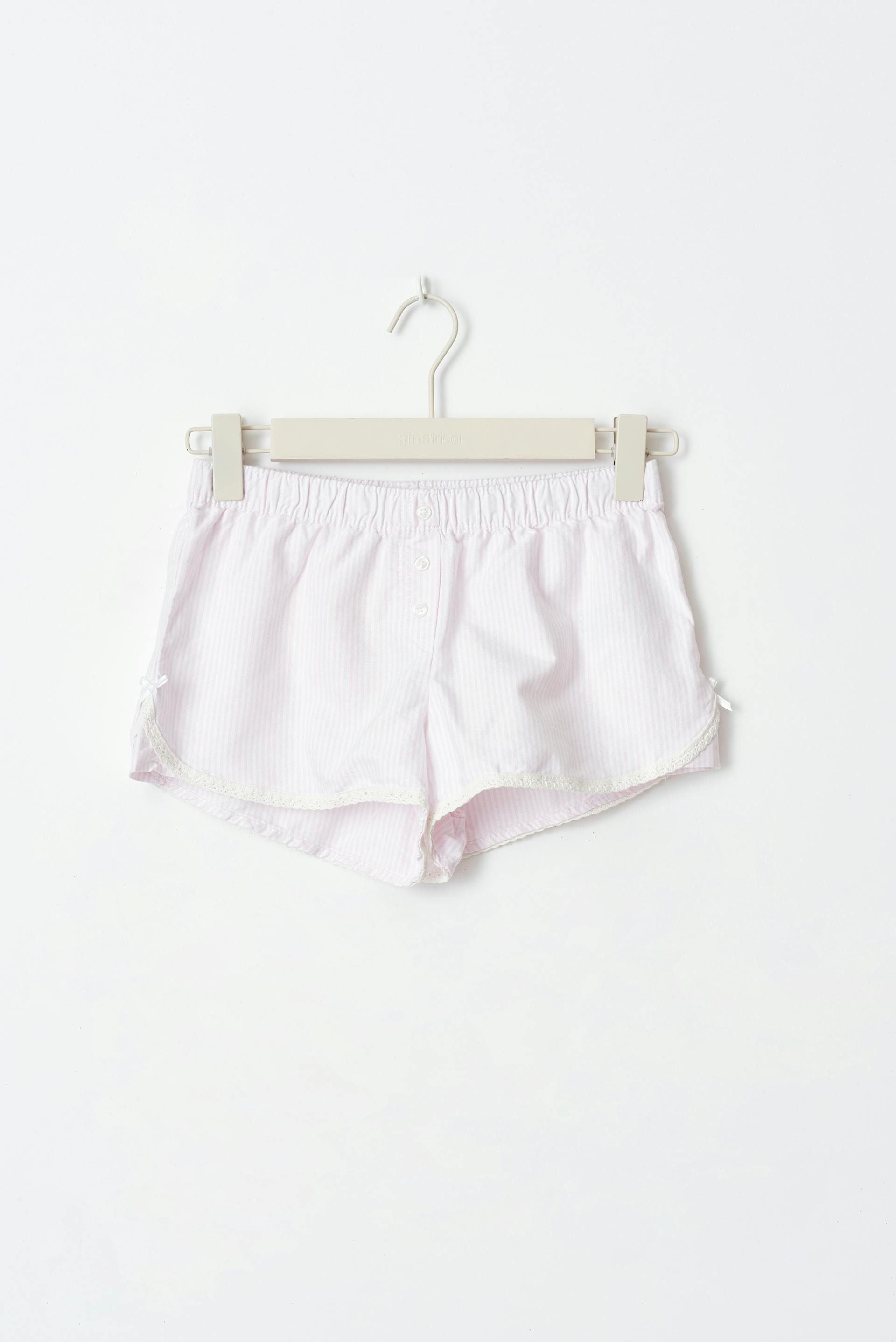 Stribede pyjamasshorts fra Gina Tricot Young med knapper ved fronten. Shortsene er pink, hvidt og kort. Det har lav talje med elastik, sløjfedetalje i siderne og blonde ved den nederste kant.