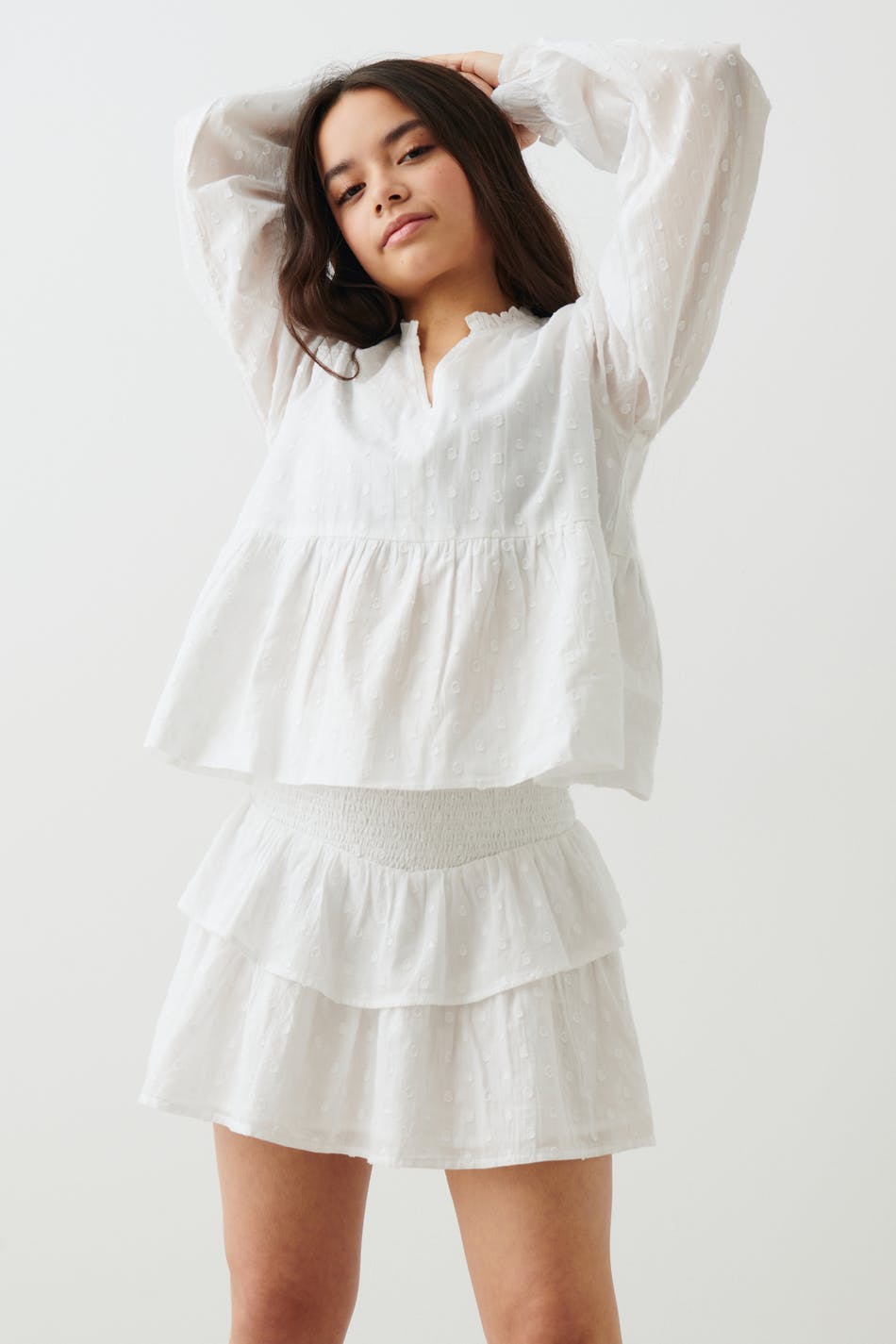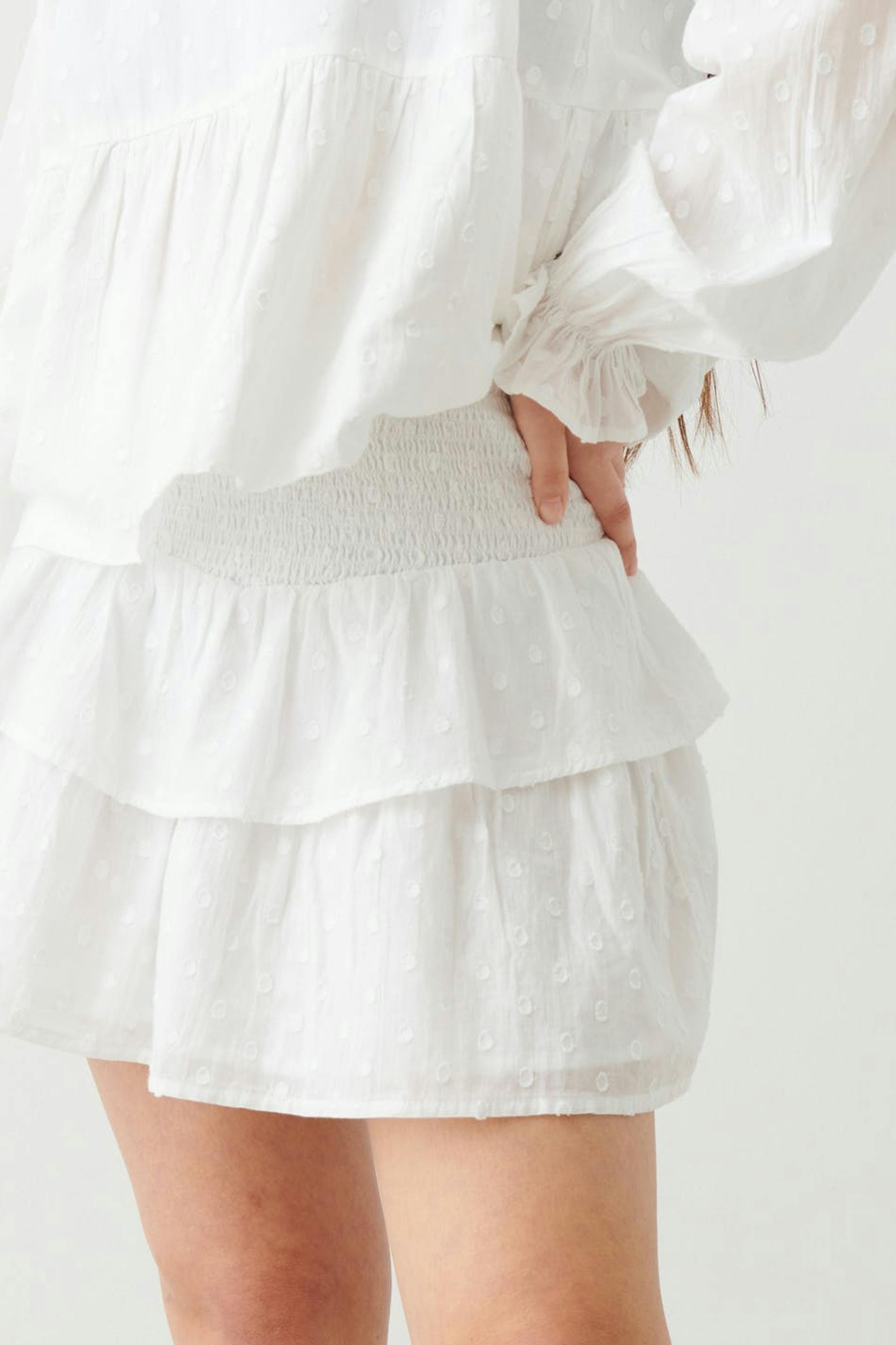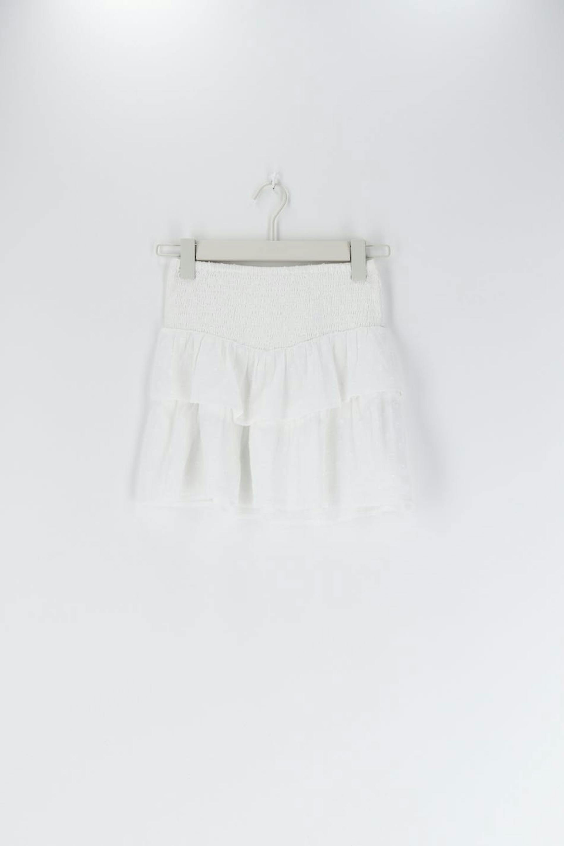 Prikket volantnederdel fra Gina Tricot Young med smocktalje. Nederdelen er hvid og kort og har normal pasform.