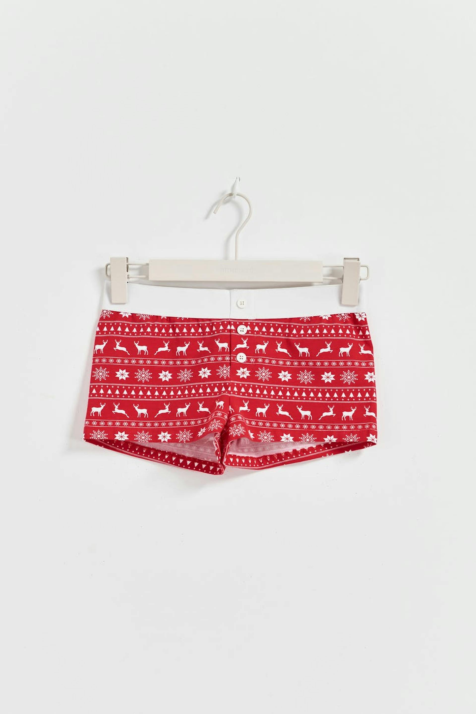 Mønstrede pyjamasshorts i jersey med elastik ved taljen. Shortsene er rødt, lavtaljet og kort. Det har dekorative knapper ved fronten.