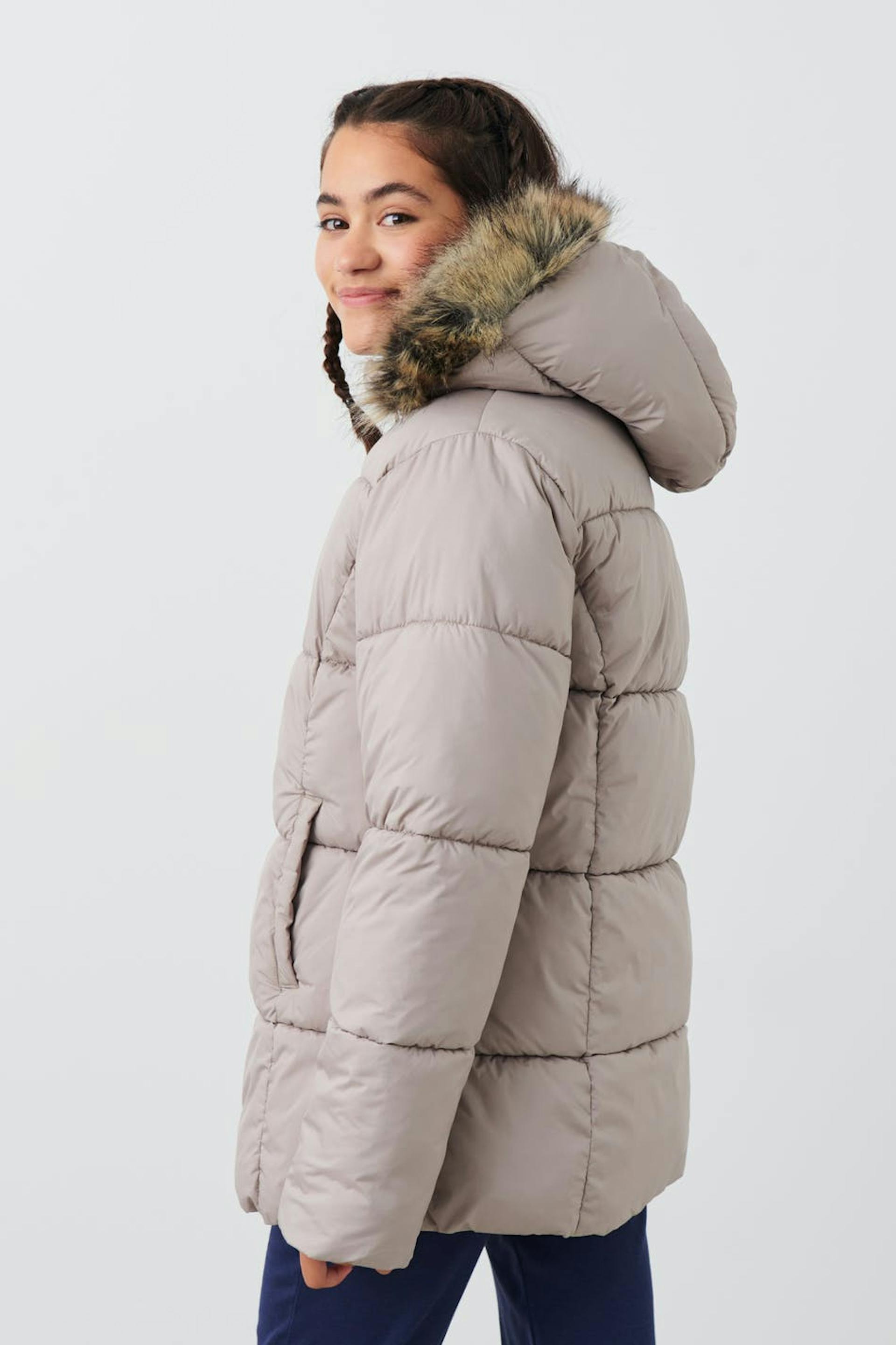 Foret pufferjakke fra Gina Tricot Young med normal pasform. Jakken er beige og har sidelommer. Den har lynlåslukning foran og aftagelig hætte med kunstig pels.