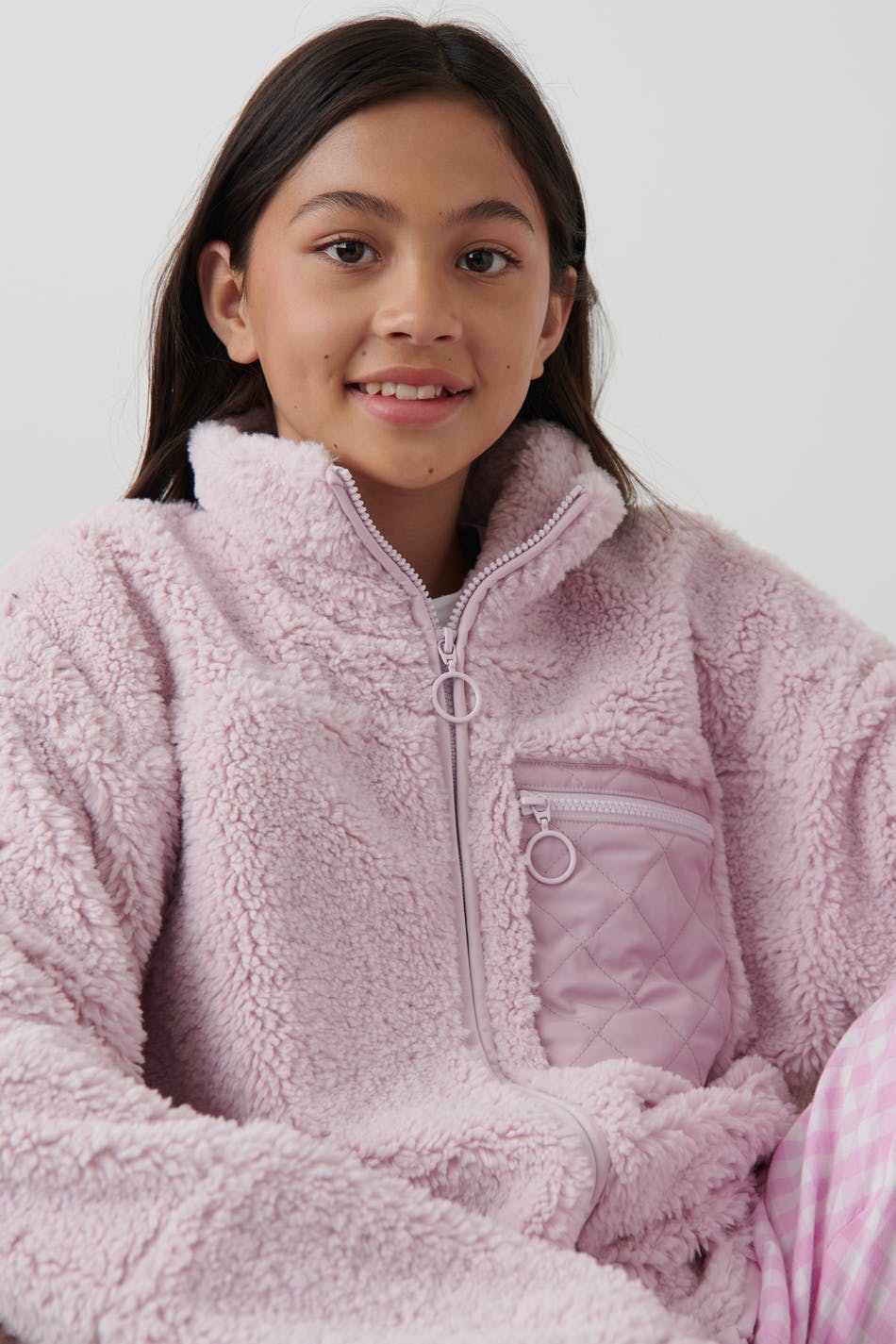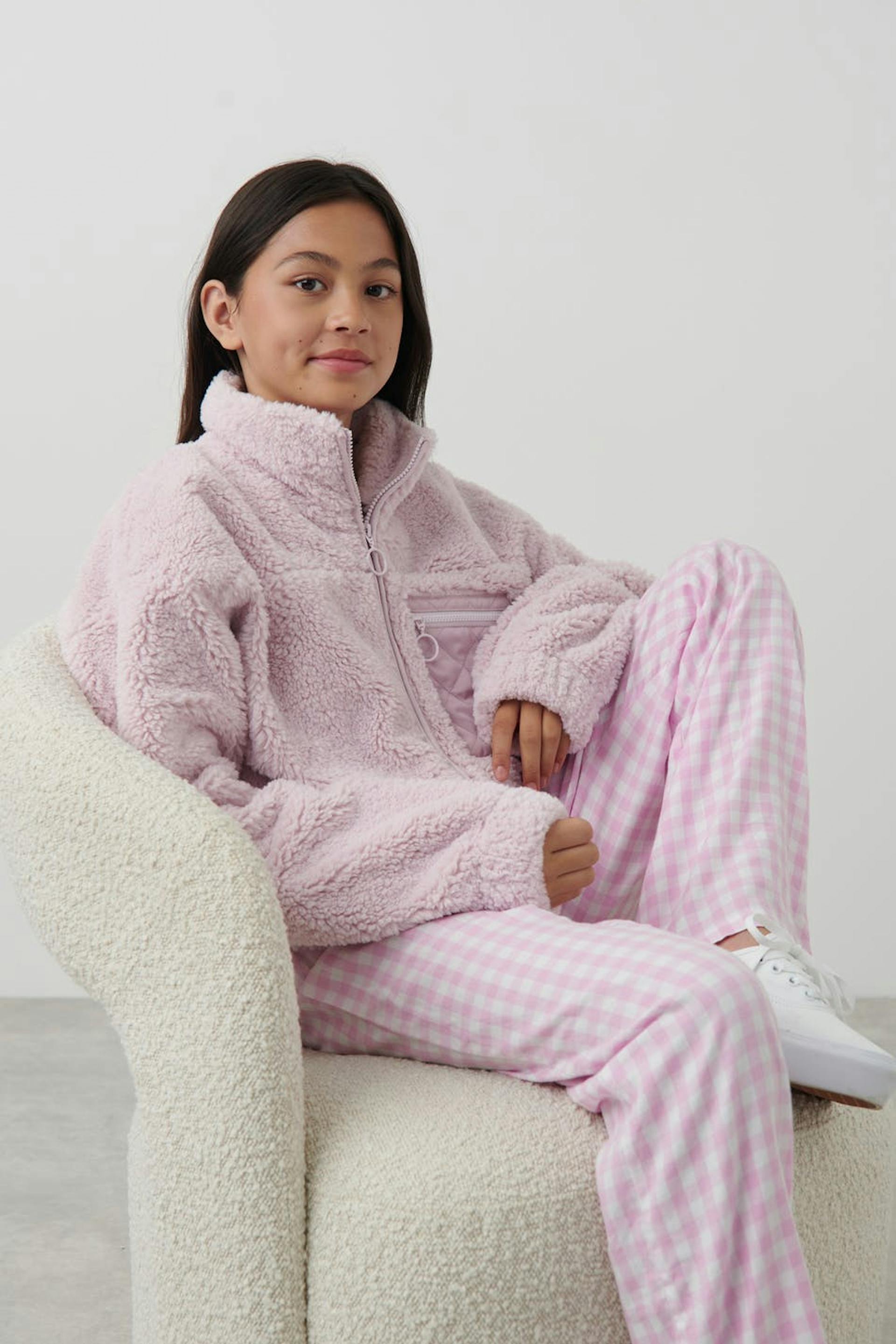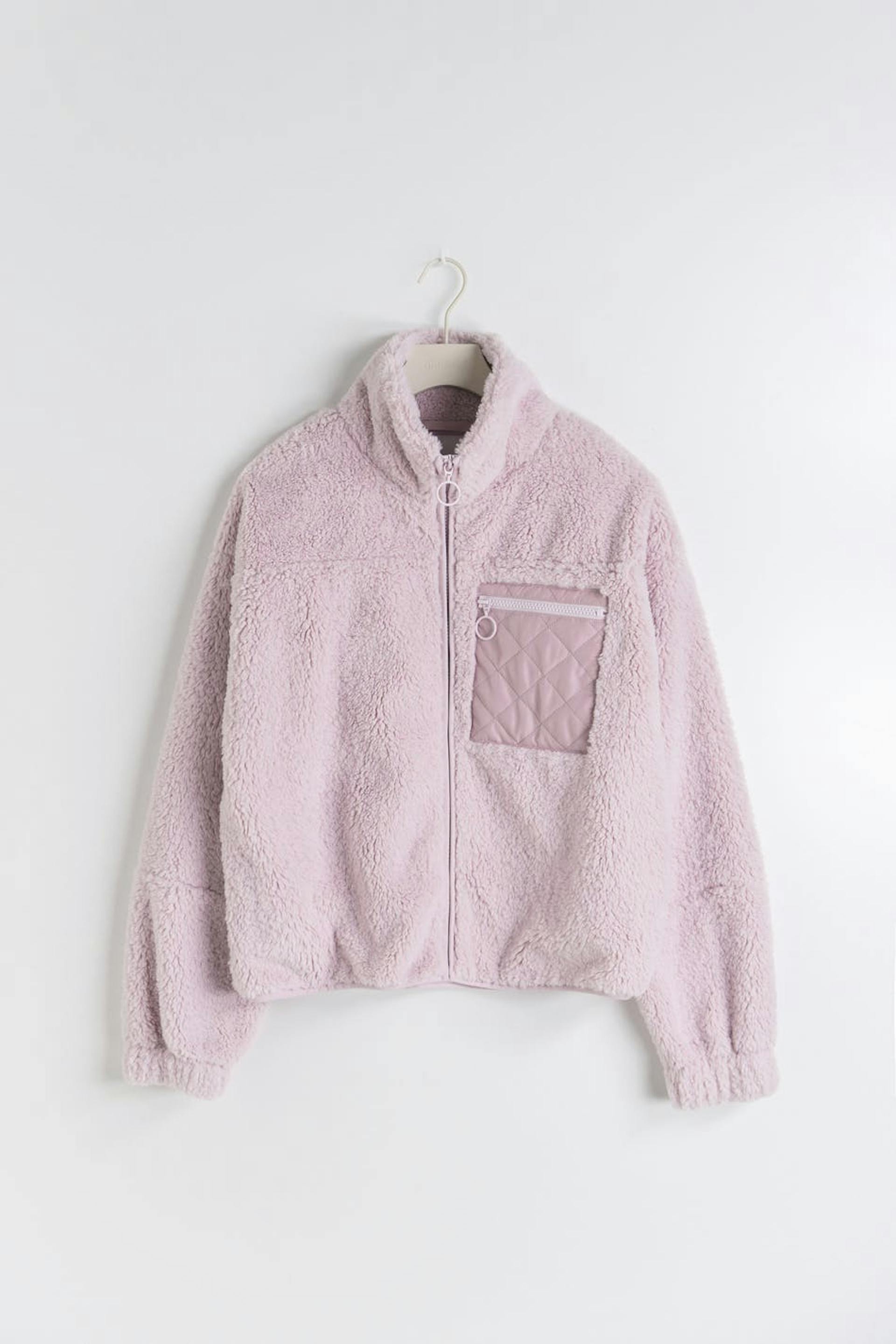 Teddyjakke fra Gina Tricot Young med boxy pasform. Teddyjakken er pink og har lommer med lynlås. Den har varm, blød kvalitet og en oversize pasform.