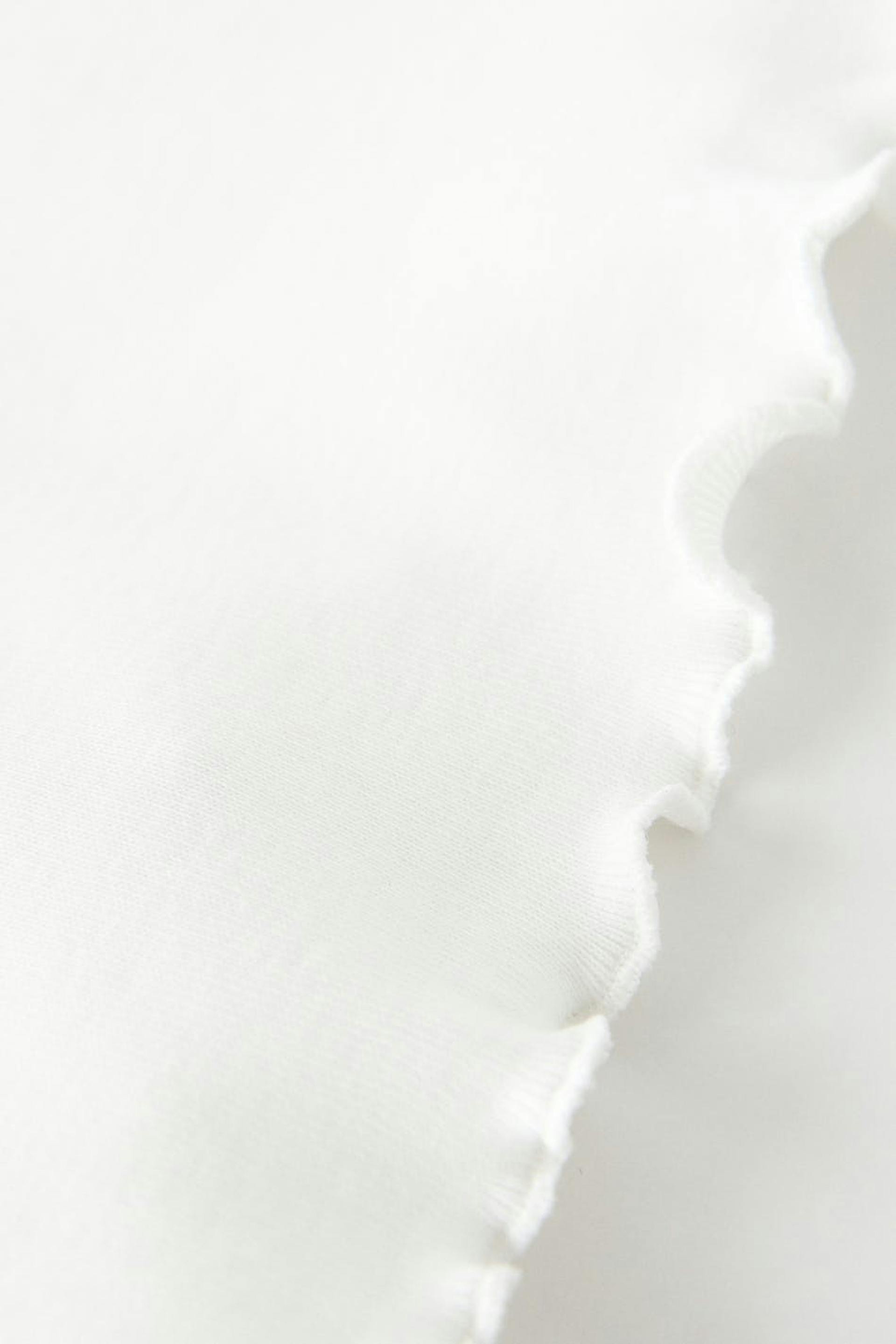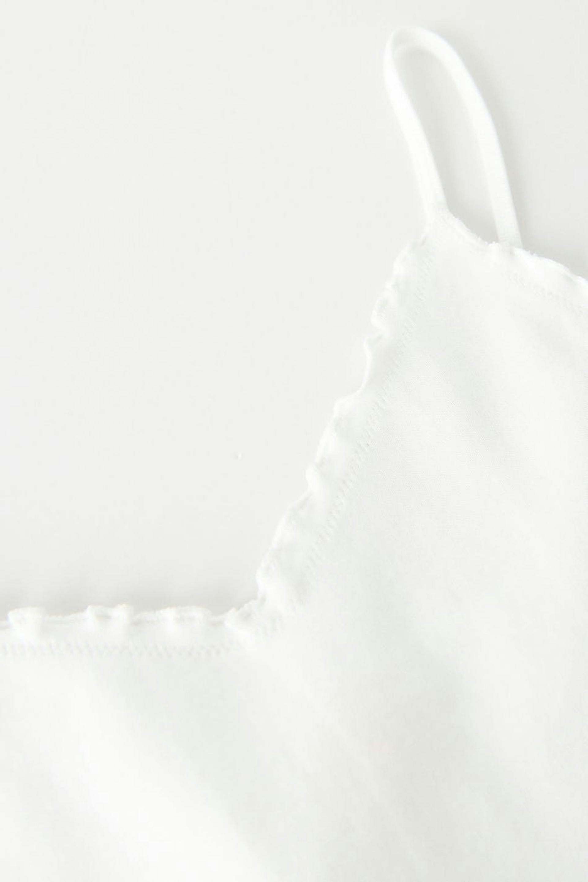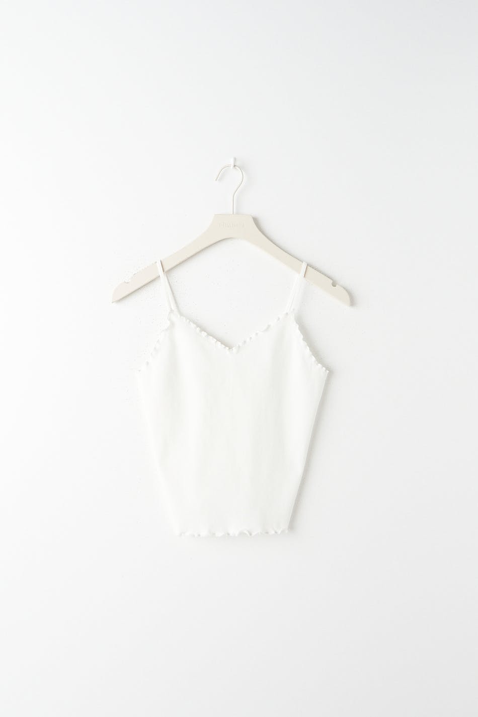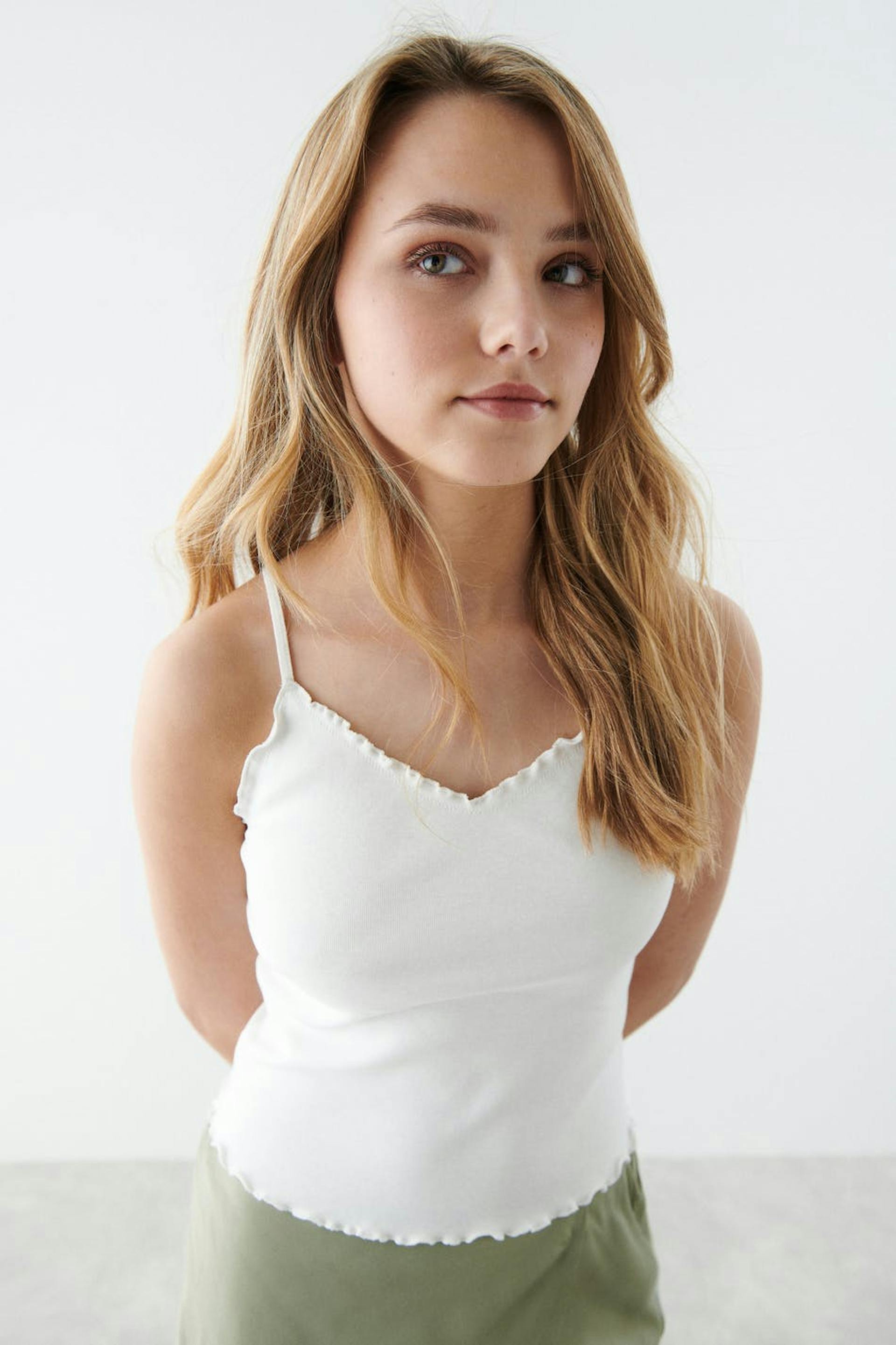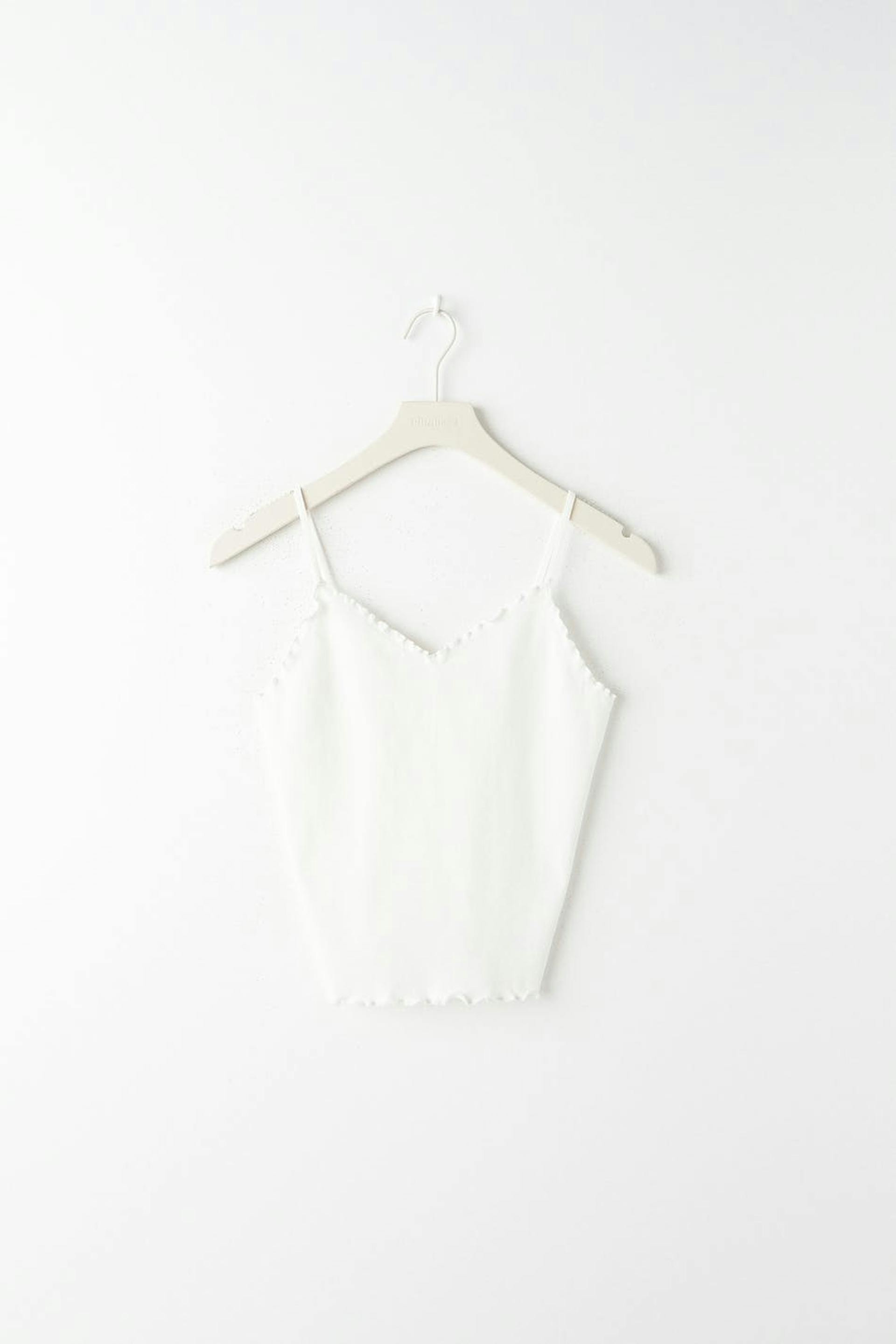 Croppet tanktop i jersey med v-udskæring. Tanktoppen er hvid og har en figursyet pasform. Den har tynde skulderstropper og krøllede kanter.