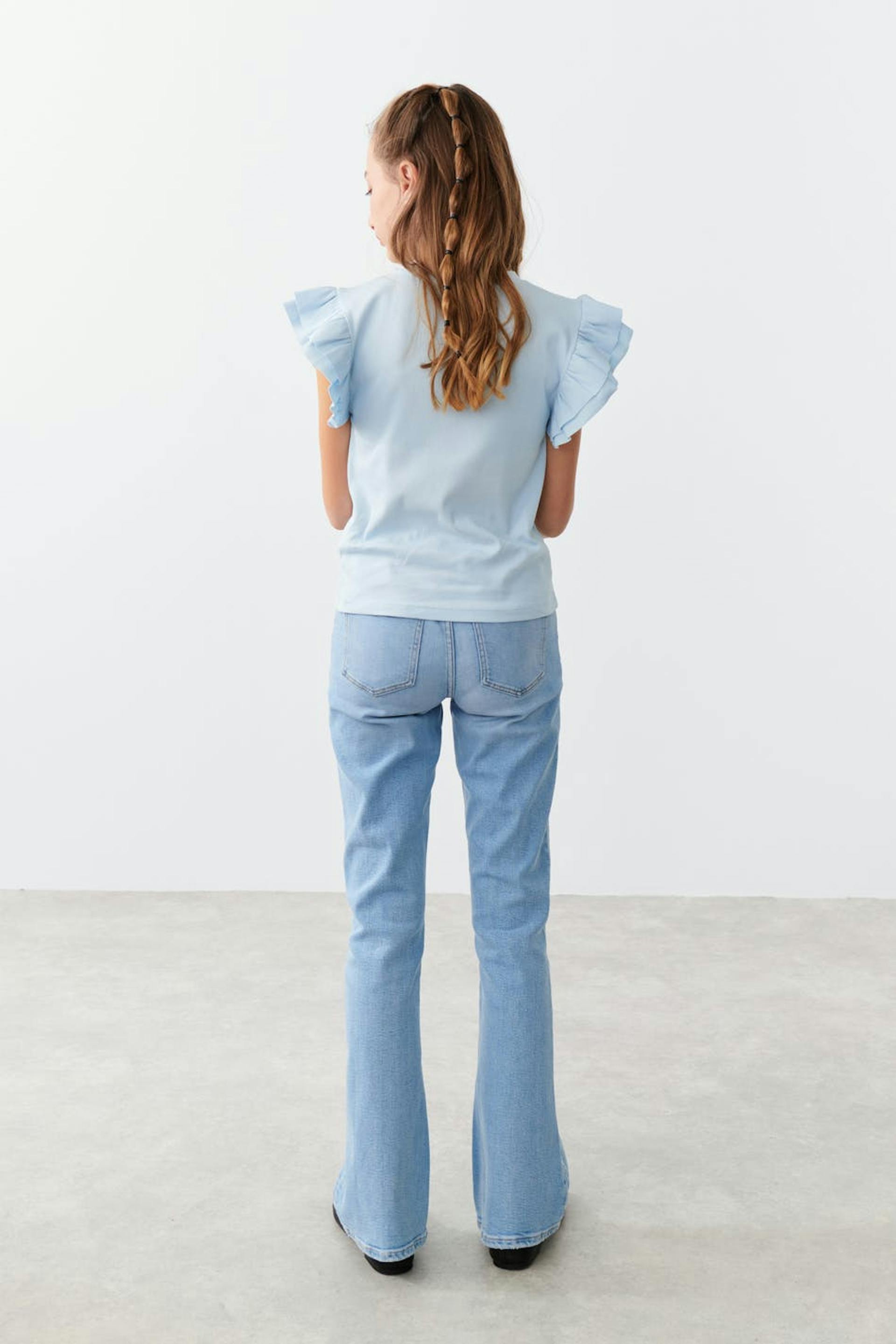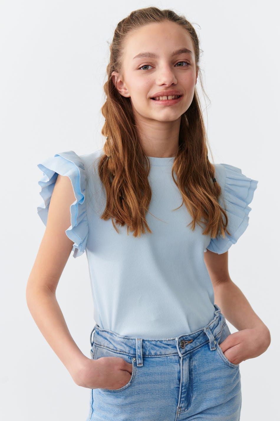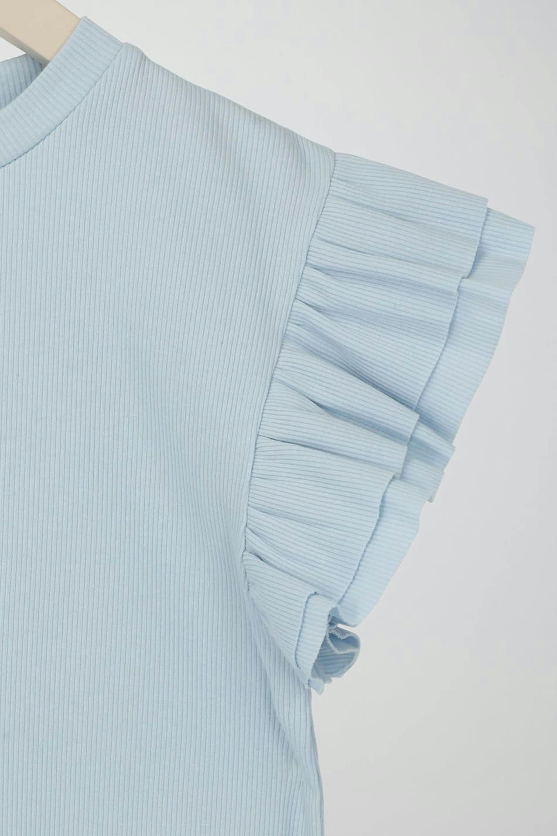 Top fra Gina Tricot Young i jersey med korte flæseærmer. Toppen er blå og har en ribbet kvalitet.