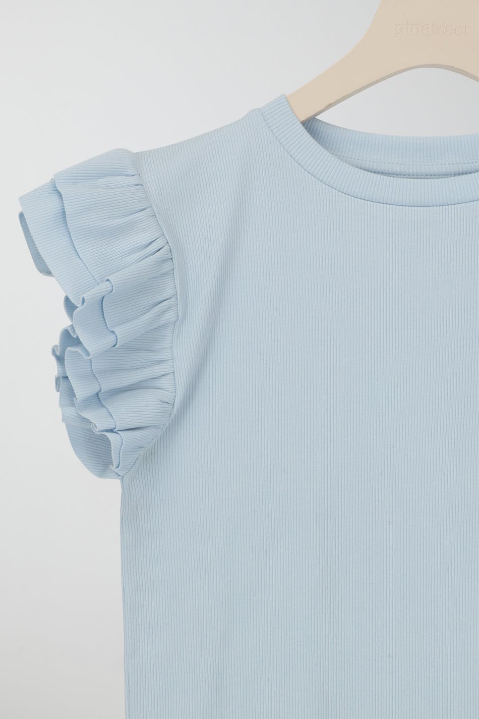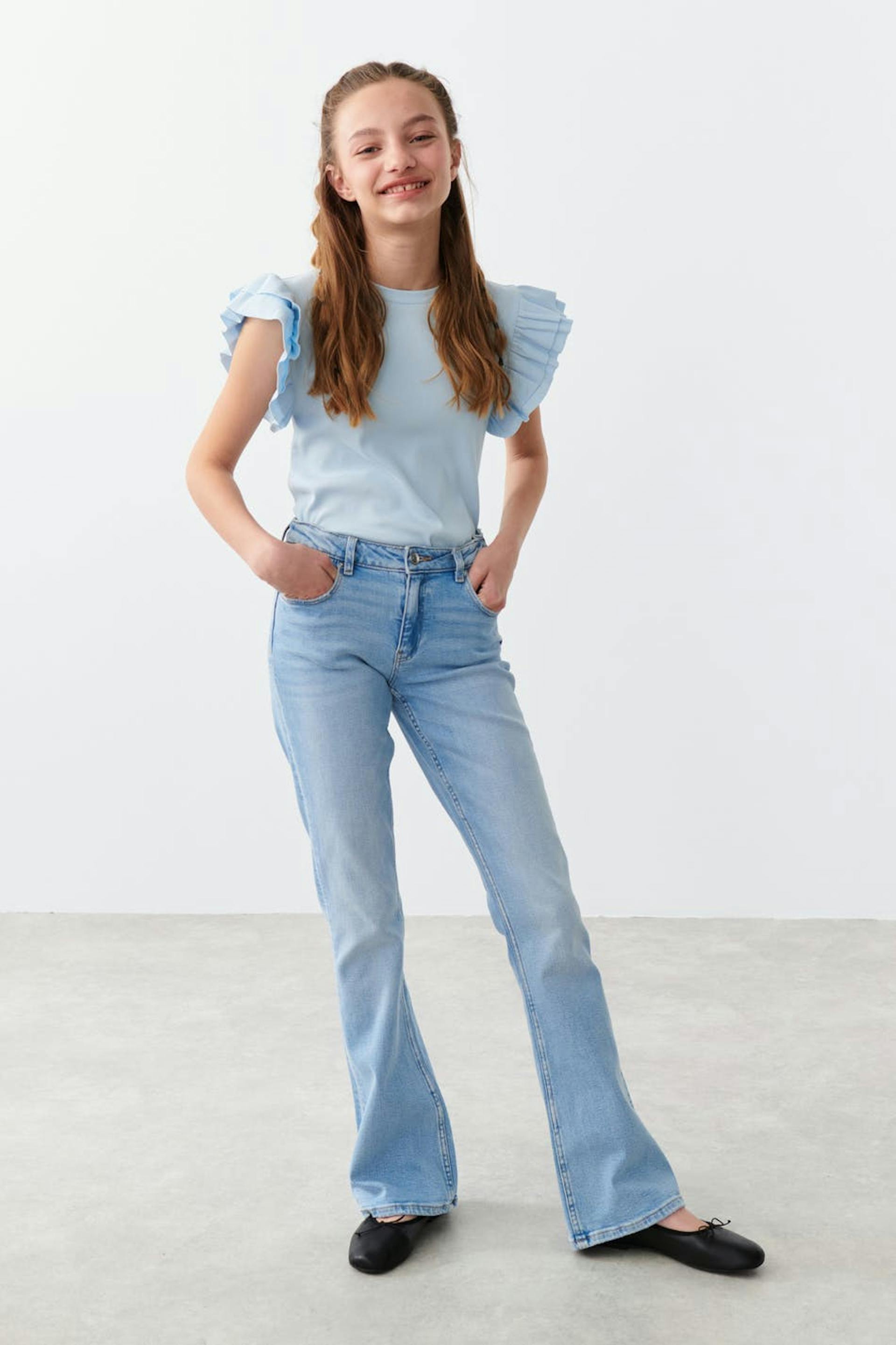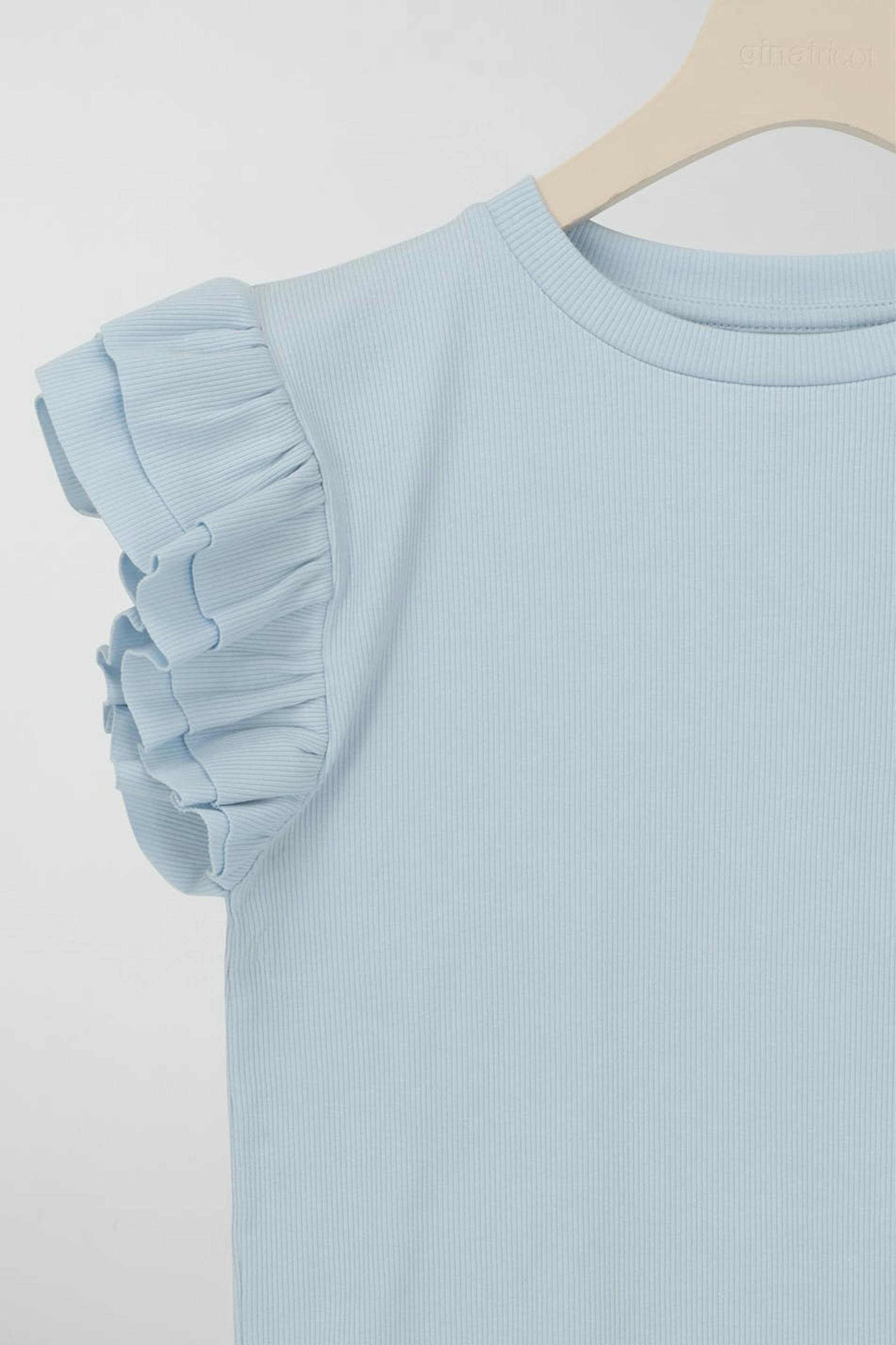 Top fra Gina Tricot Young i jersey med korte flæseærmer. Toppen er blå og har en ribbet kvalitet.
