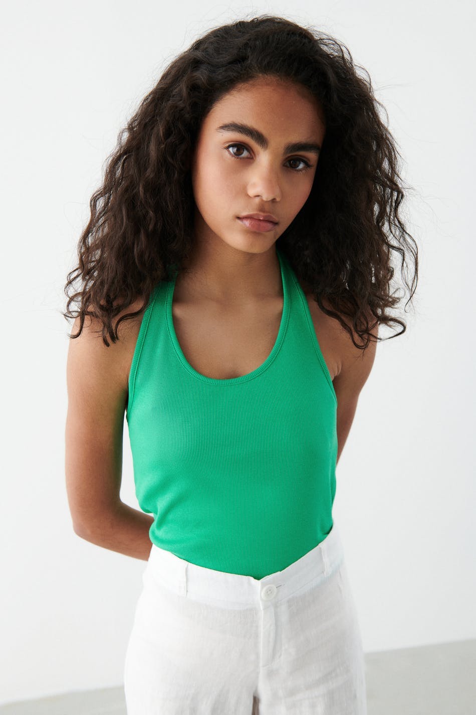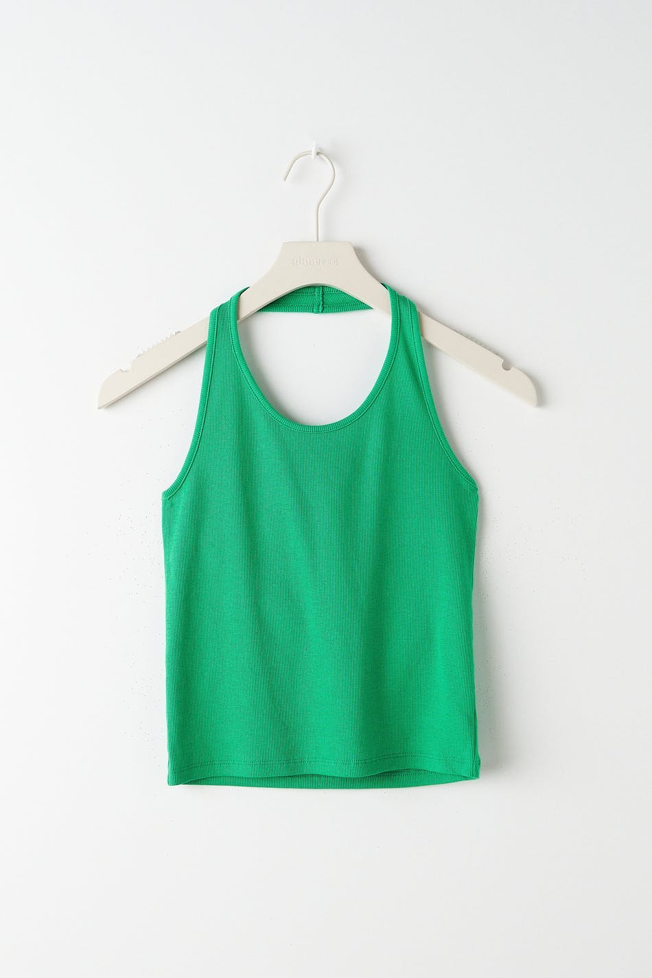 Ribbet halternecktop fra Young-sortimentet vårt med en figursyet pasform. Toppen er grøn og har en normal længde.