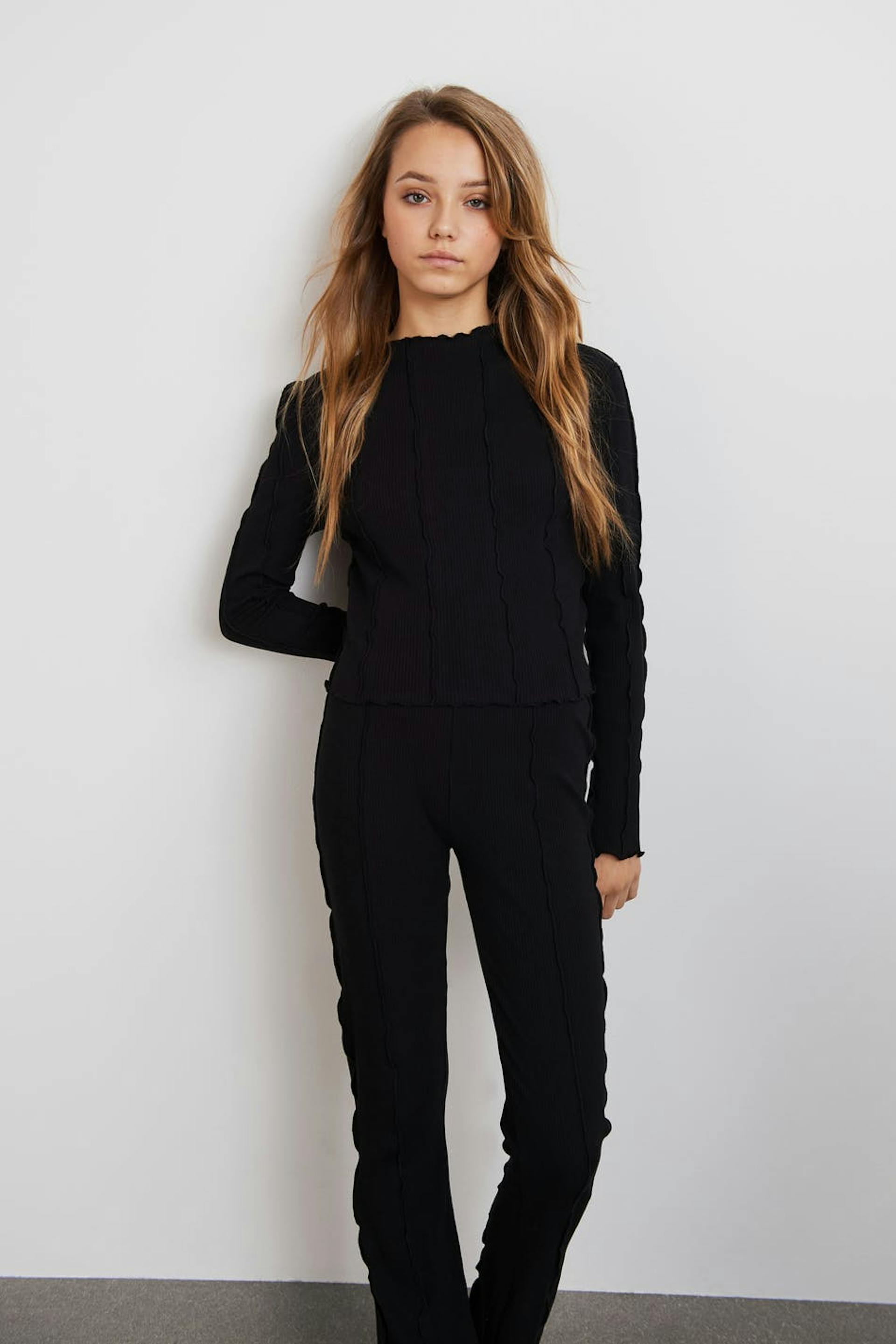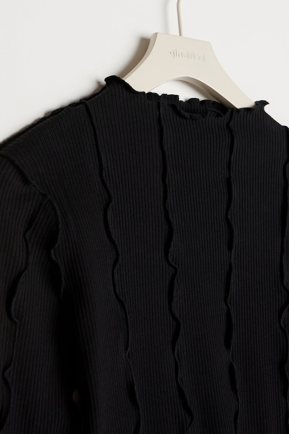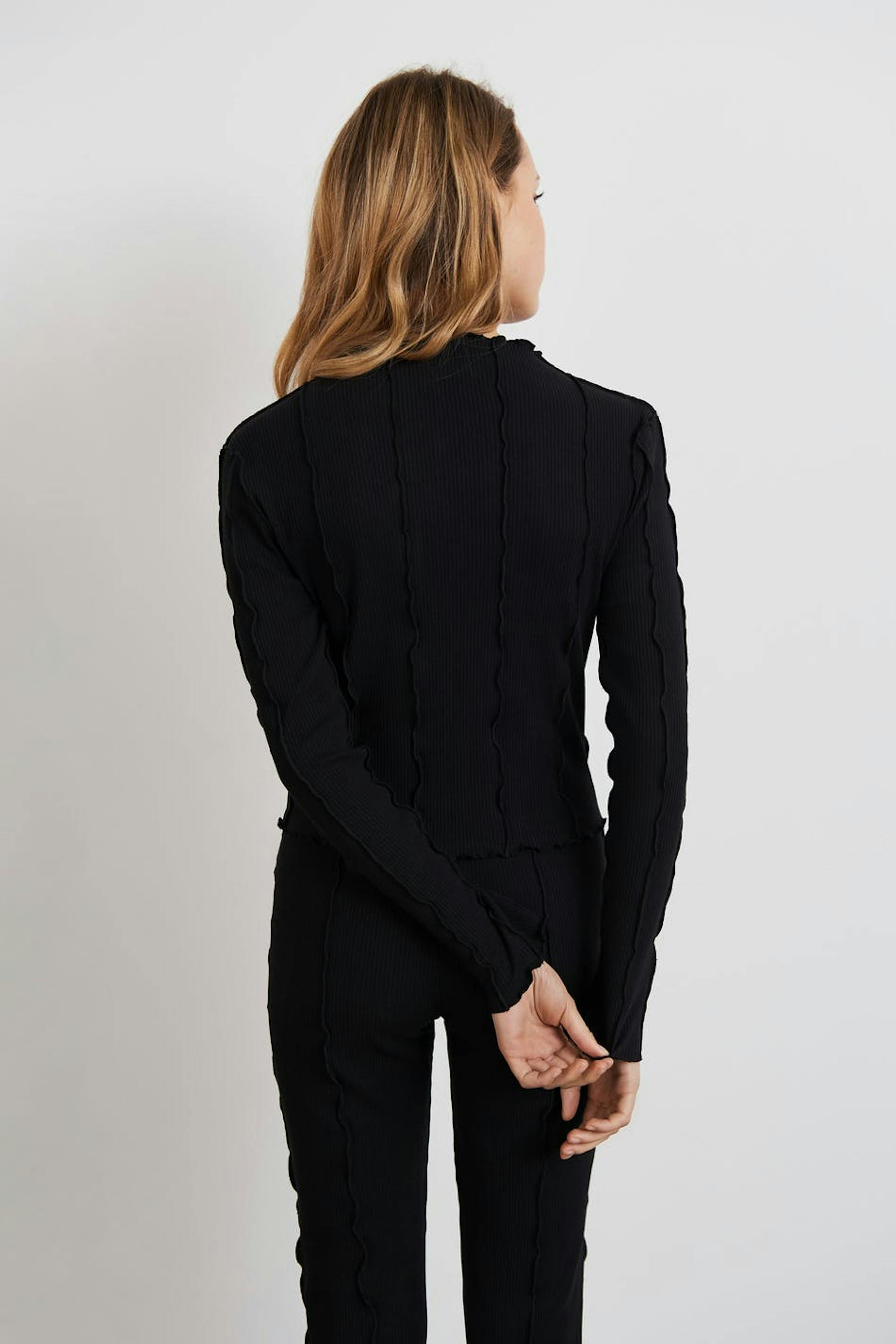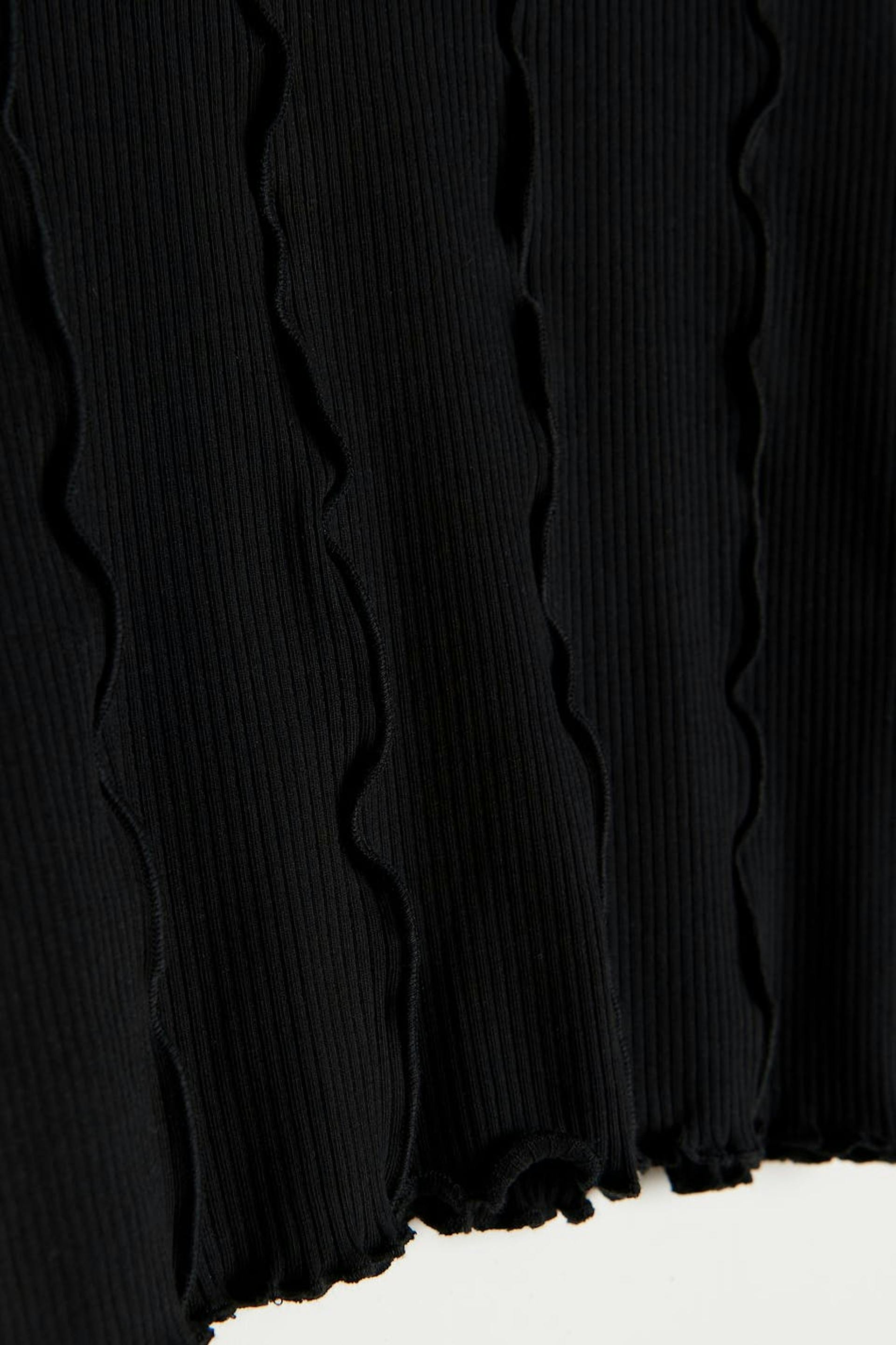 Ribbet top fra Young-sortimentet vårt med volantdetaljer. Toppen er sort og langærmet og har en høj udskæring. Den har en figursyet pasform og et blødt materiale i bomuld.