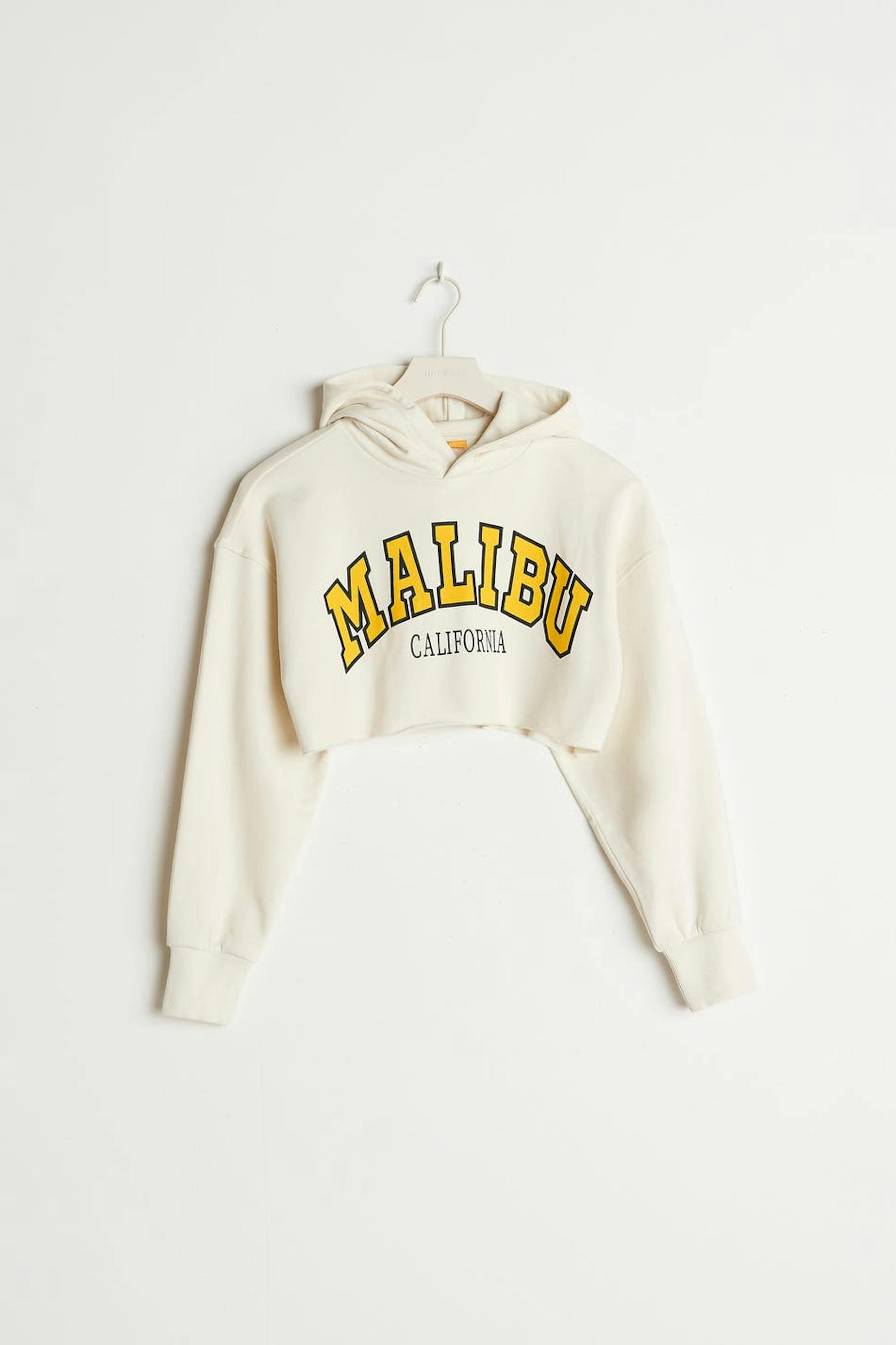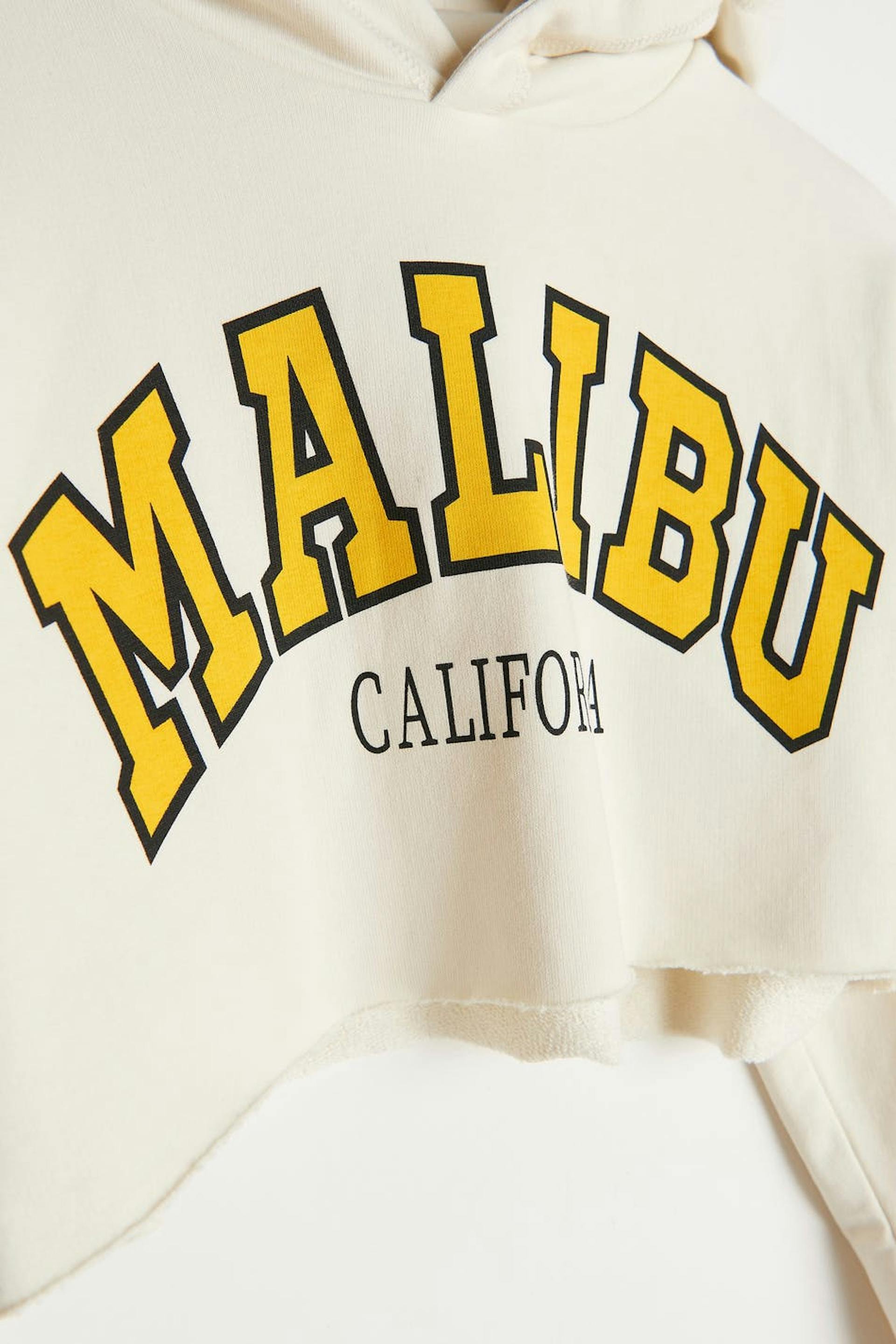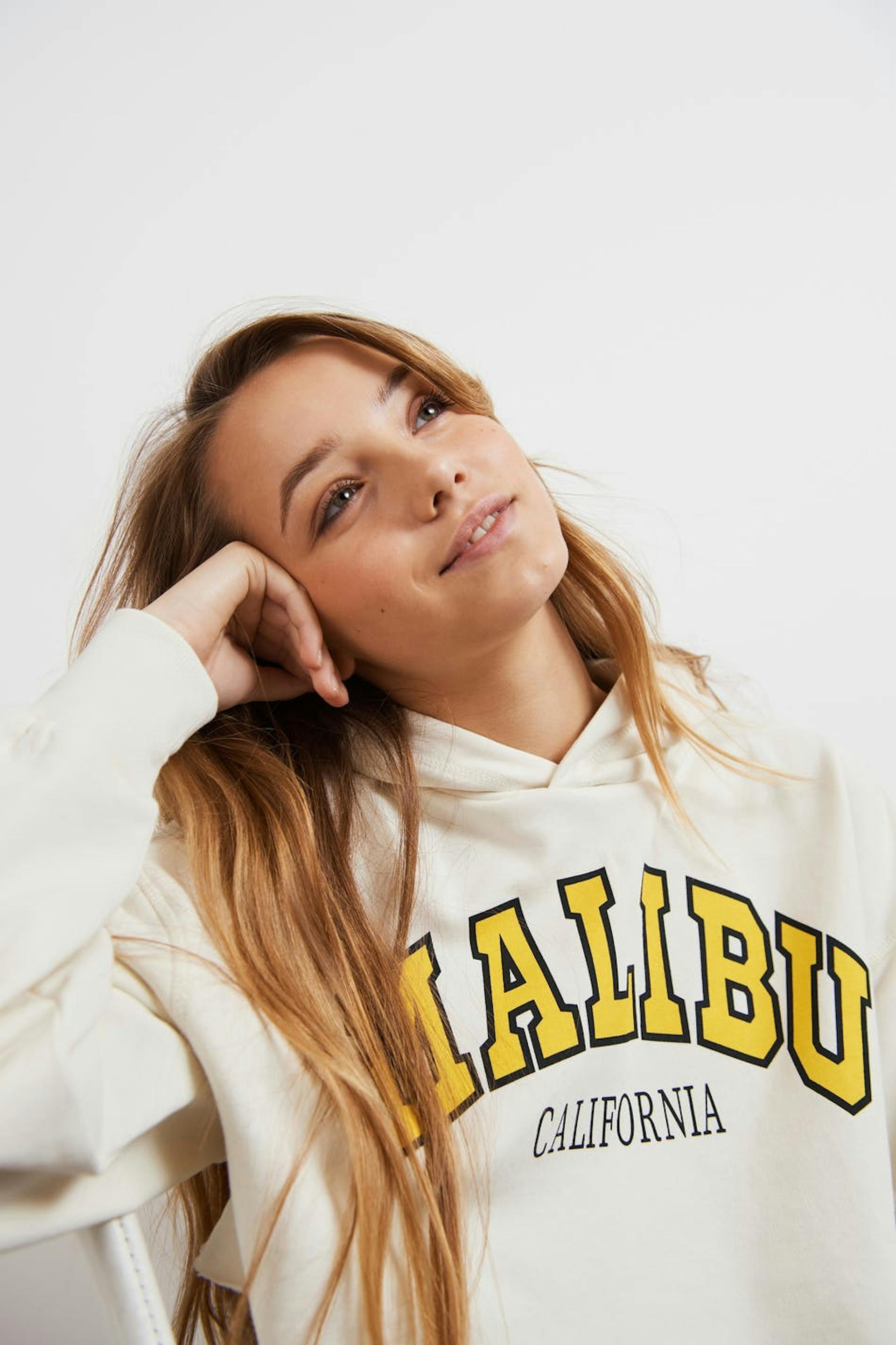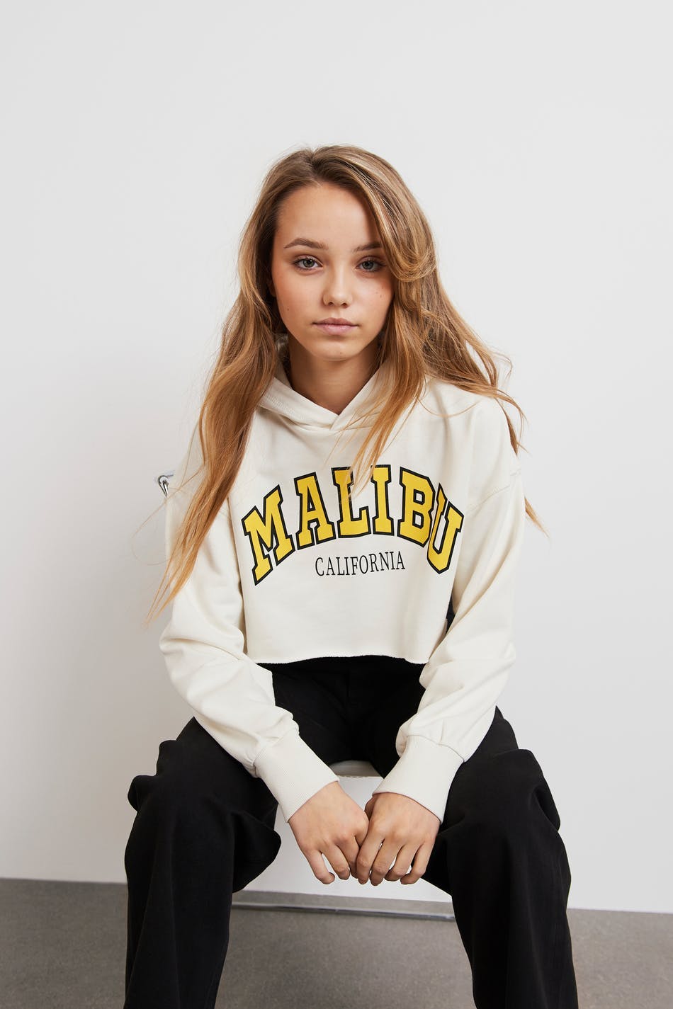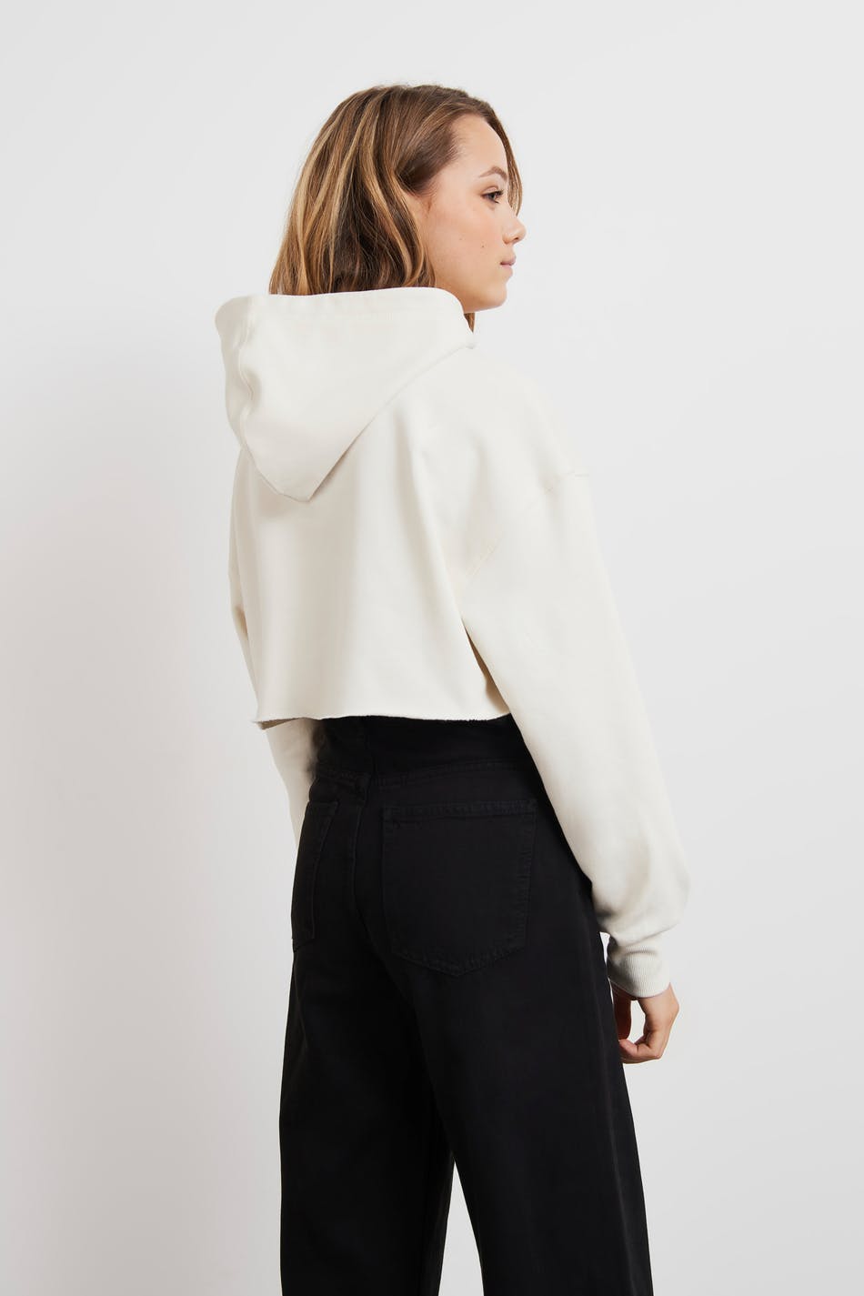 Croppet hoodie fra Young-sortimentet vårt med hætte. Hoodien er hvid og har elastiske ribber. Den er fremstillet af jersey og har en rå kant nederst.