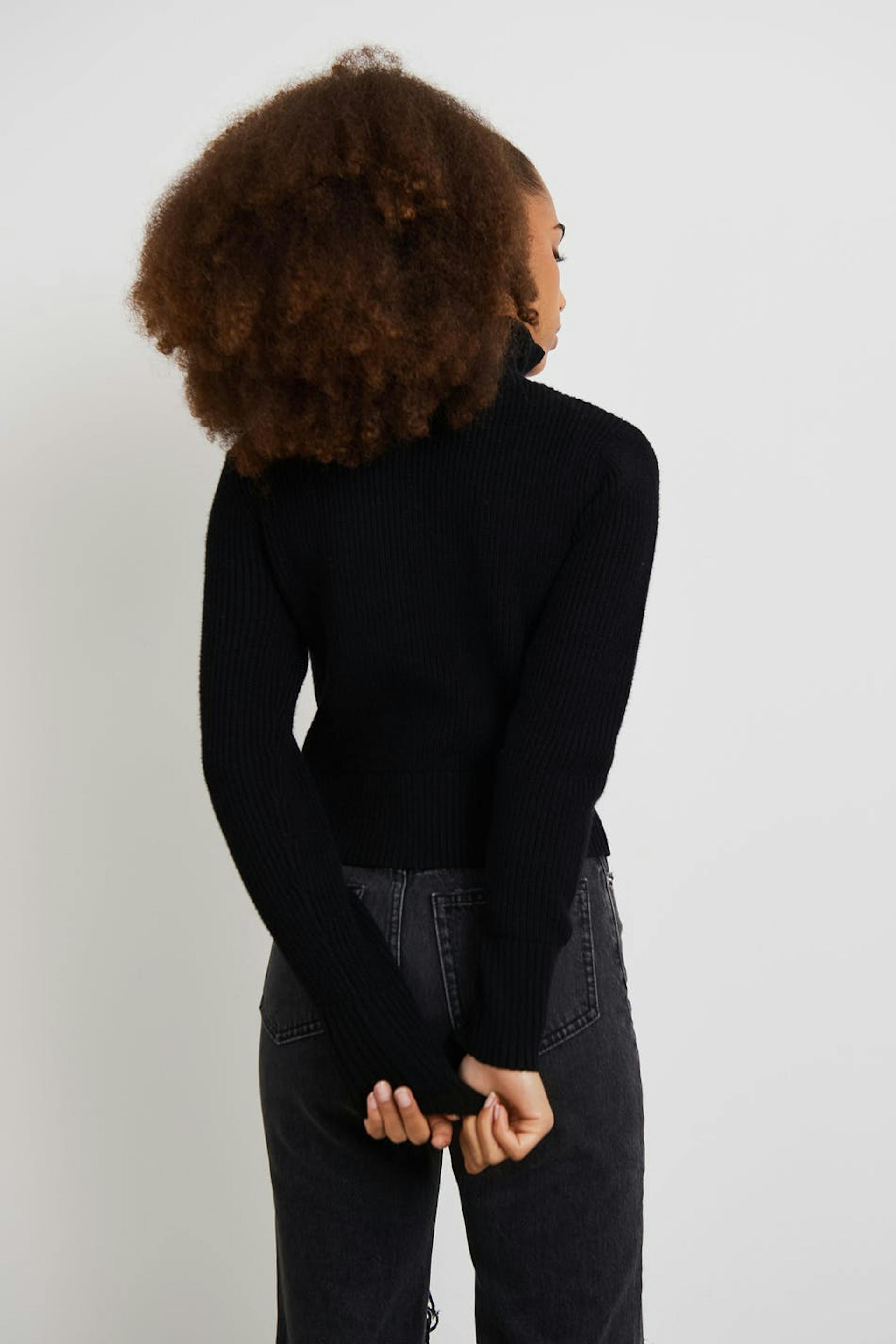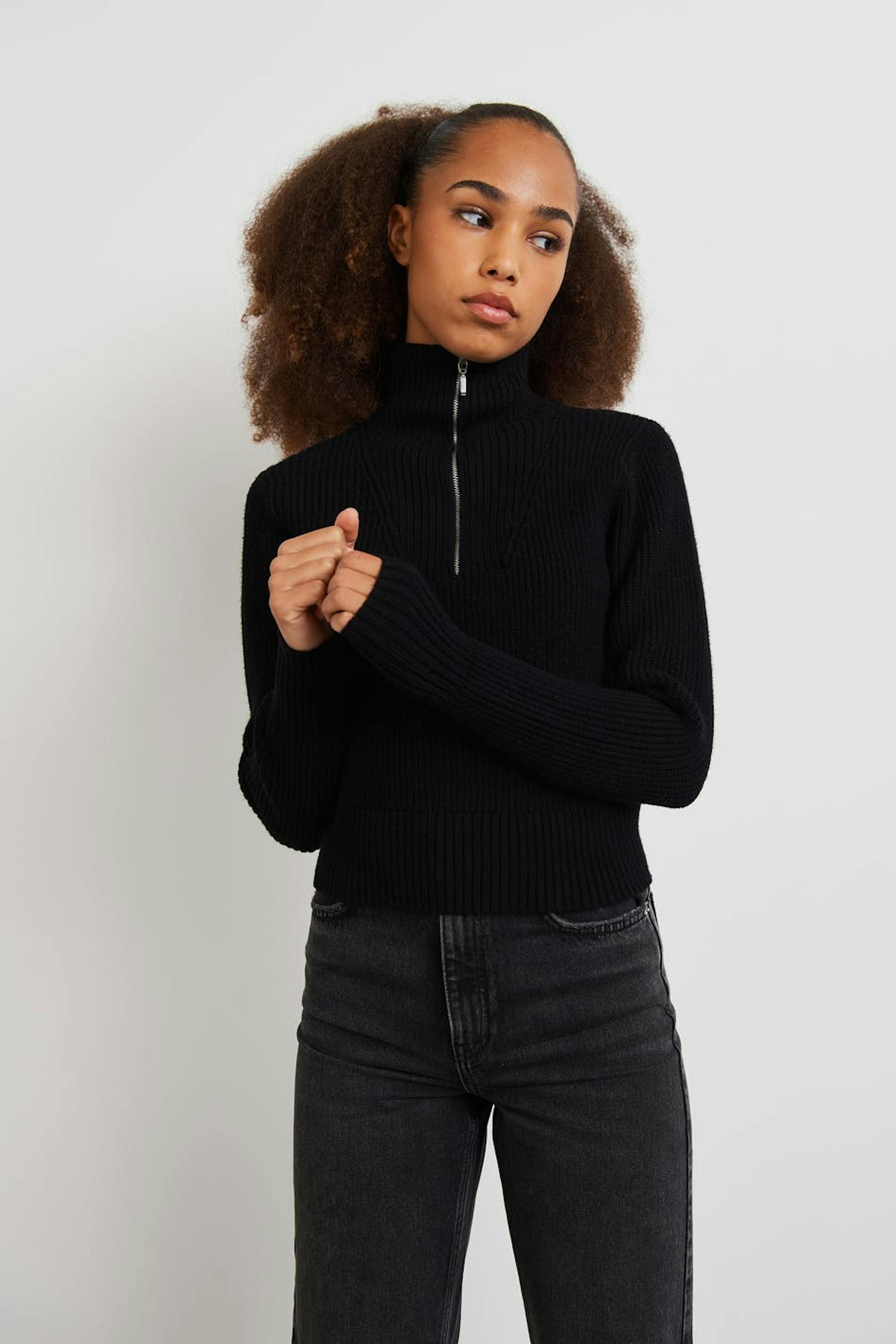 Strikket trøje fra Young-sortimentet vårt med en figursyet pasform. Trøjen er sort og har en blød kvalitet. Den har en halv lynlås på toppen.