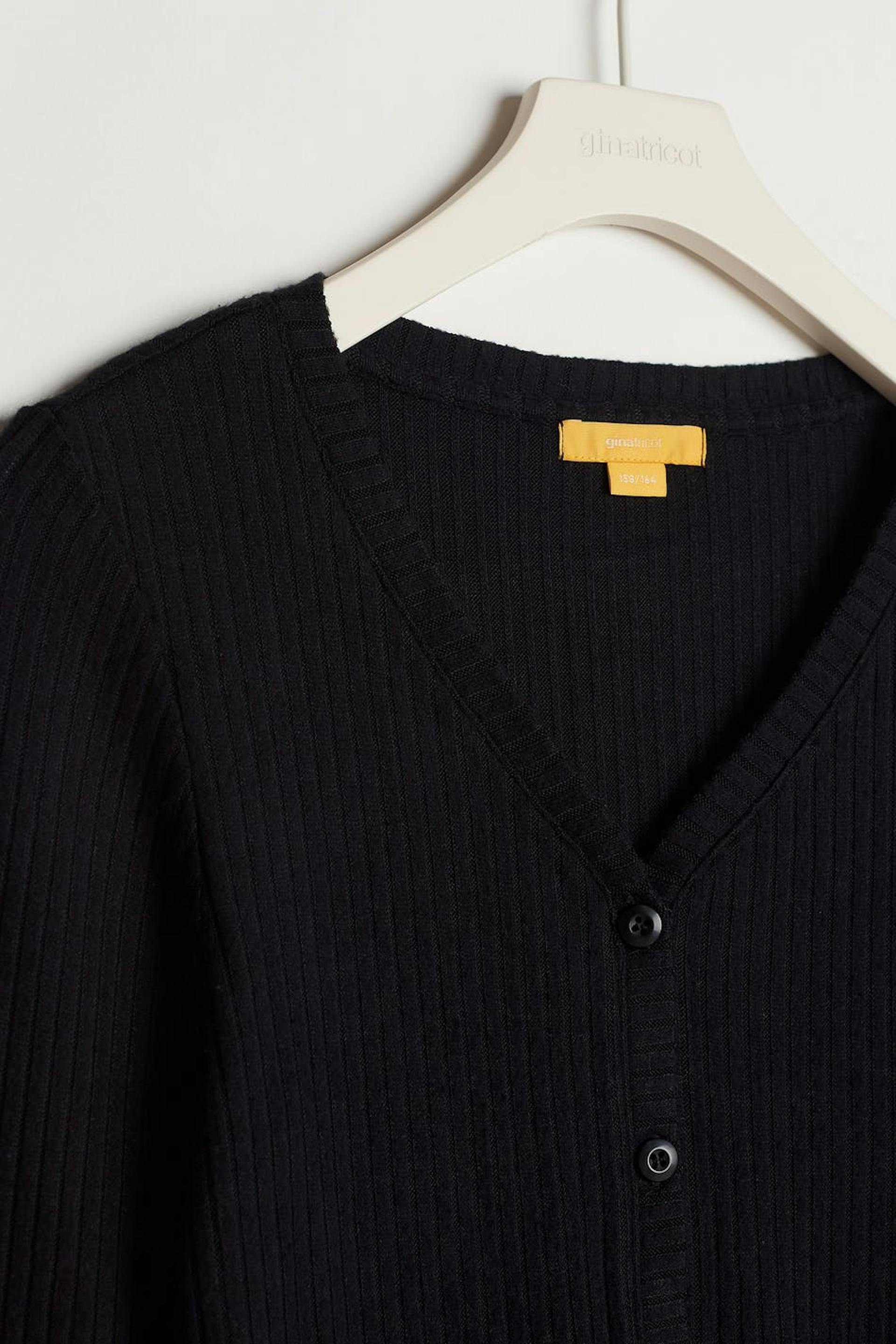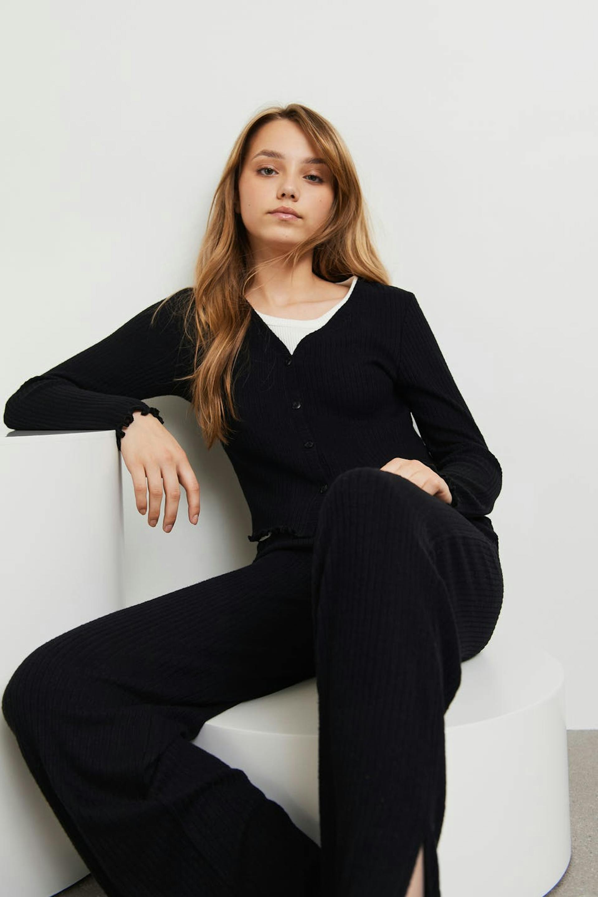 Ribbet cardigan fra Young-sortimentet vårt med en figursyet pasform. Cardiganen er sort og har en v-hals. Den har en croppet længde og små volanter nederst og på ærmeafslutningerne.