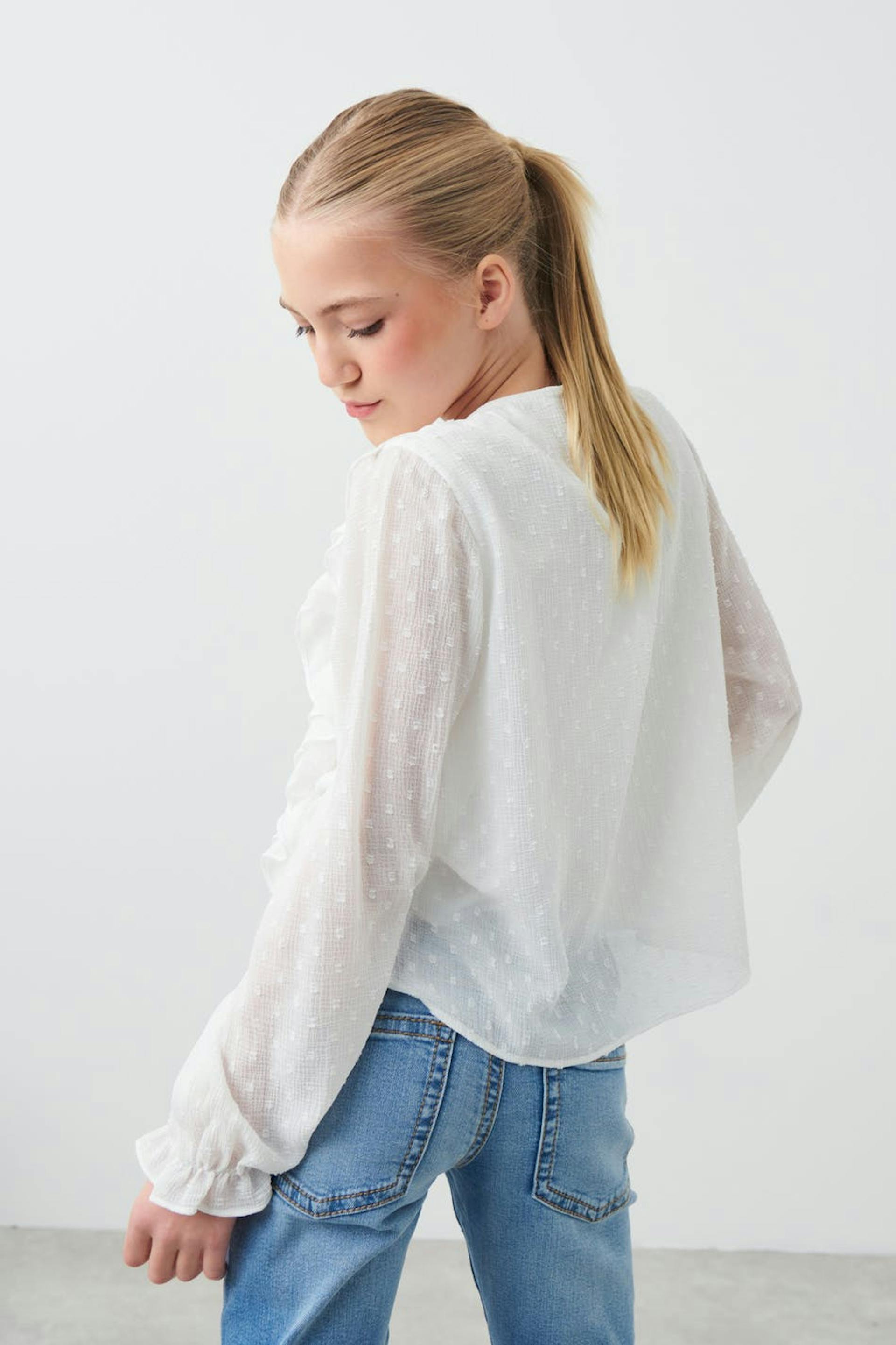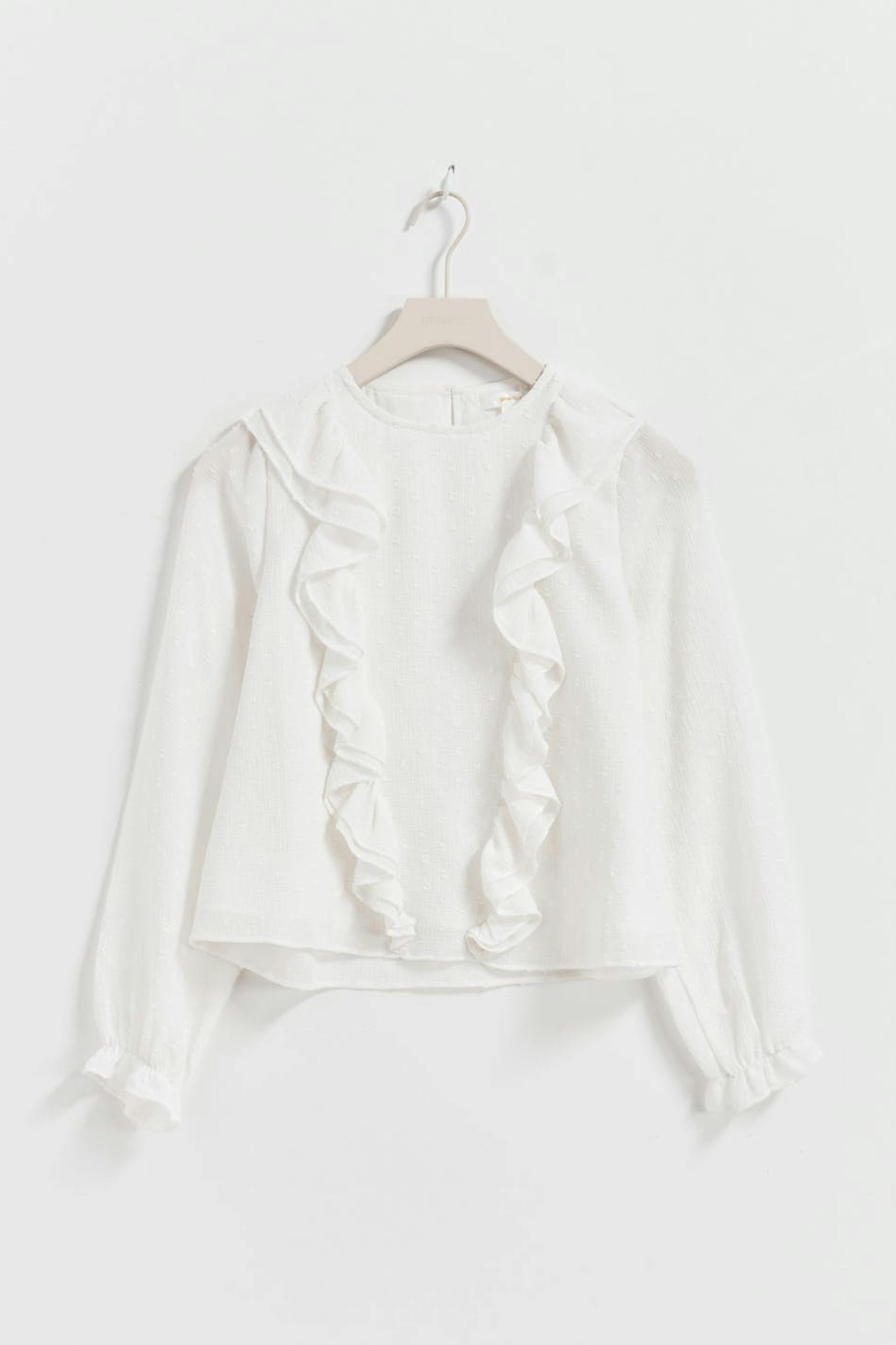 Foret bluse med volanter. Blusen er hvid og har bred pasform. Den har normal længde, knapstolpe i nakken og langt ærme med elastiske ribber.