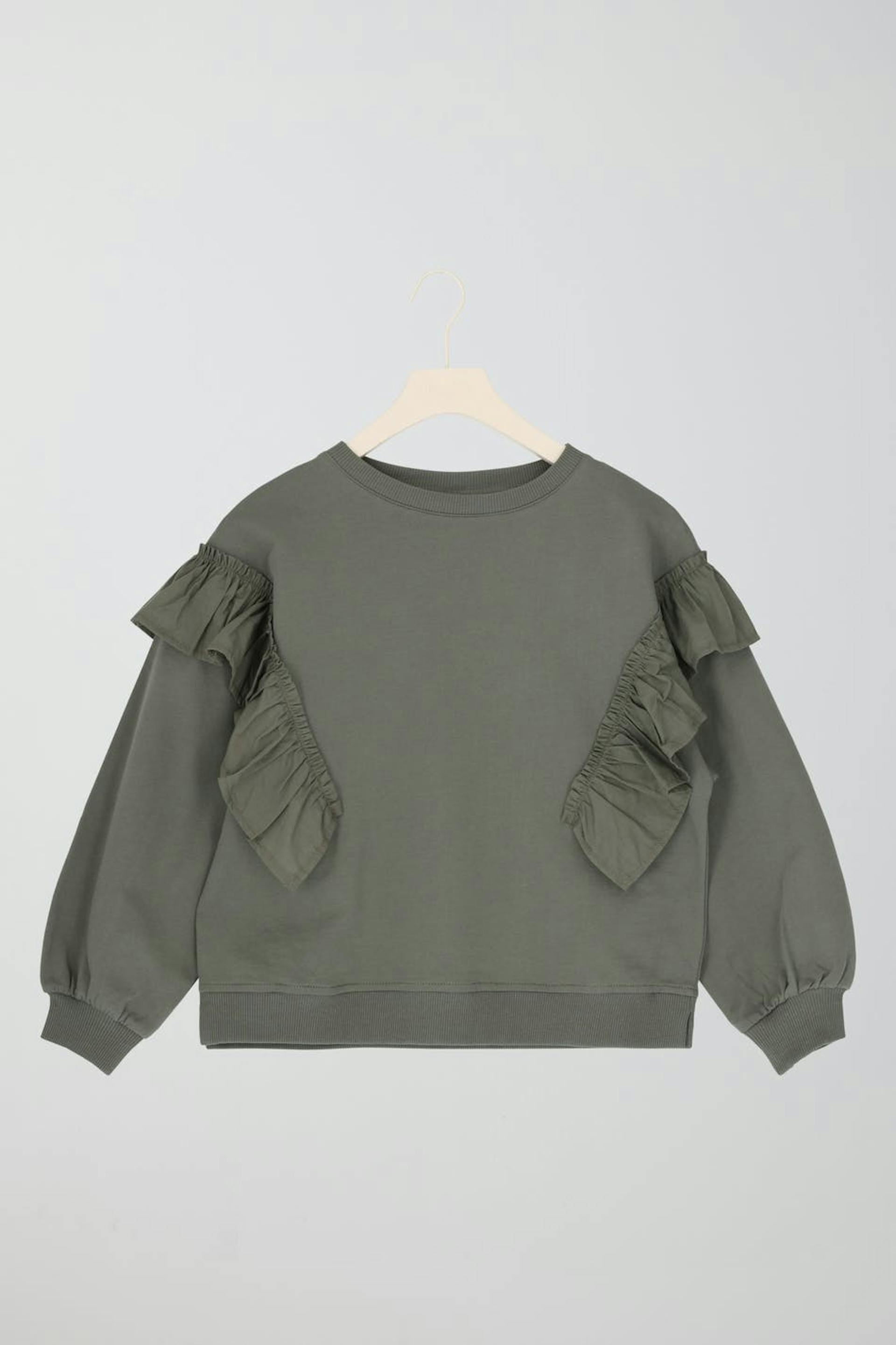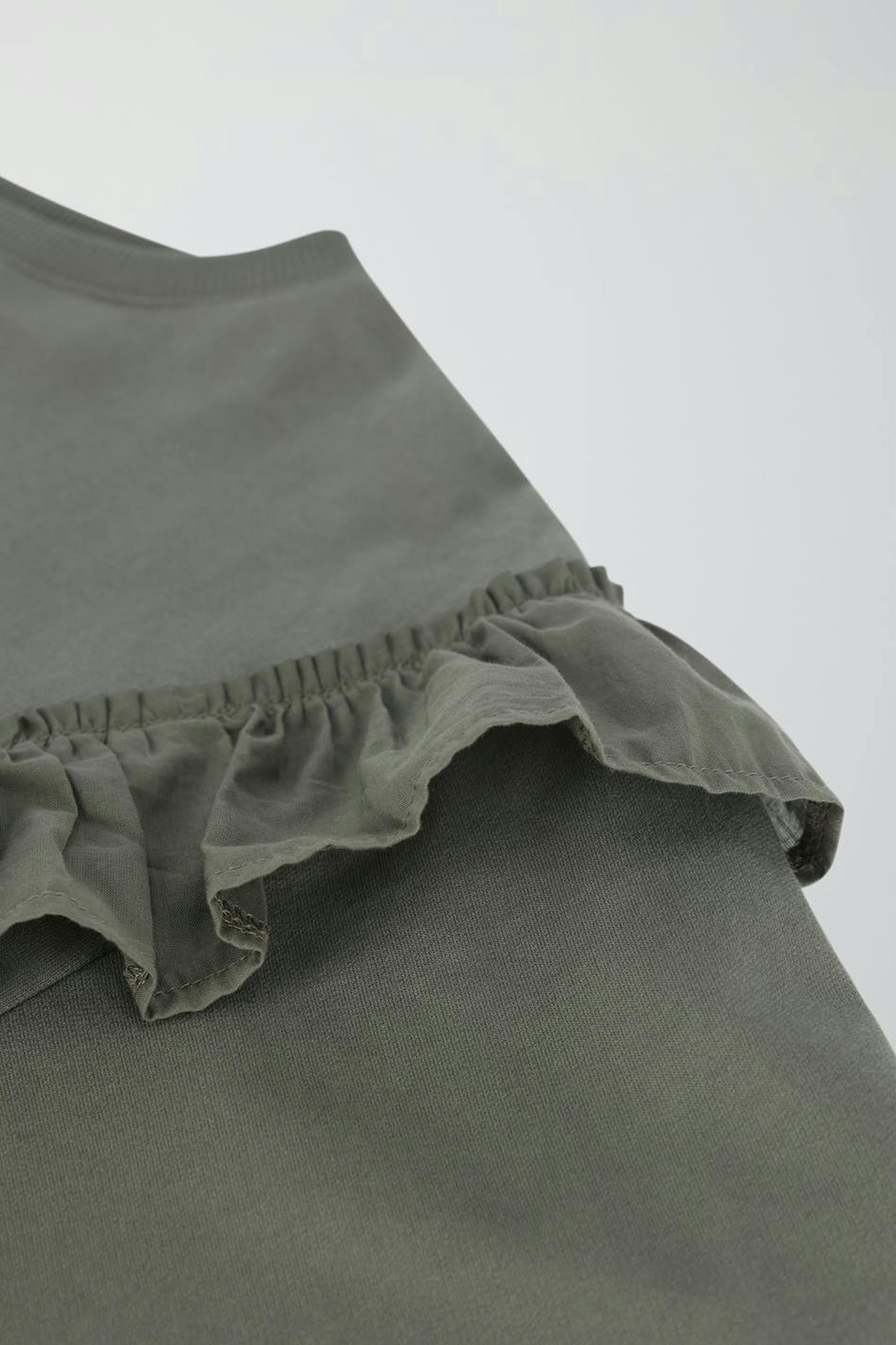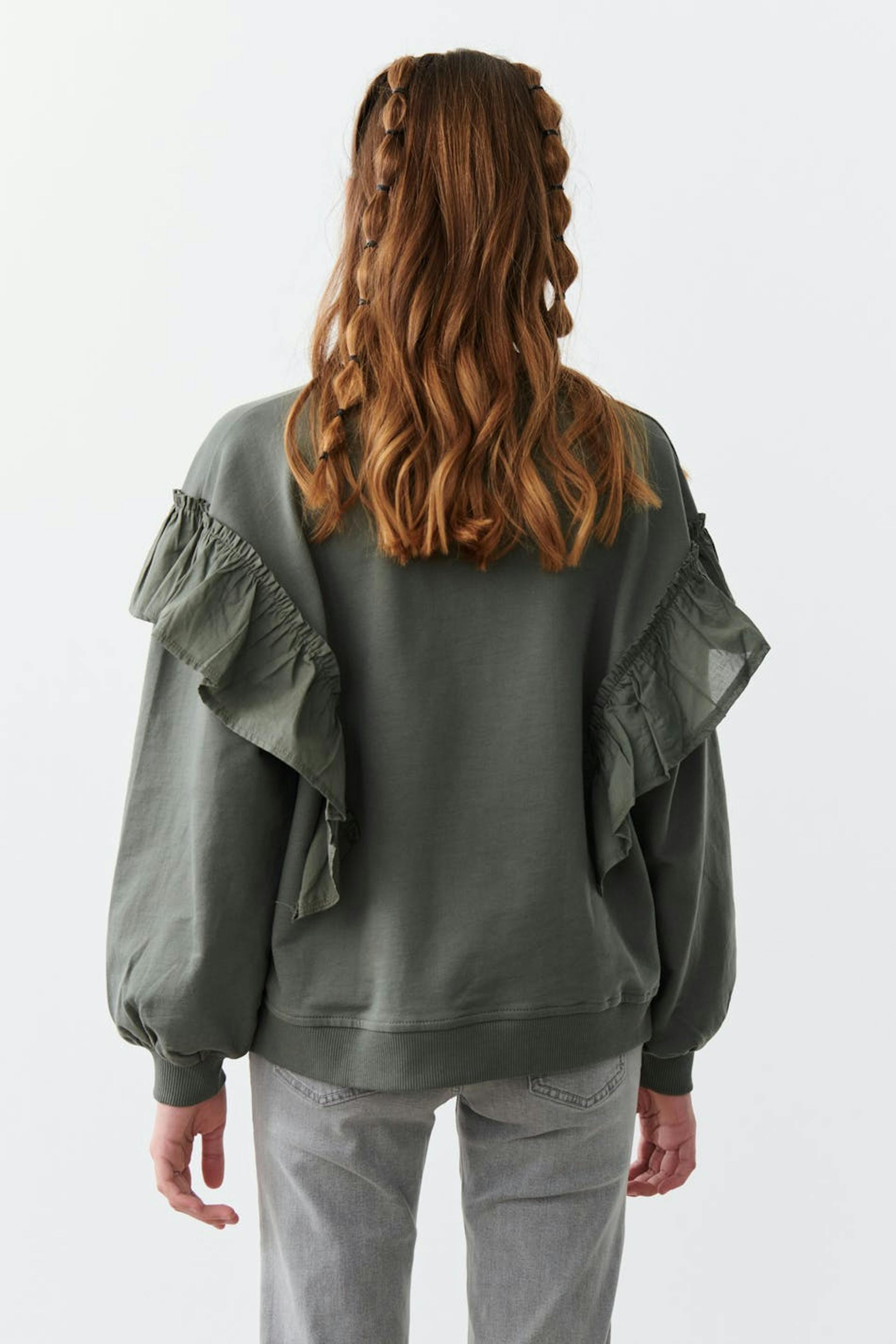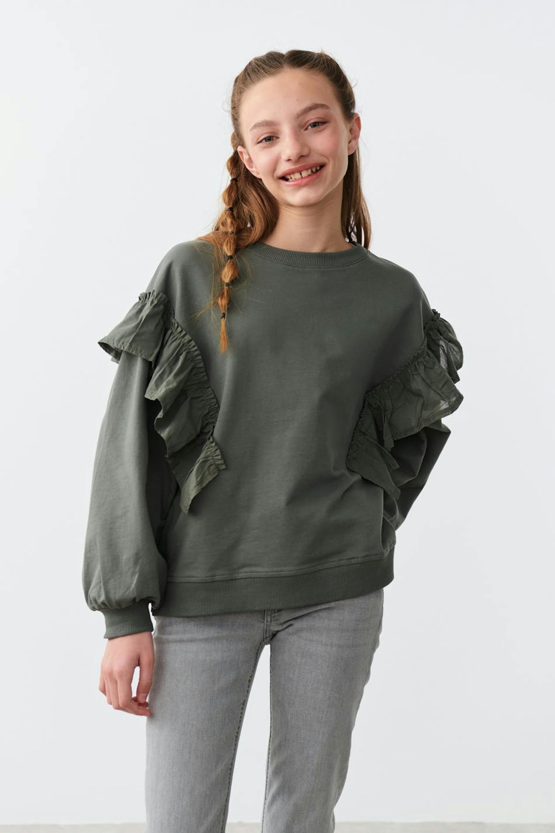 Trøje fra Gina Tricot Young i jersey med volanter på ærmerne. Trøjen er grøn og har ribstrikning nederst og på ærmeafslutningerne.
