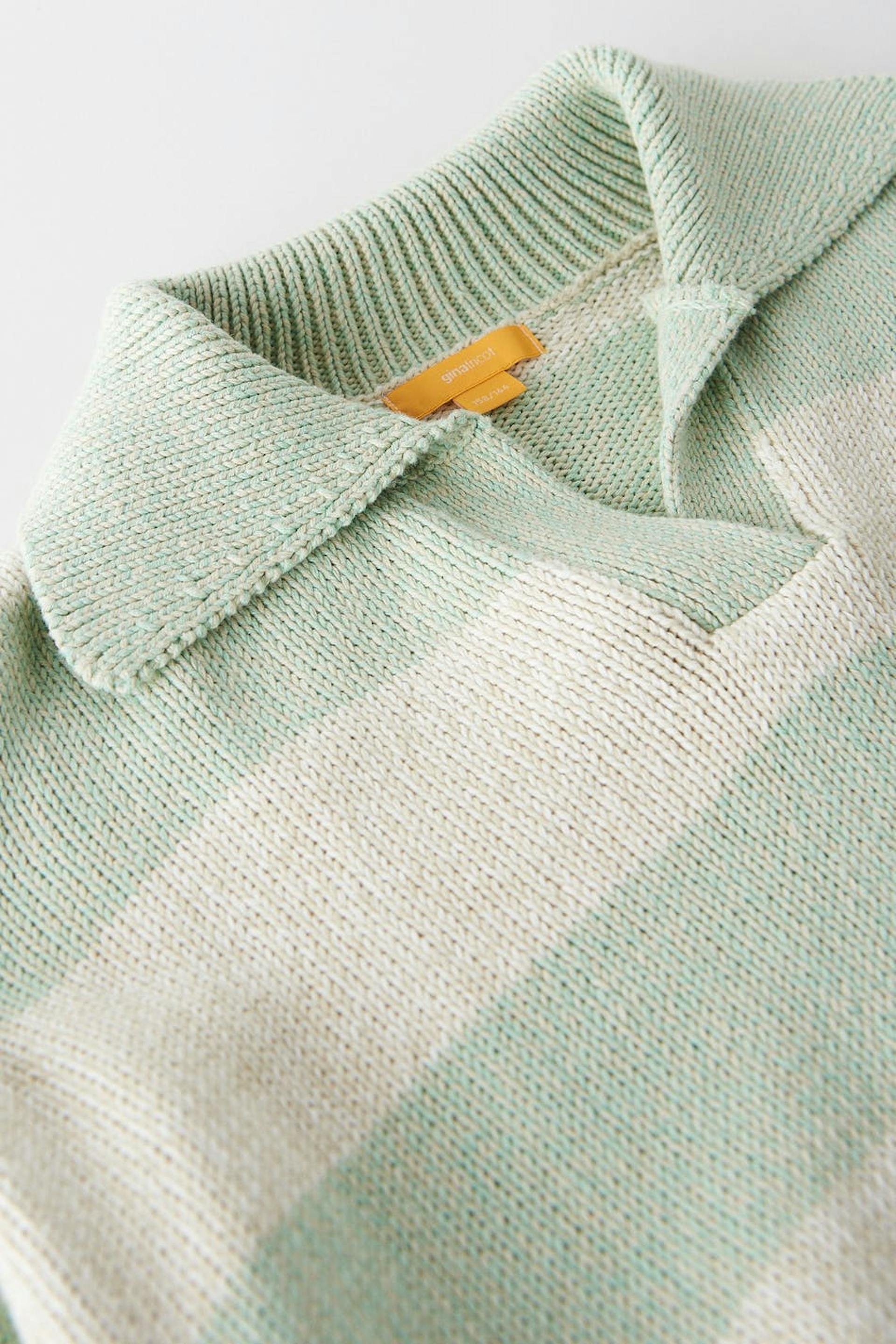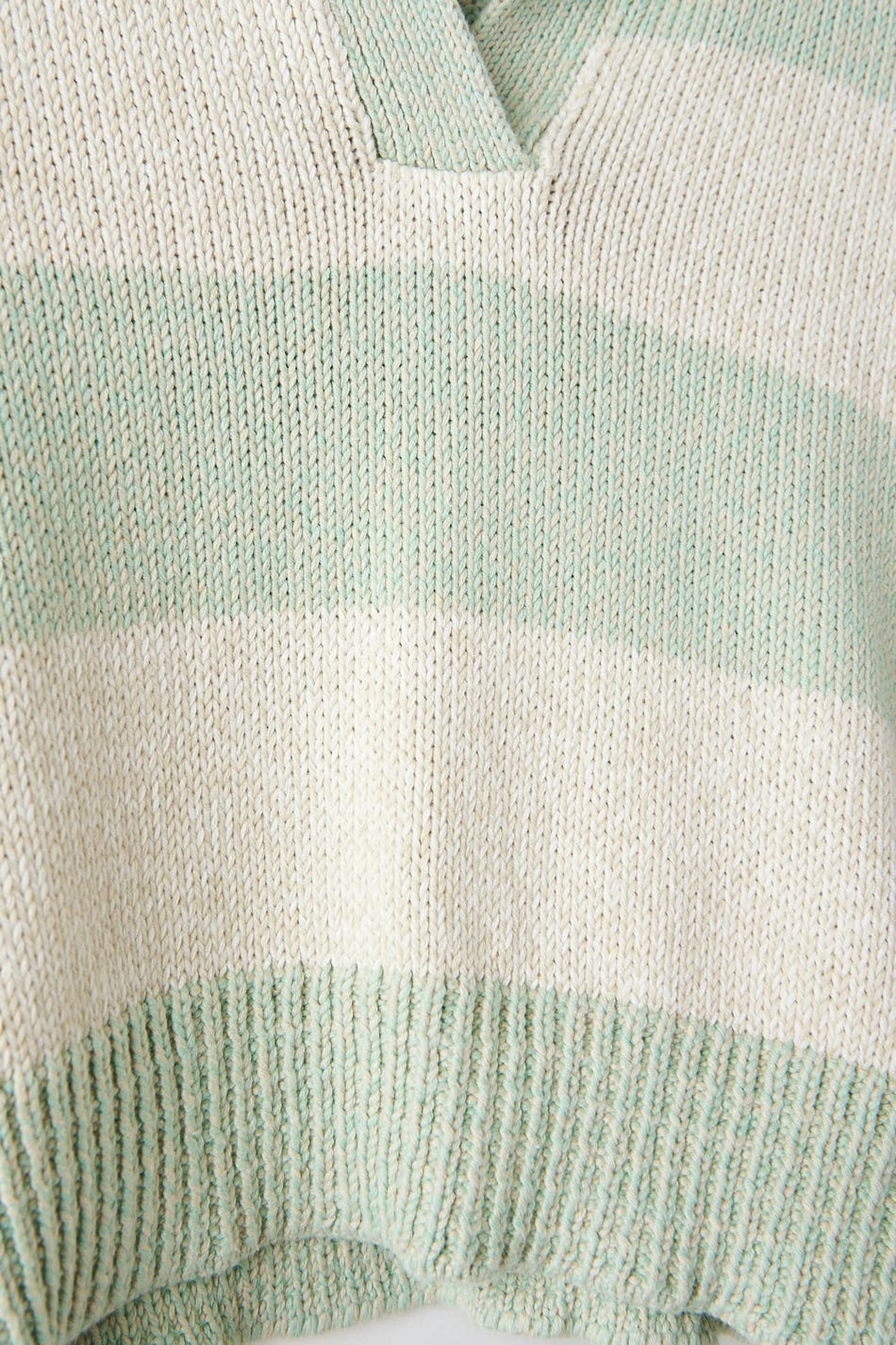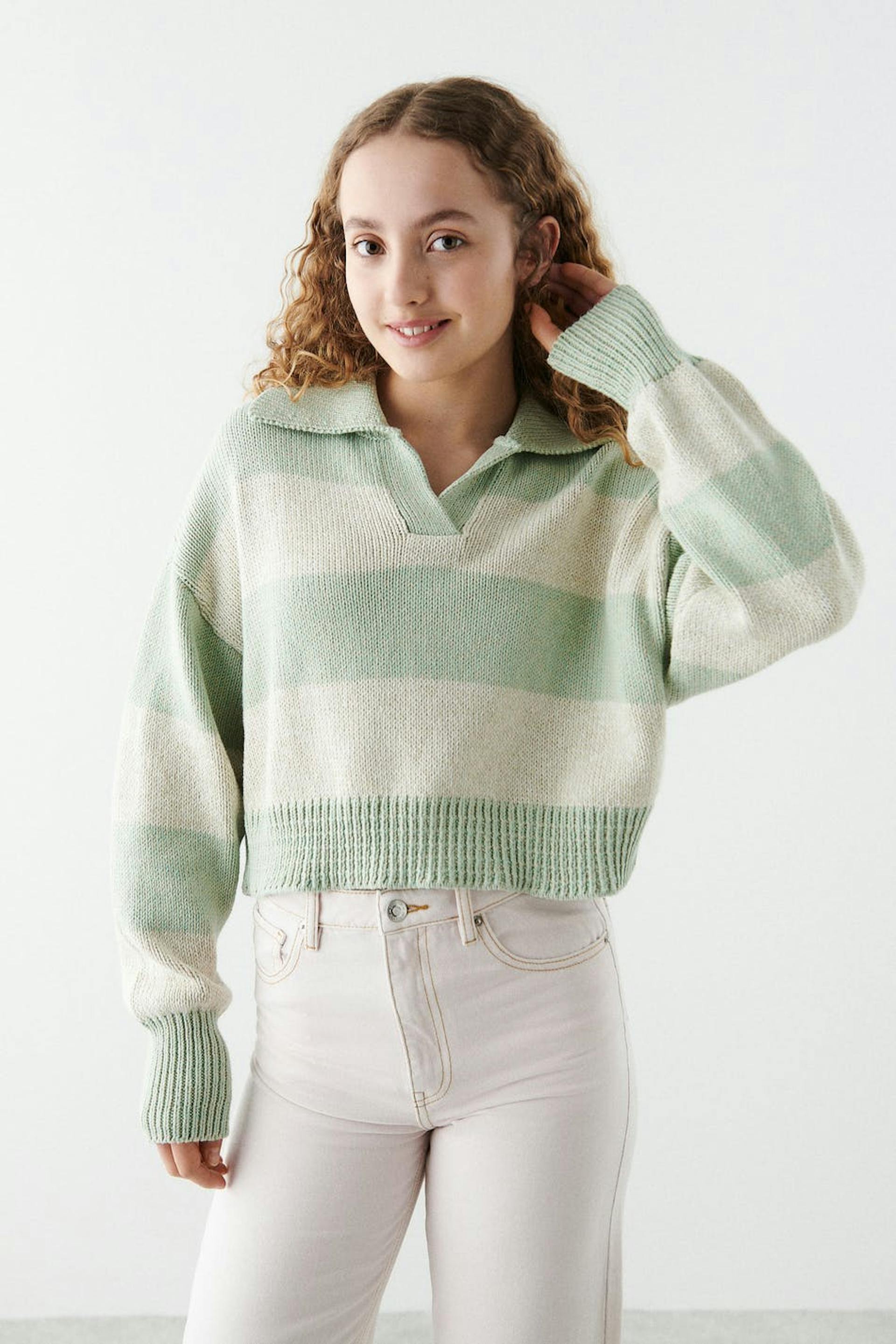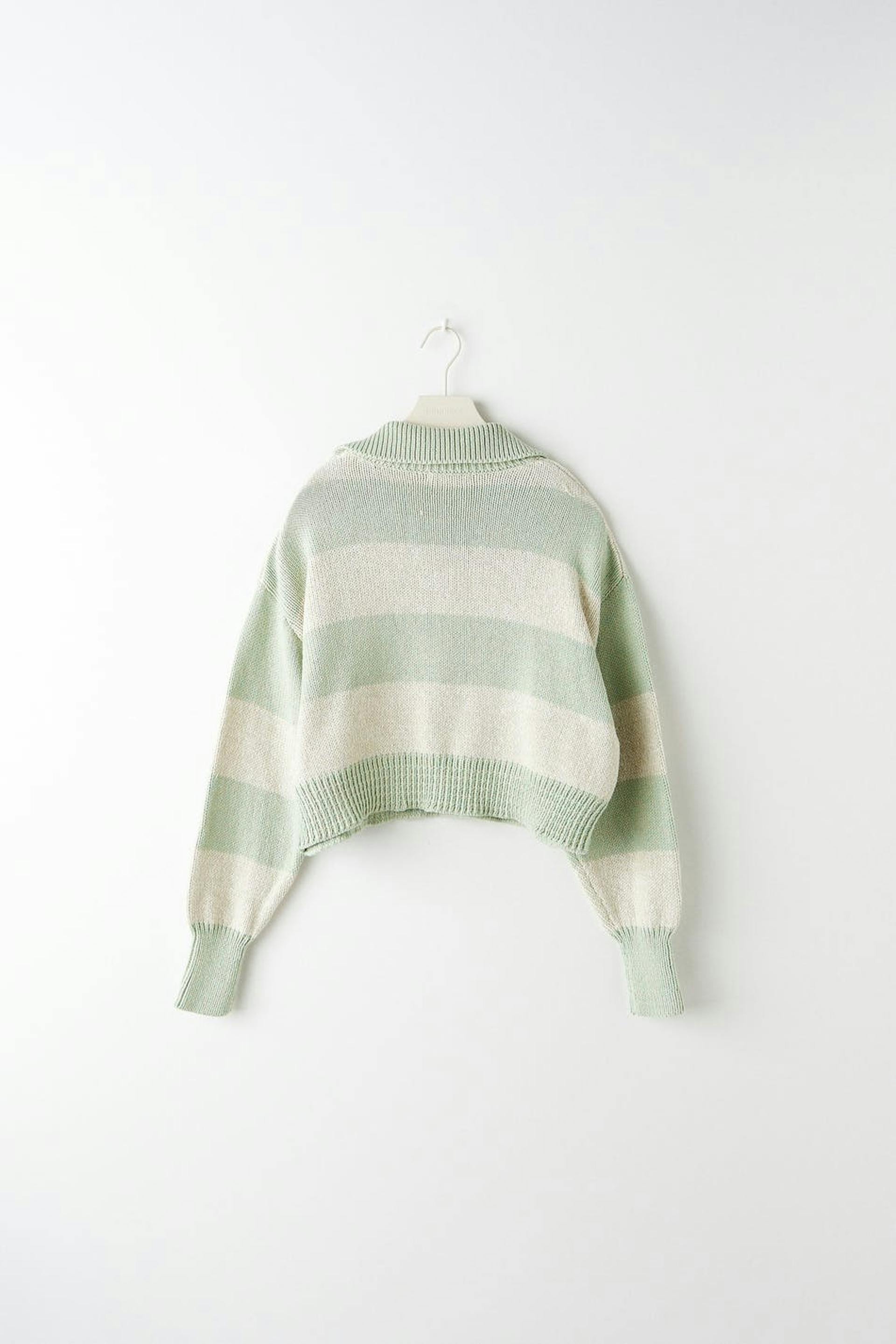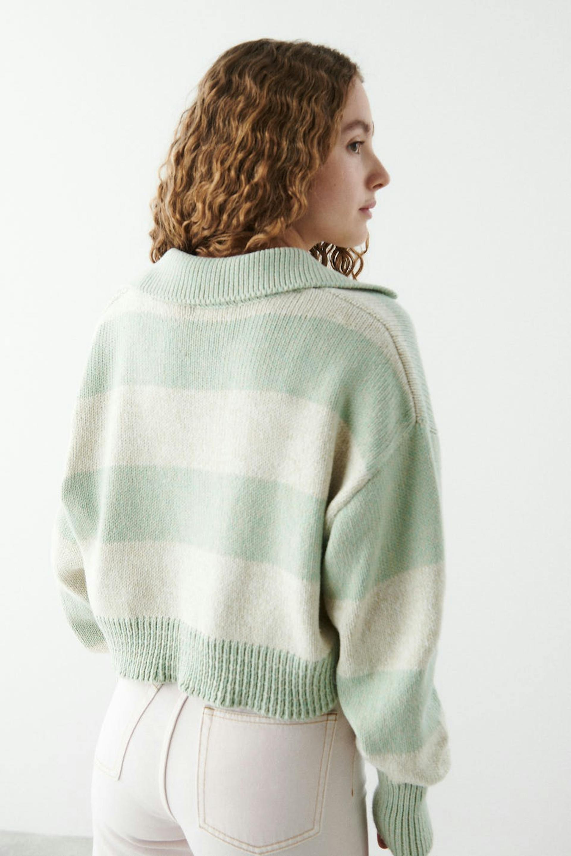 Stribet striktrøje fra Young Gina Tricot med en oversize pasform. Trøjen er grøn og har stor krave. Den har lange ærmer og v-udskæring.