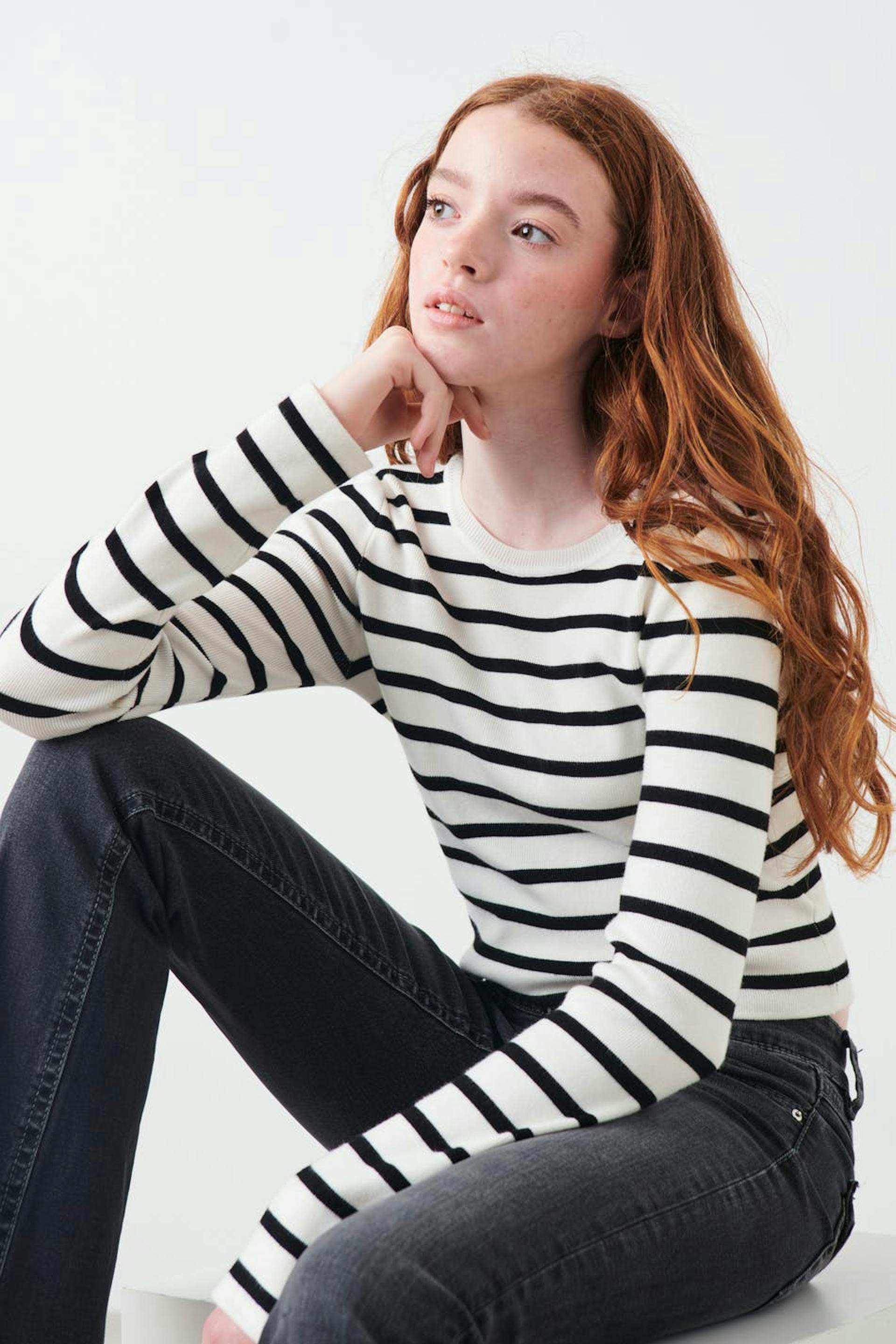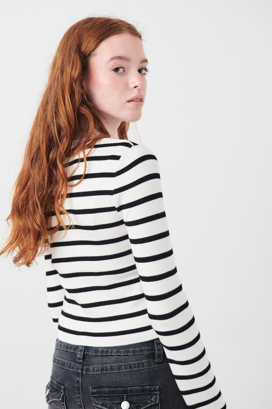 Stribet top fra Gina Tricot Young med figurnær pasform. Toppen er sort, hvid og langærmet. Den har rund udskæring og blød, ribbet kvalitet.