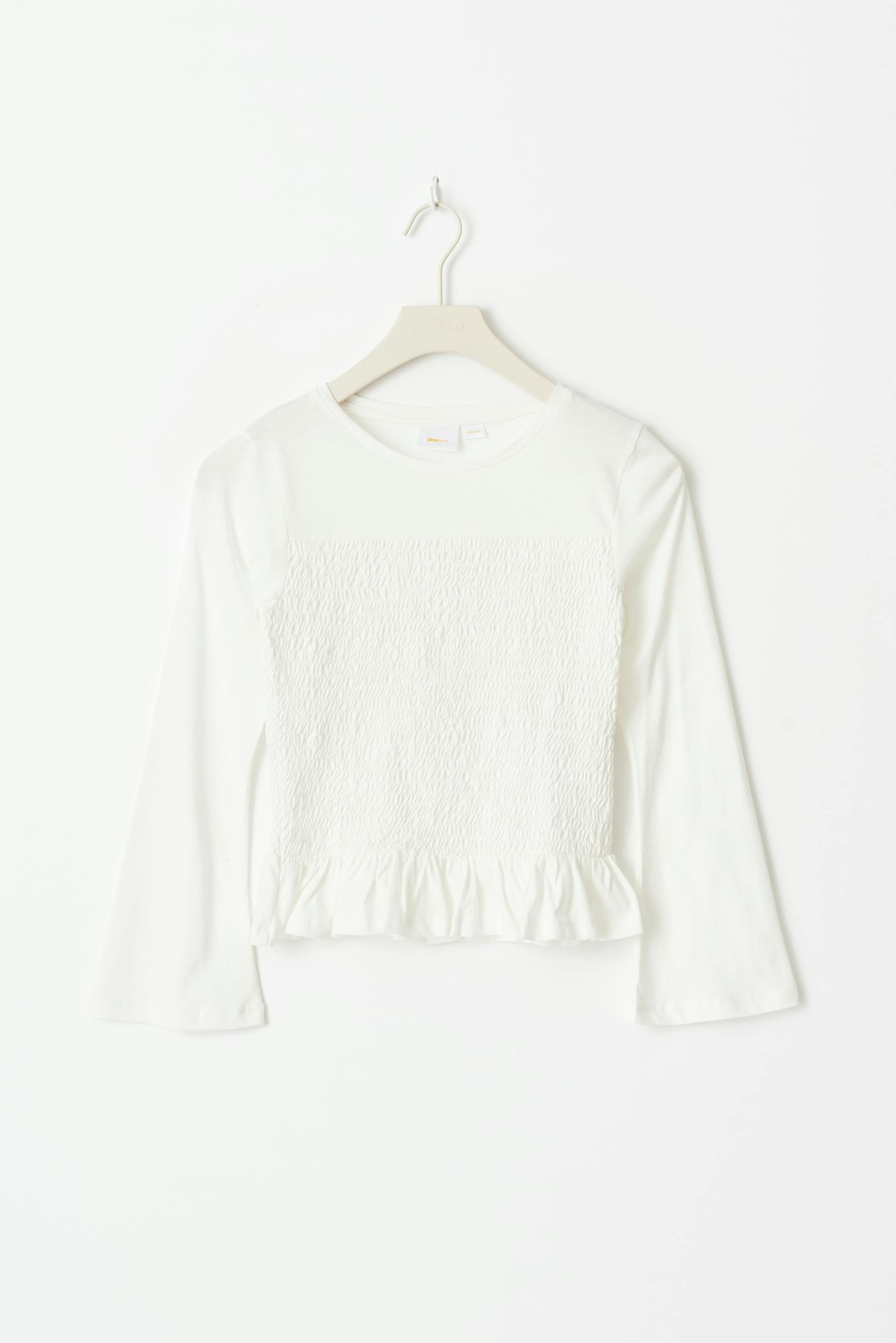Smocket top med langt ærme. Toppen er hvid og har volant ved den nederste kant. Den har rund udskæring og normal pasform.