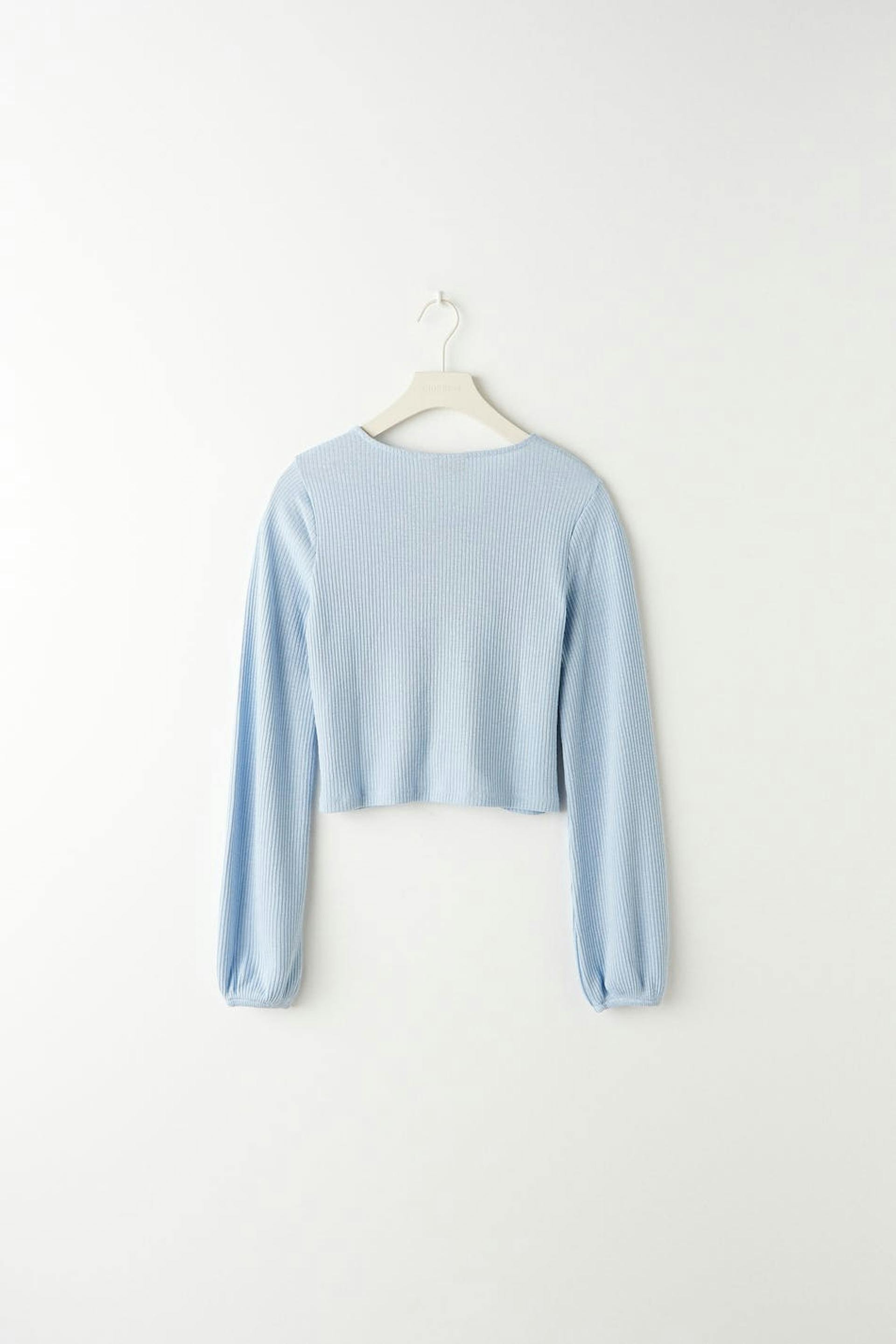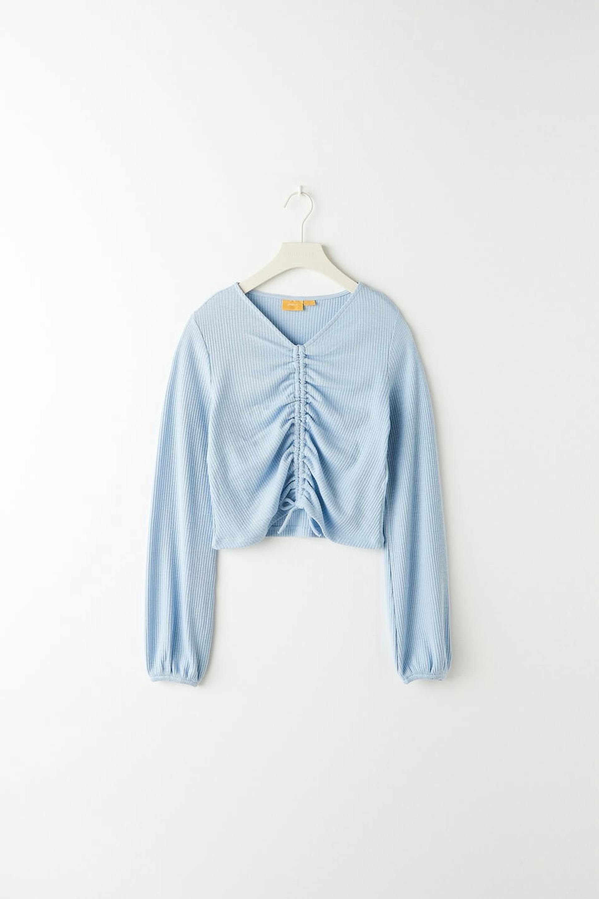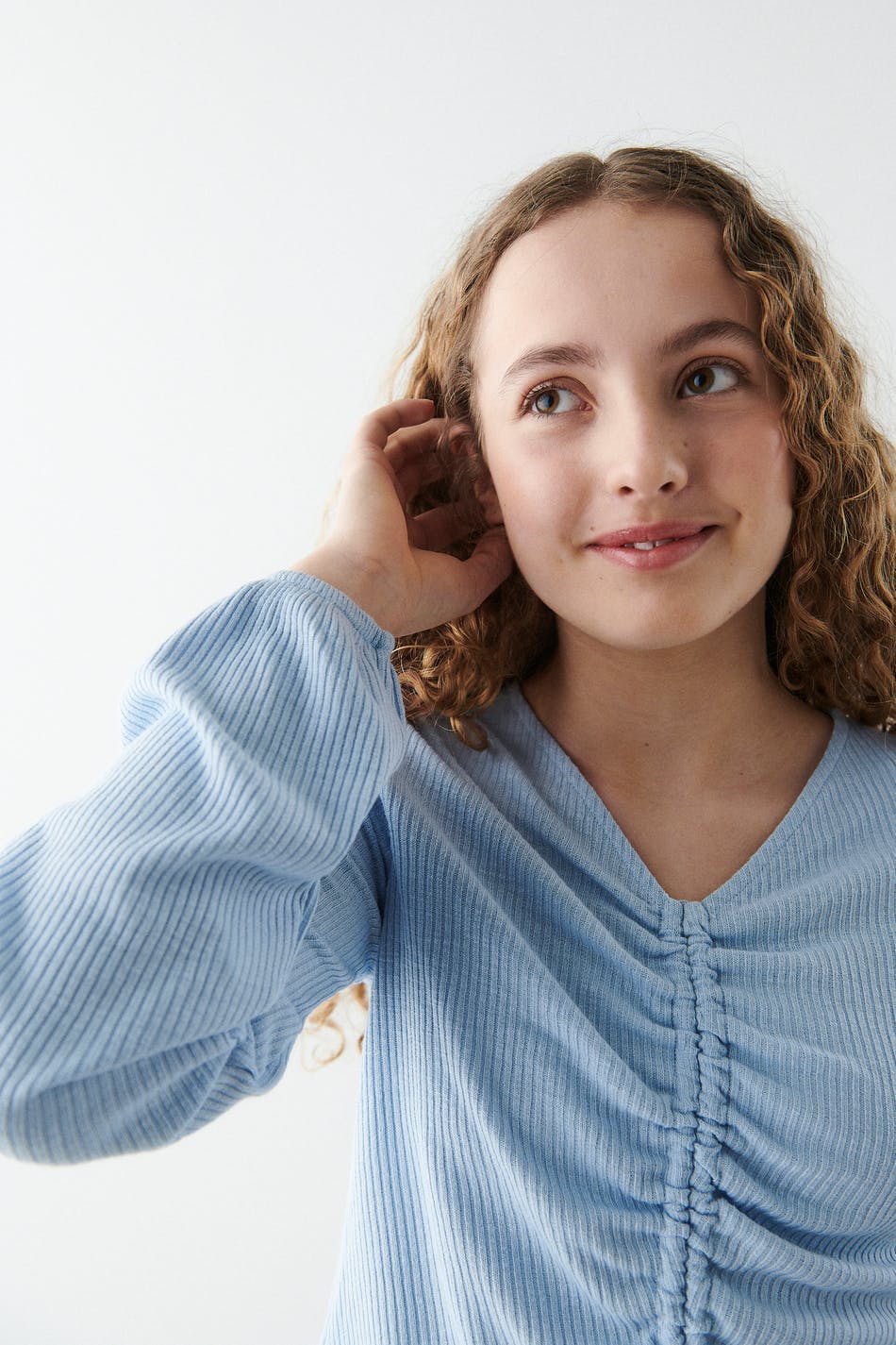 Langærmet top fra Young-sortimentet vårt med v-udskæring. Toppen er blå og har en normal pasform. Den har en ribbet kvalitet i jersey, justérbar træksnørre foran med bindbart bånd ved sømmen og ballonærmer med elastik på ærmeafslutningerne.