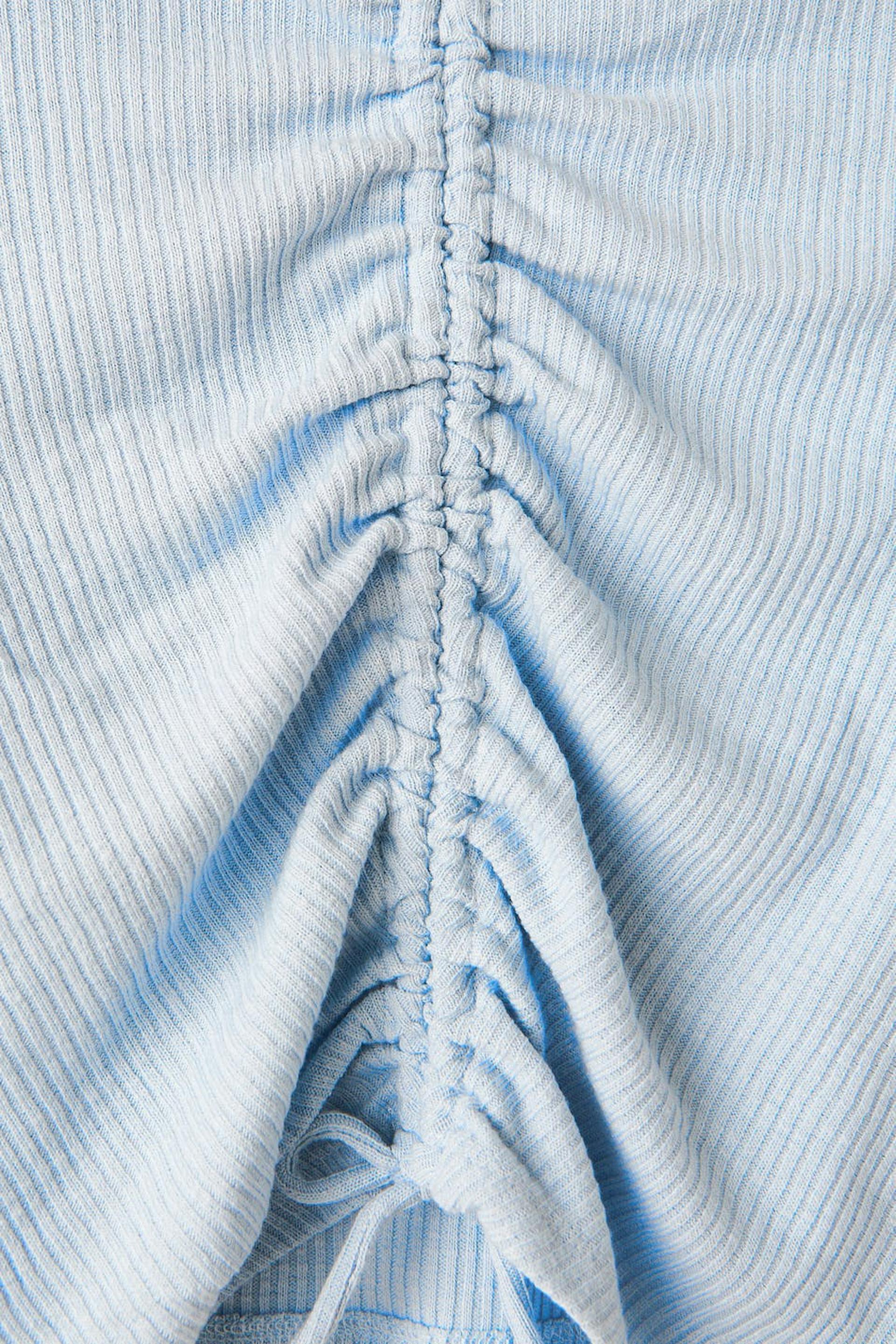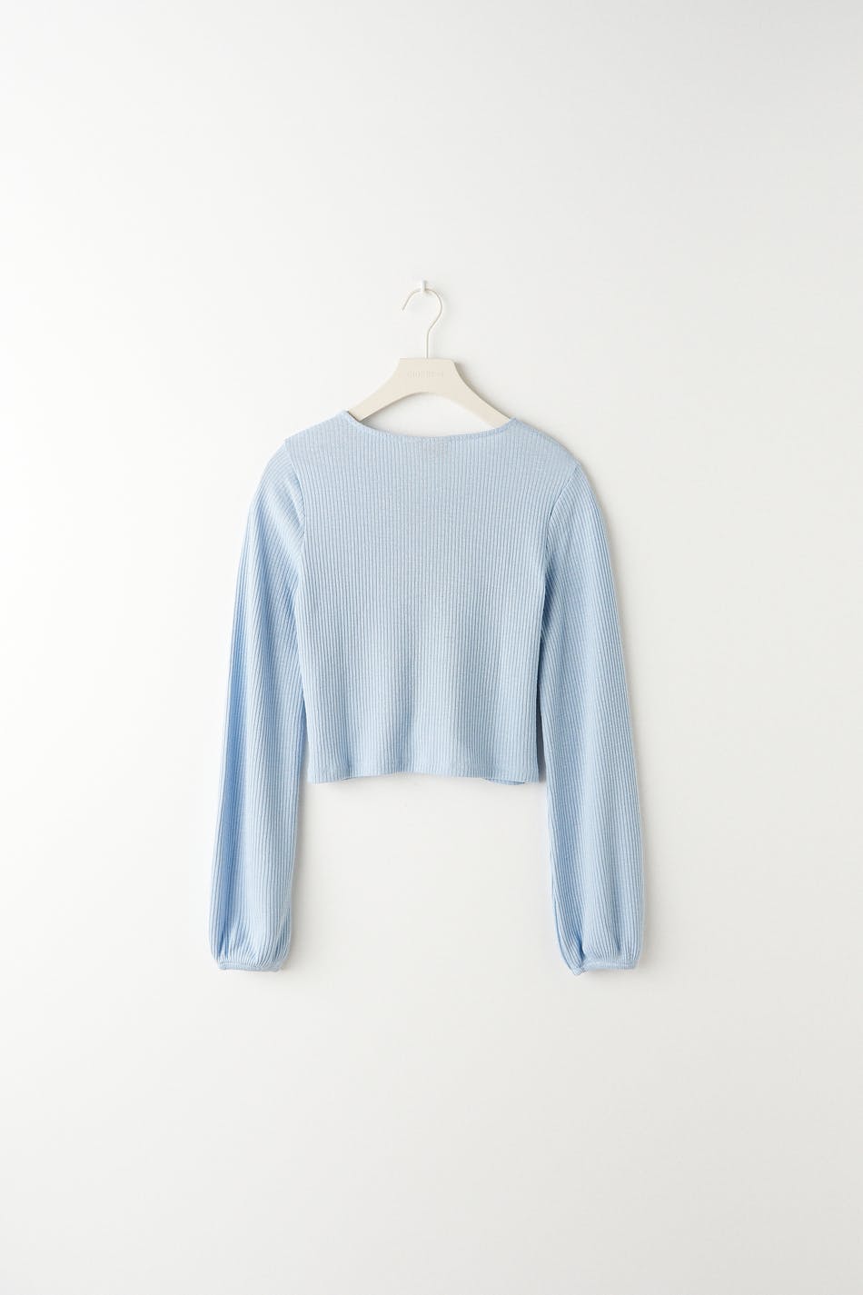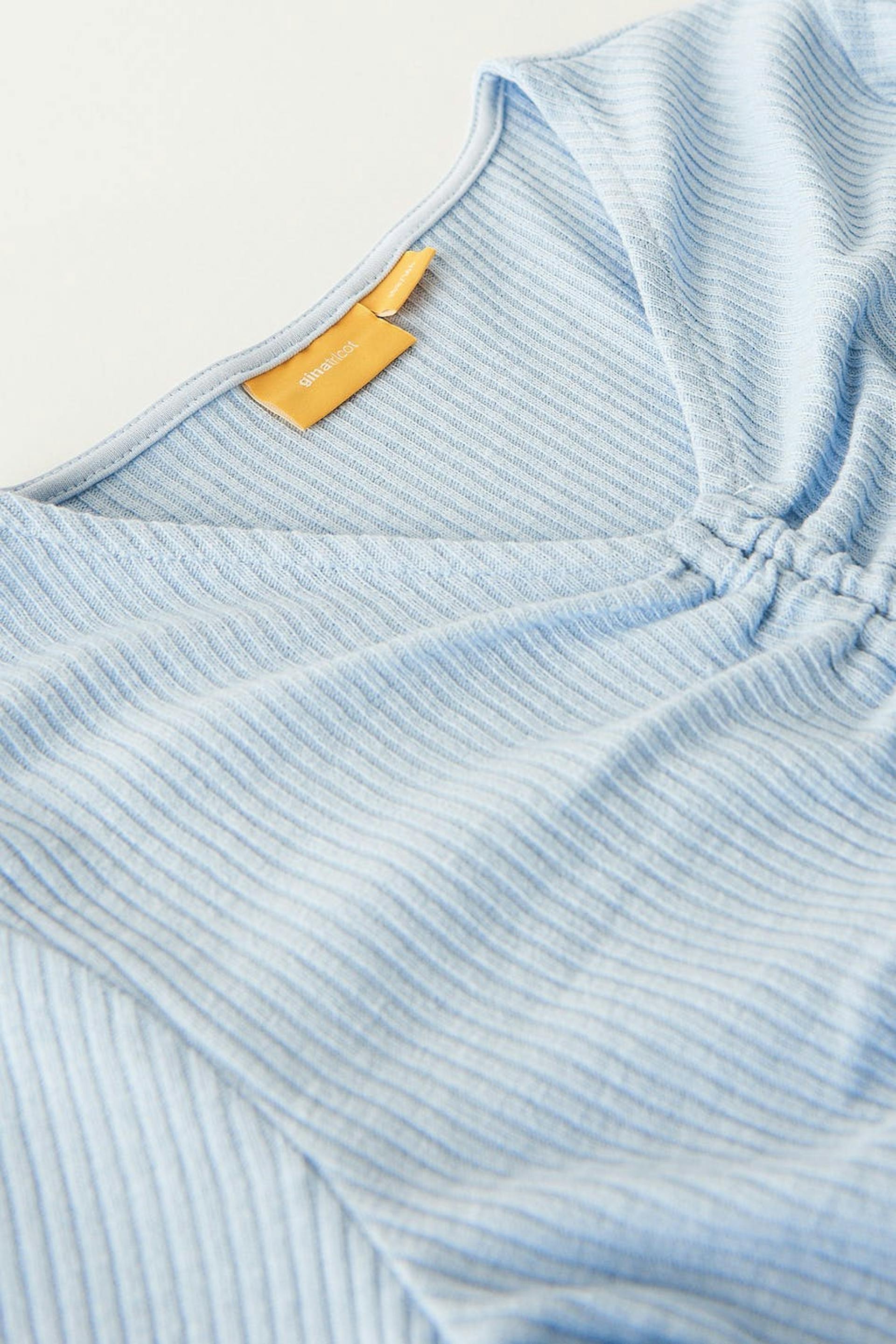 Langærmet top fra Young-sortimentet vårt med v-udskæring. Toppen er blå og har en normal pasform. Den har en ribbet kvalitet i jersey, justérbar træksnørre foran med bindbart bånd ved sømmen og ballonærmer med elastik på ærmeafslutningerne.