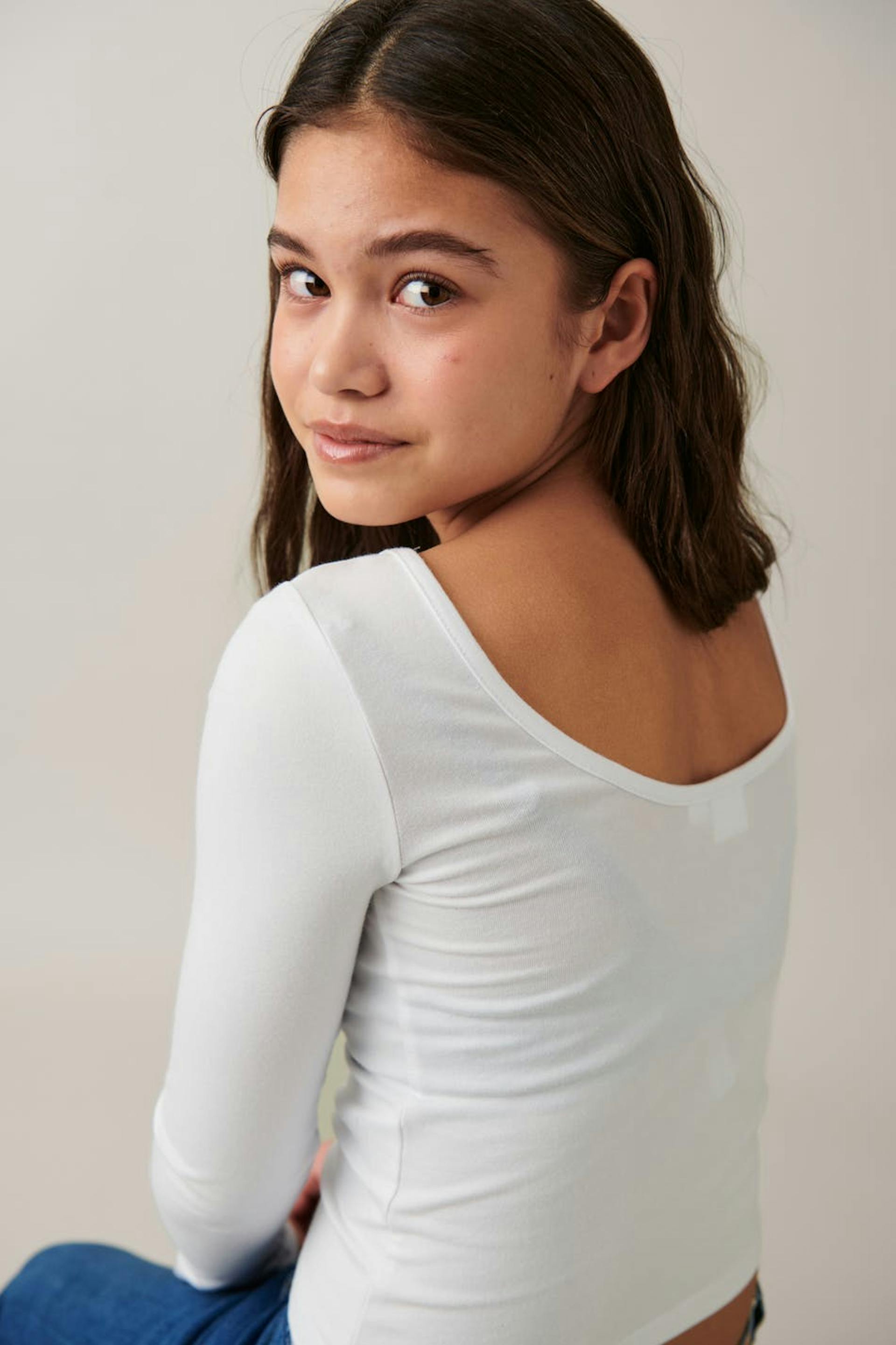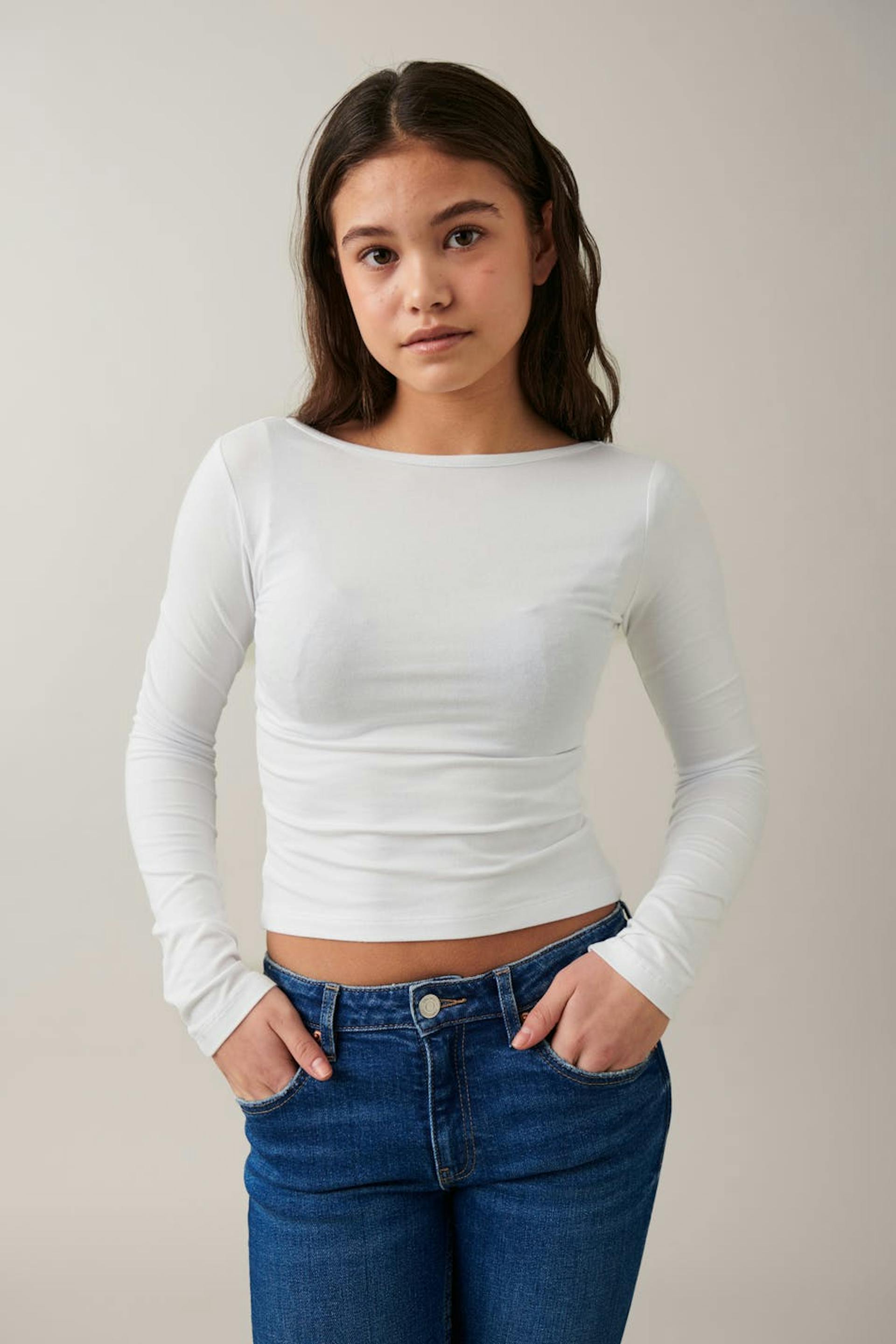 Langærmet top i blød trøje med figurnær pasform. Toppen er hvid og har dyb ryg.