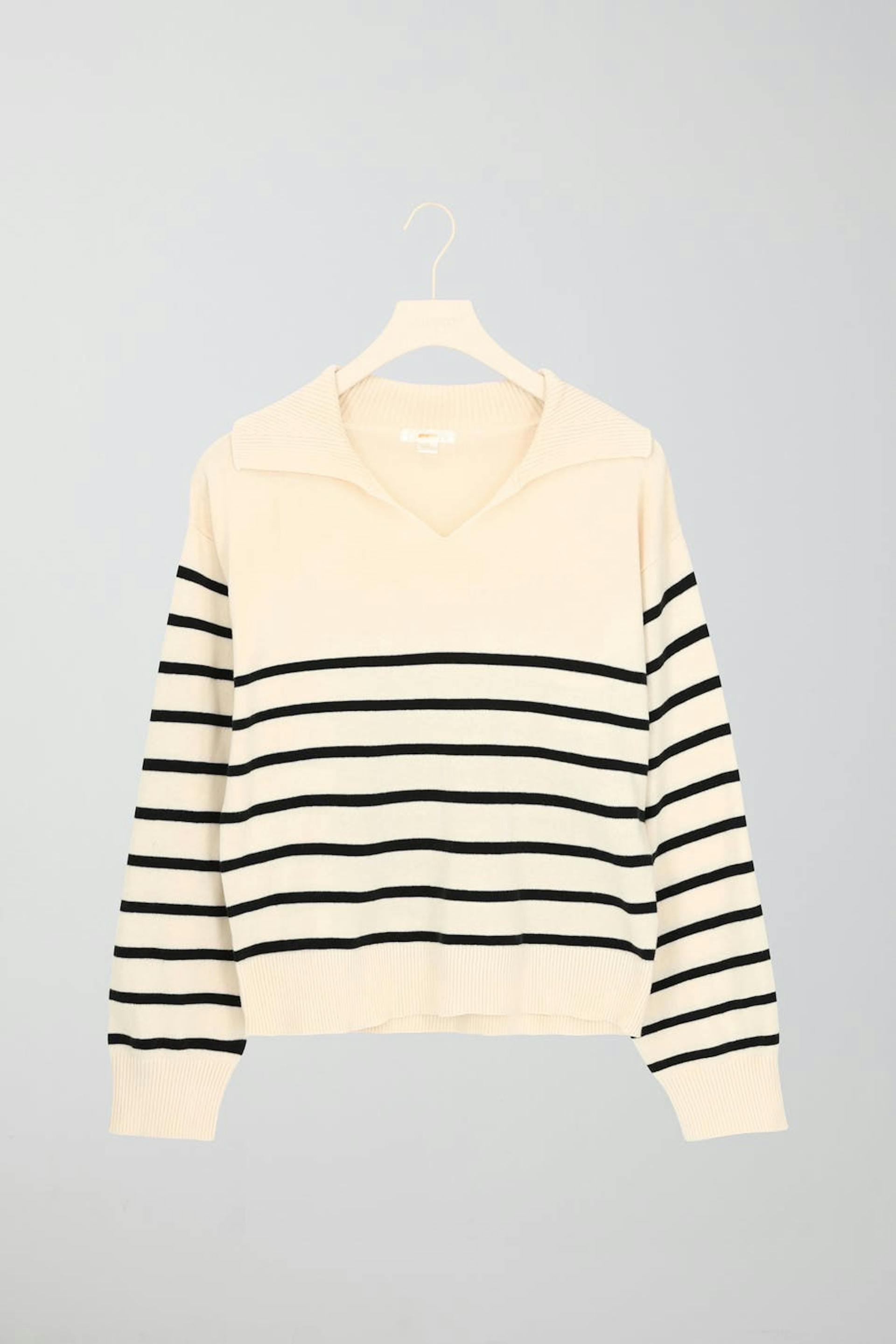 Stribet striktrøje fra Gina Tricot Young med krave. Trøjen er beige og har boxy pasform. Den har v-udskæring og ribstrik ved ærmekanter og ved den nederste kant.