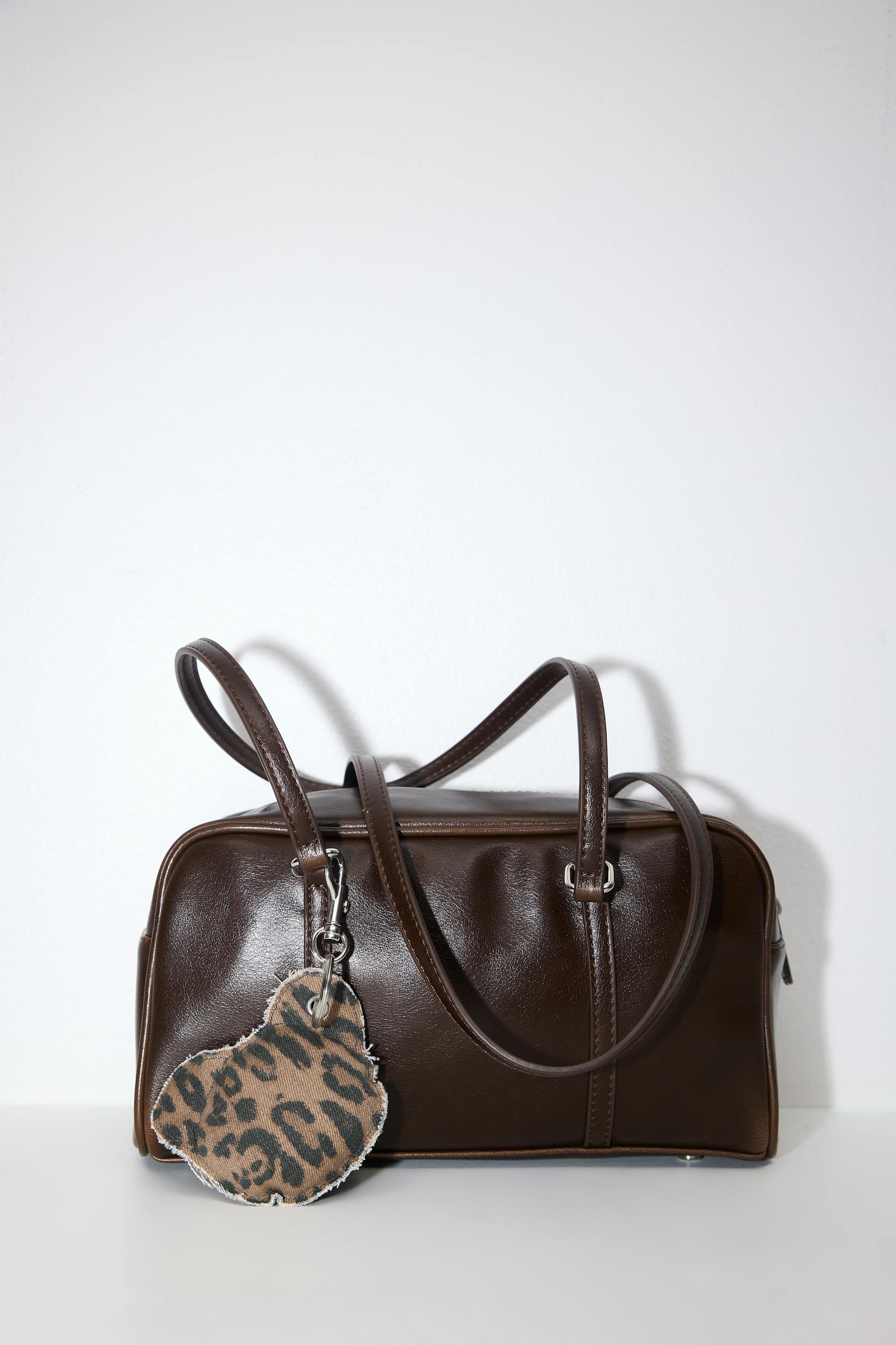 Leopard patterned bag charm in denim fabric with lobster clasp closure. The accessory is brown and has raw edges.