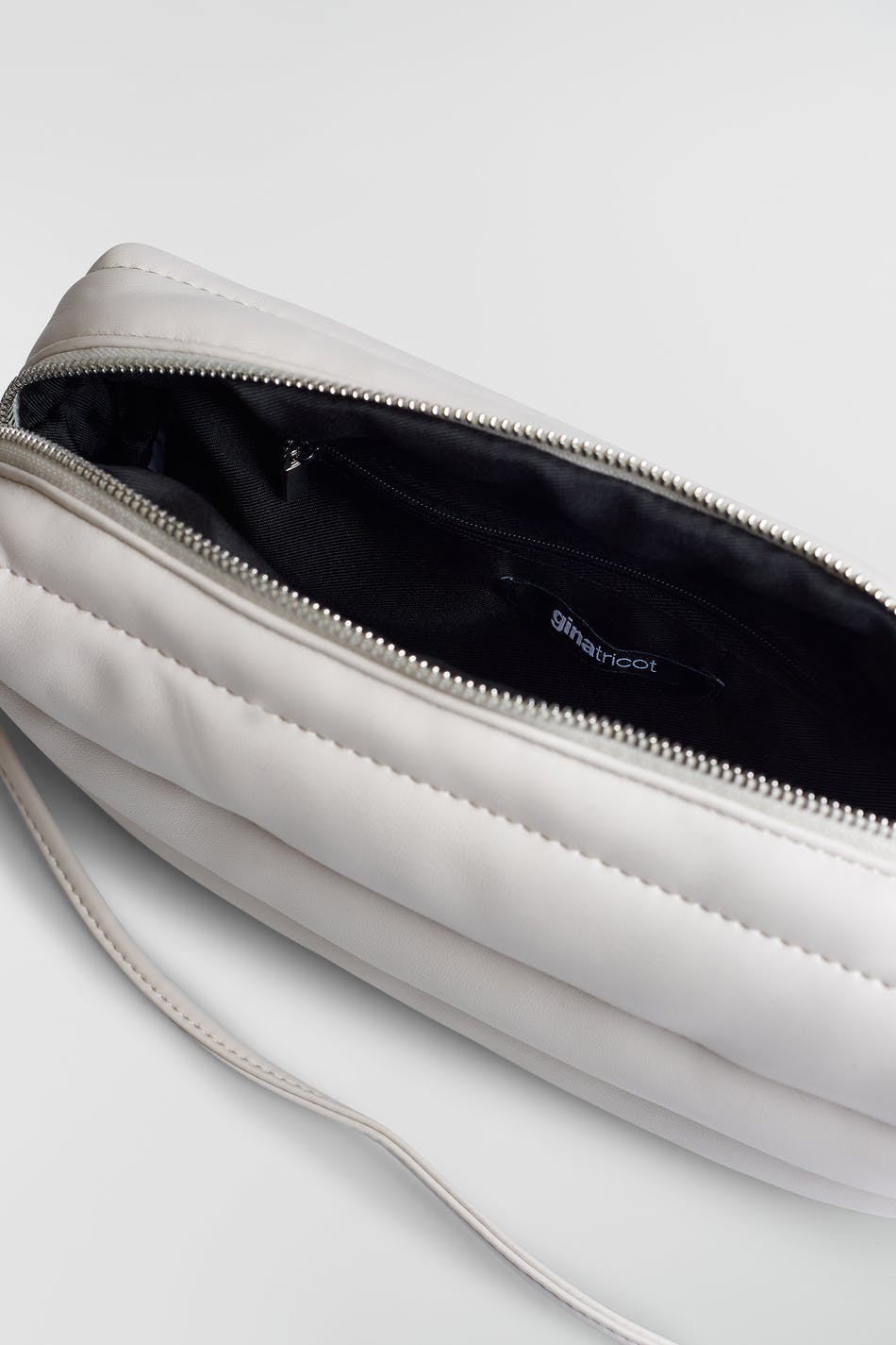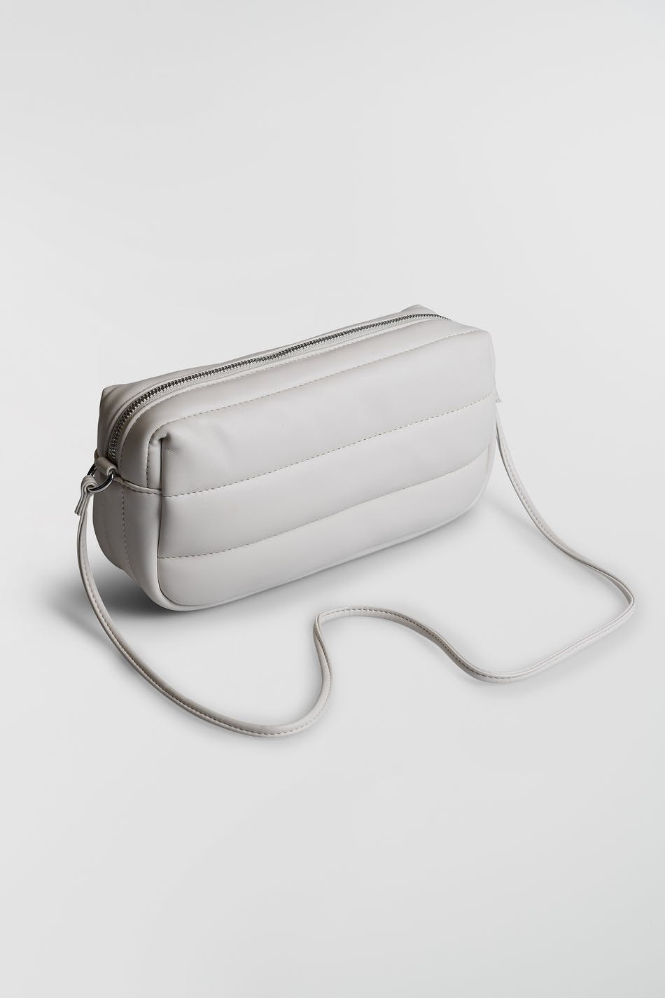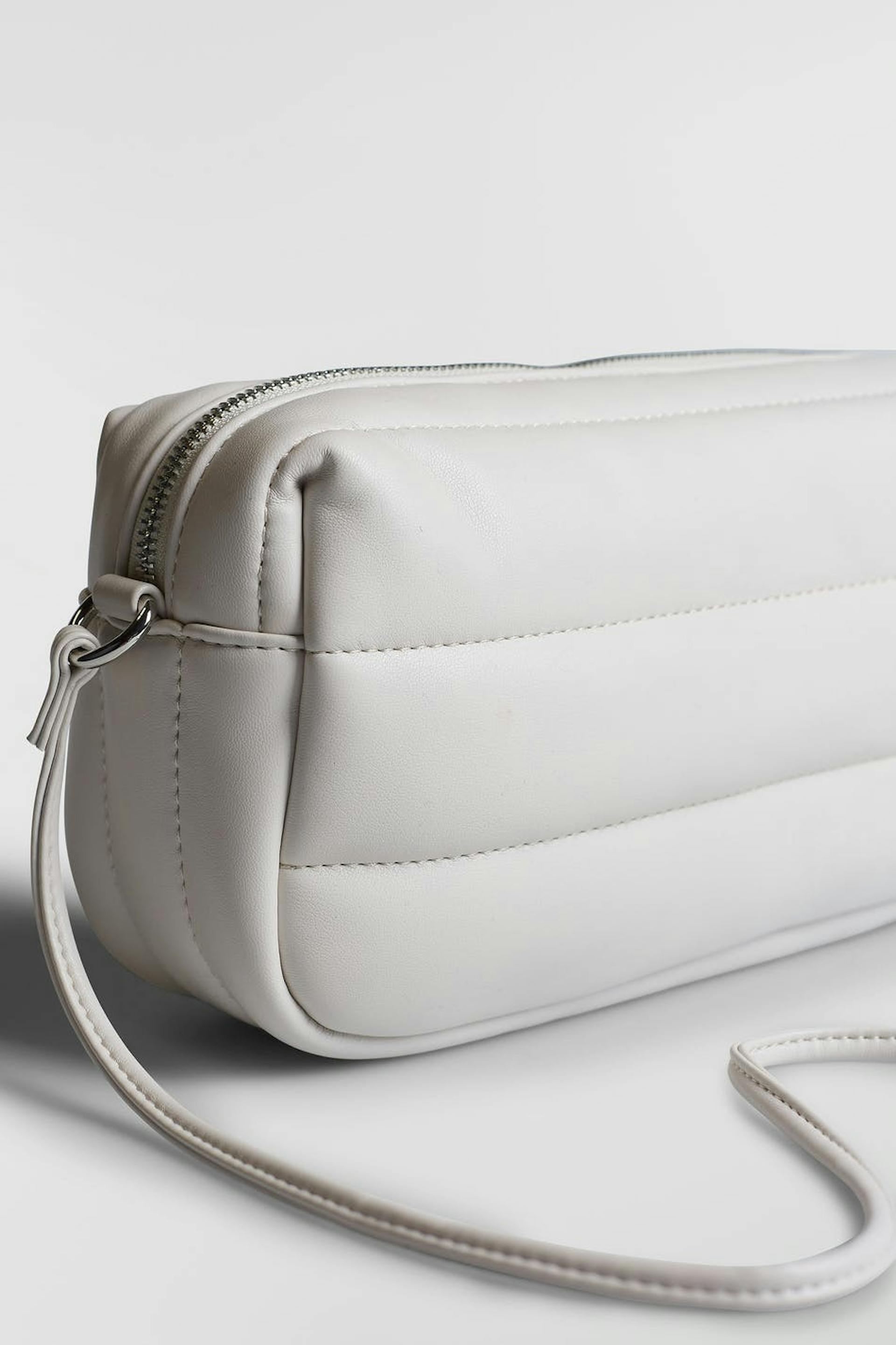 Baguette bag with a faux-leather material. The bag is beige and has decorative seam details. It has a long, thin shoulder strap and a detachable, shorter strap.