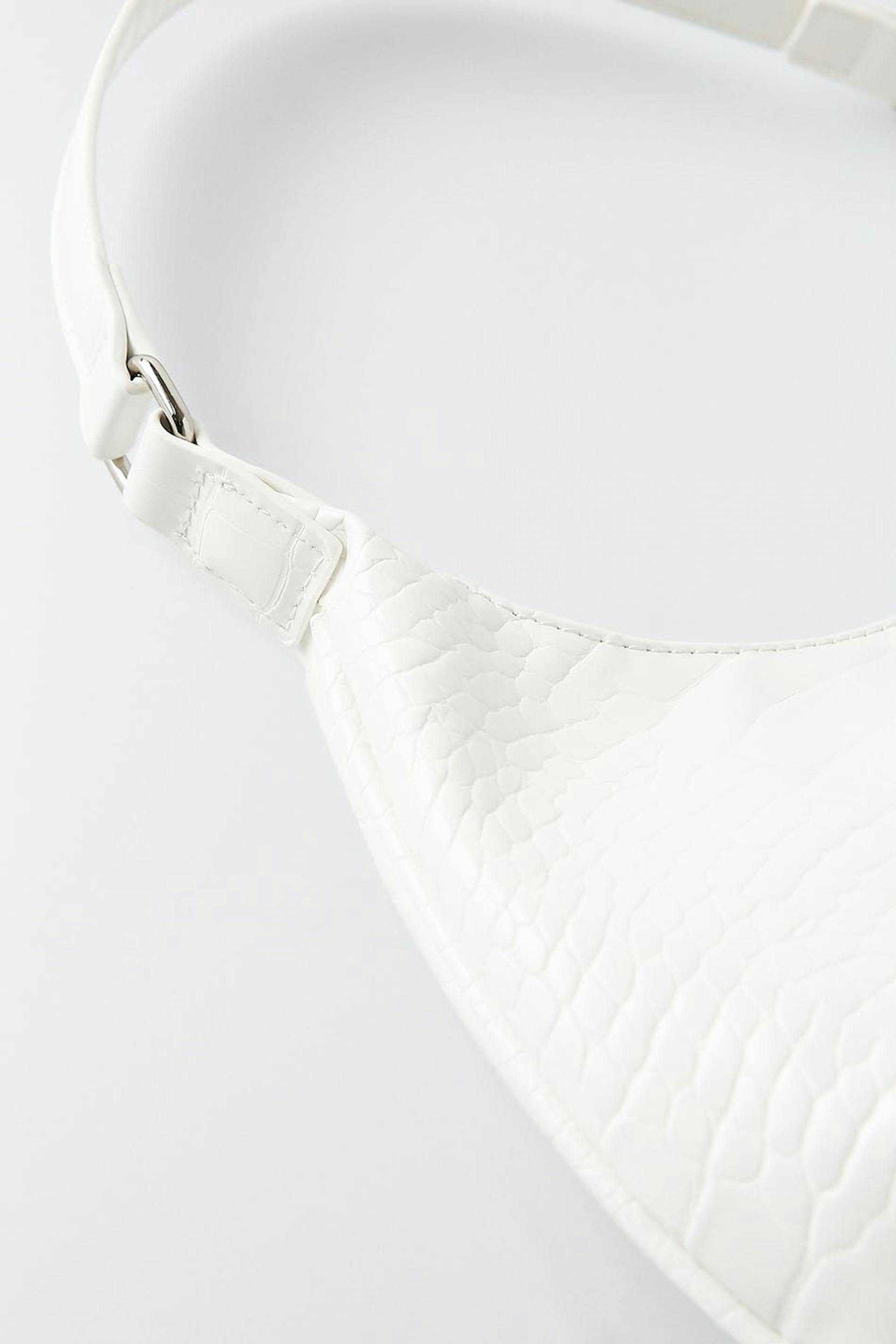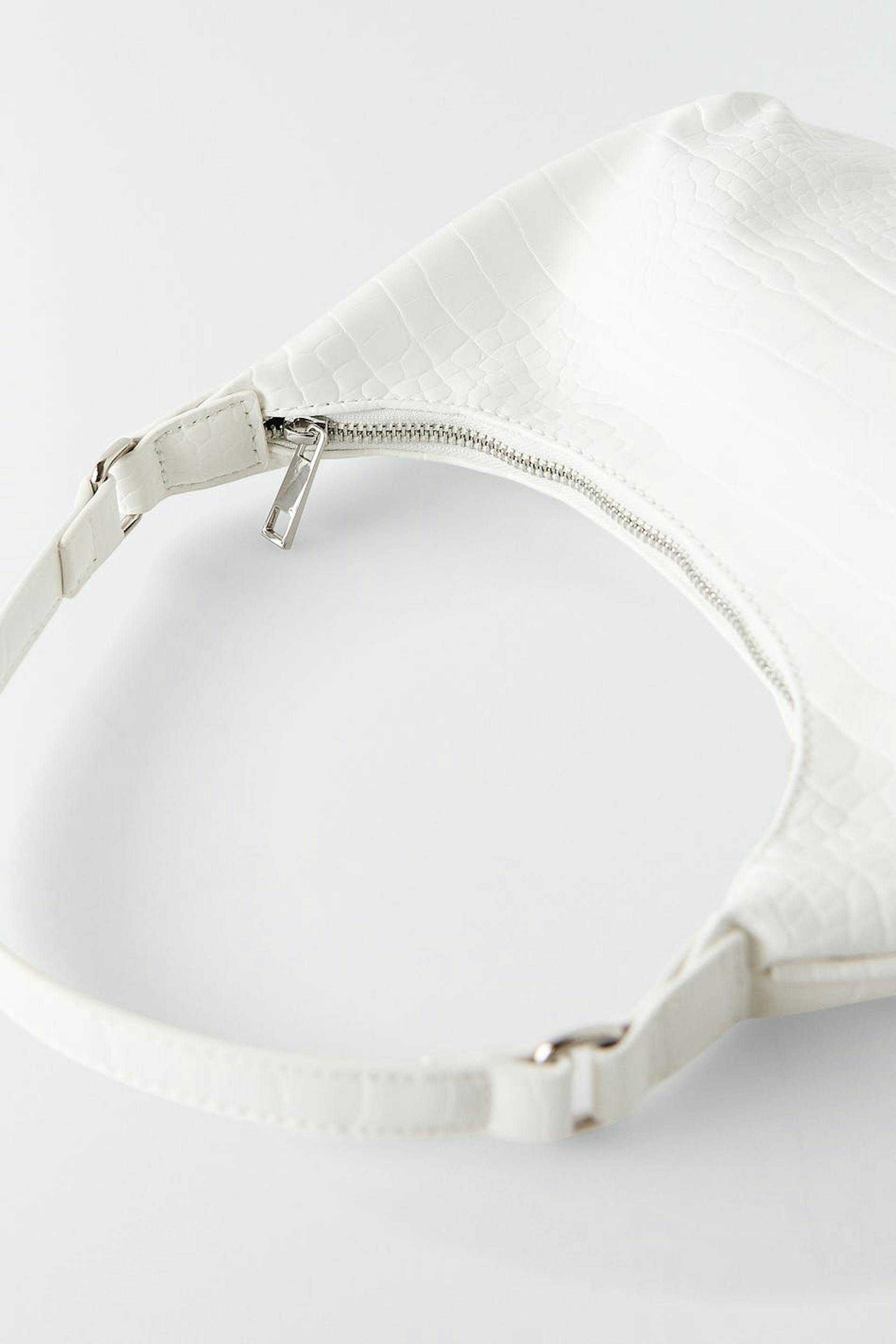 Bag with a faux-leather material. The bag is white and has a short shoulder strap. It has a zip on top.