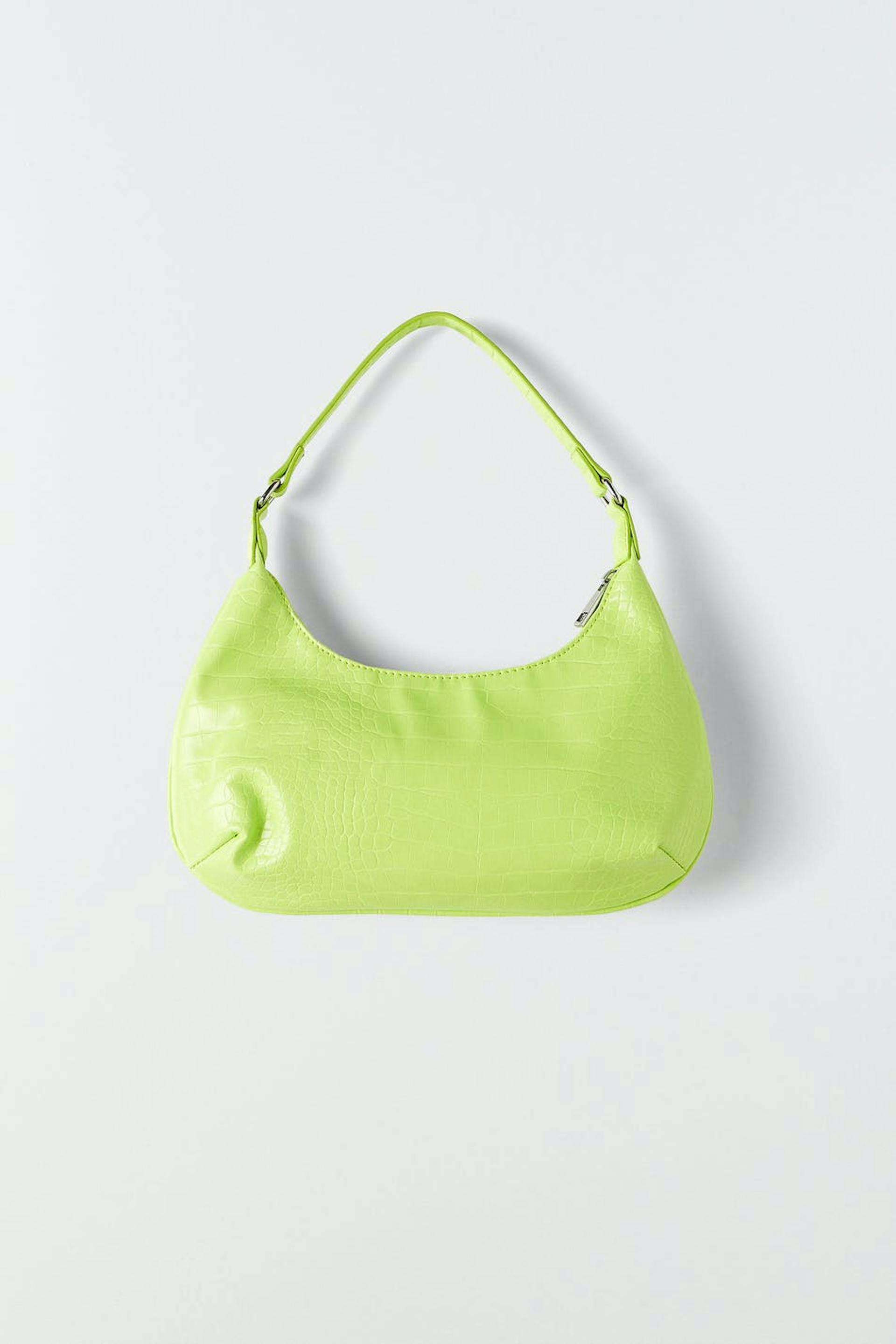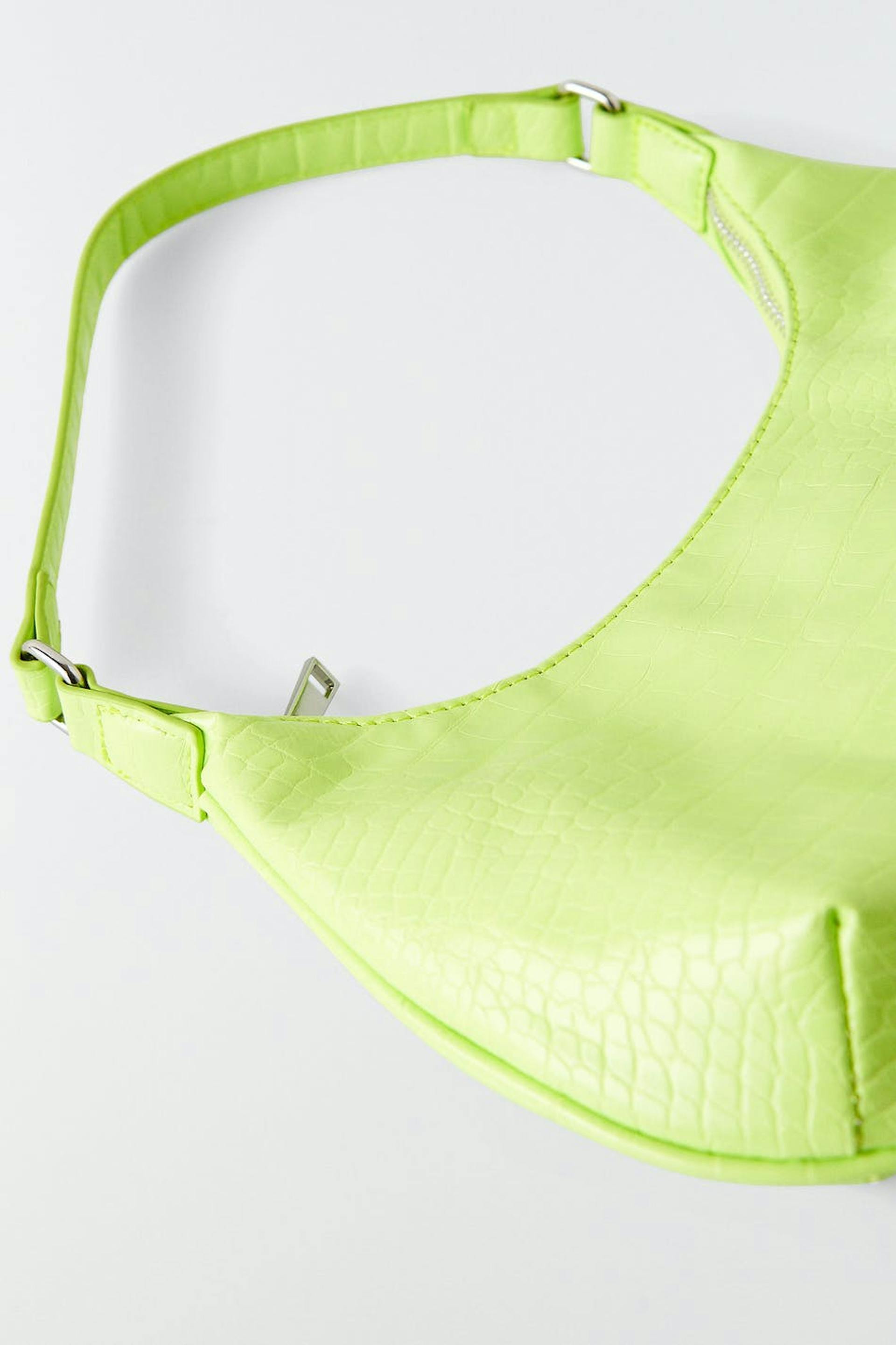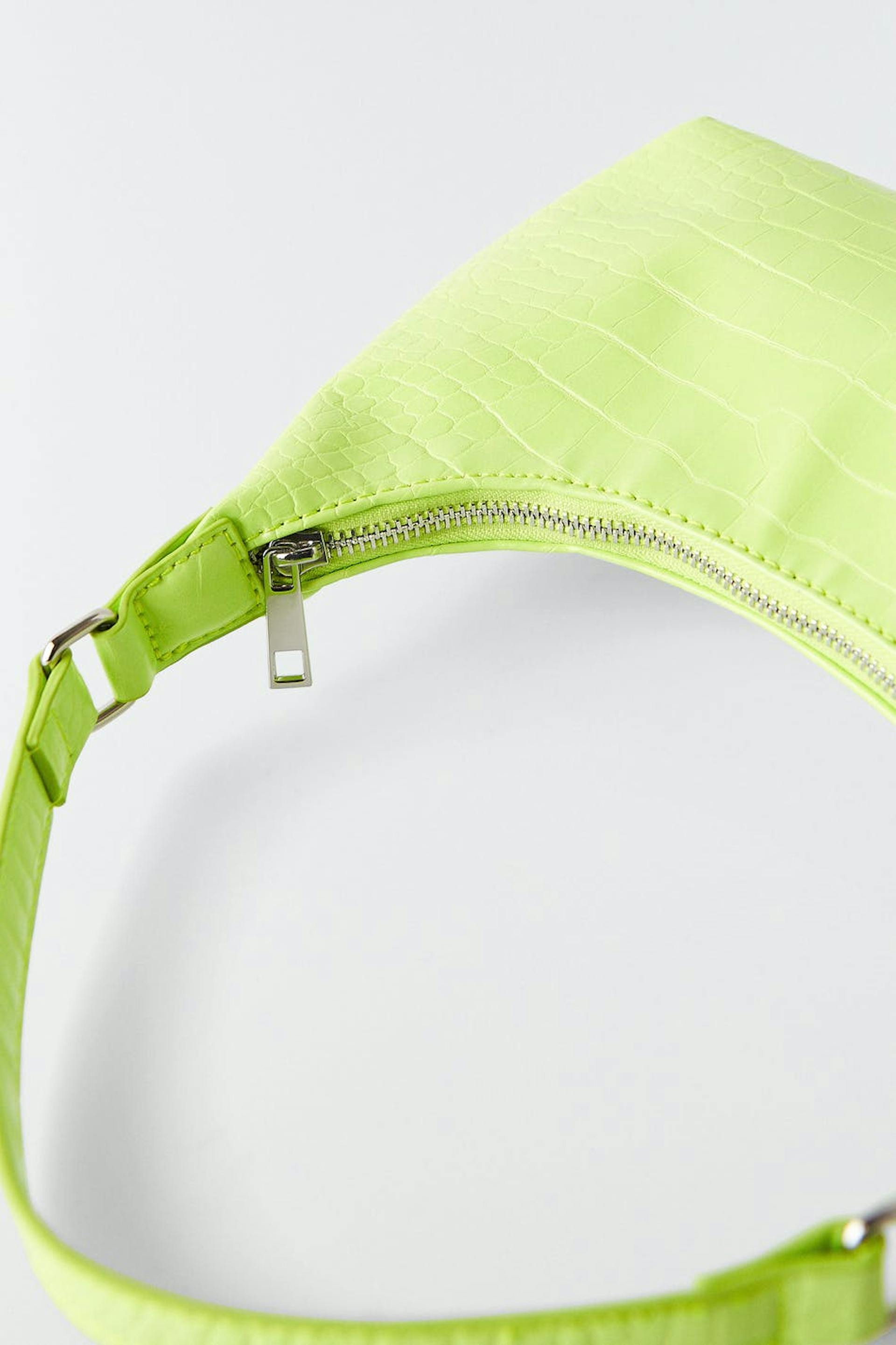 Bag with a faux-leather material. The bag is green and has a short shoulder strap. It has a zip on top.