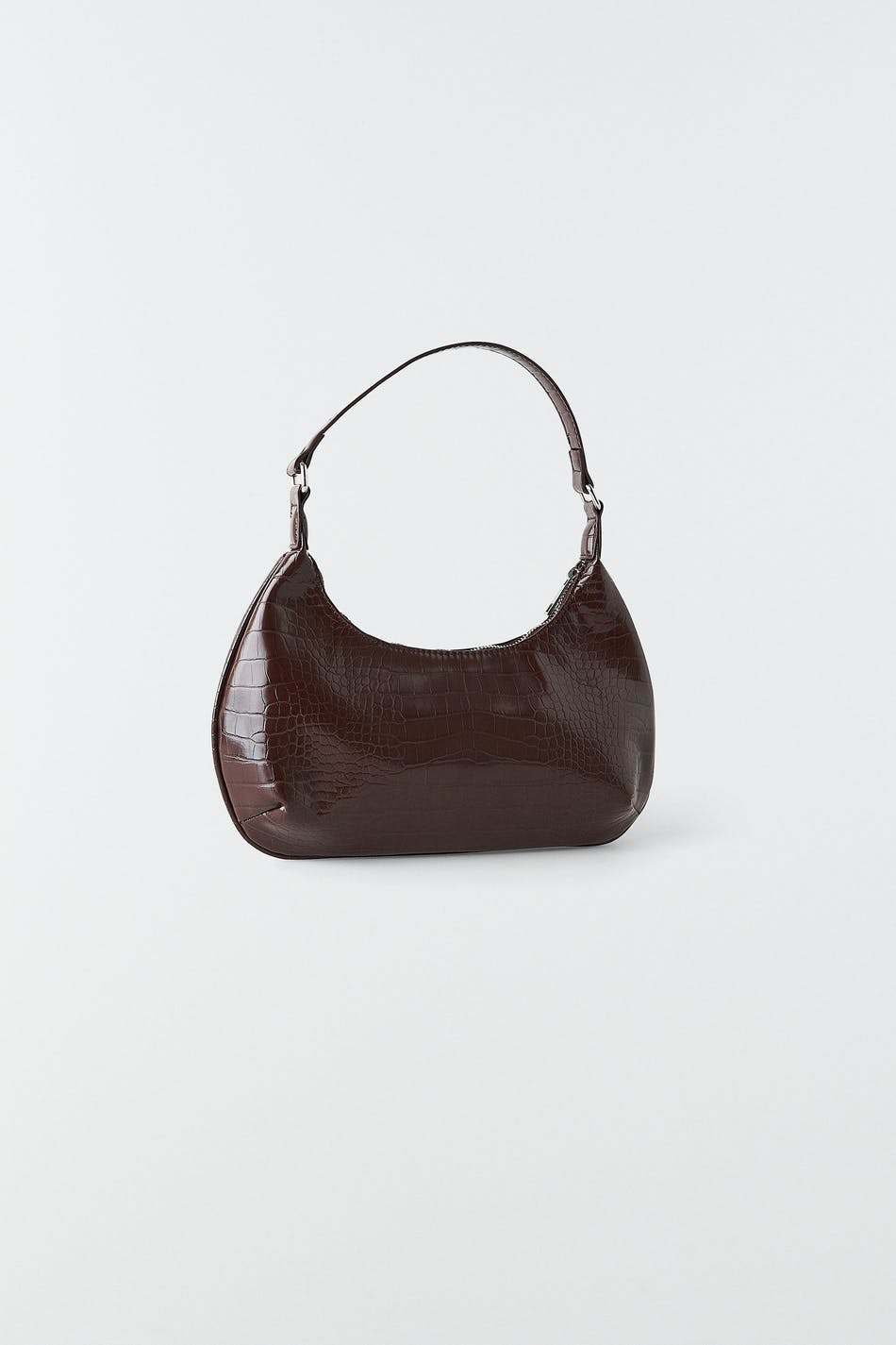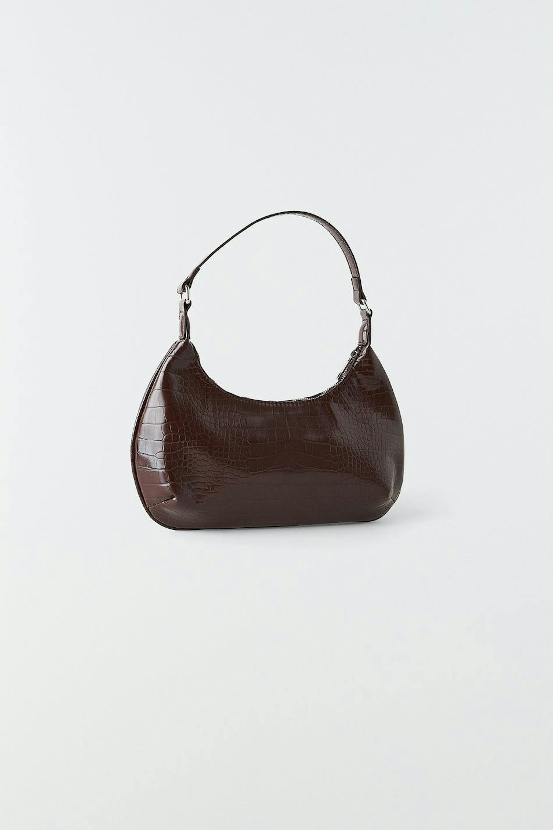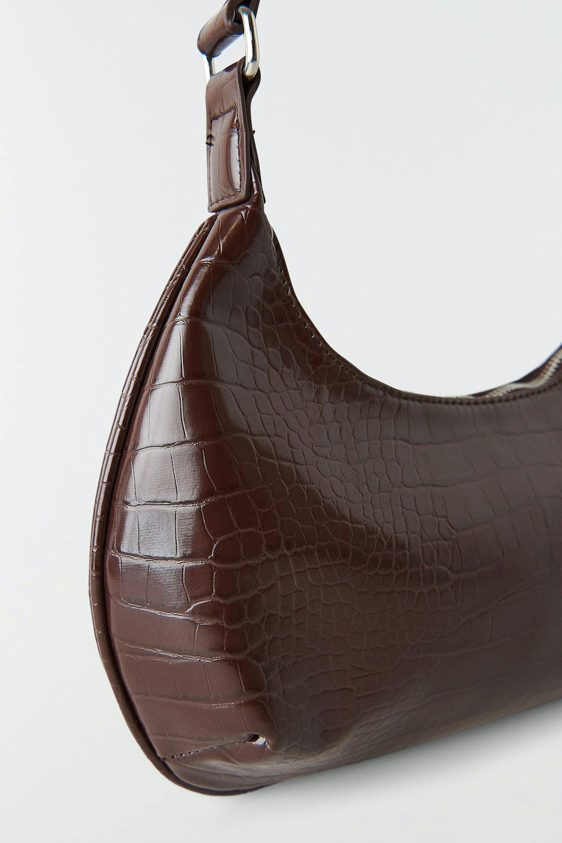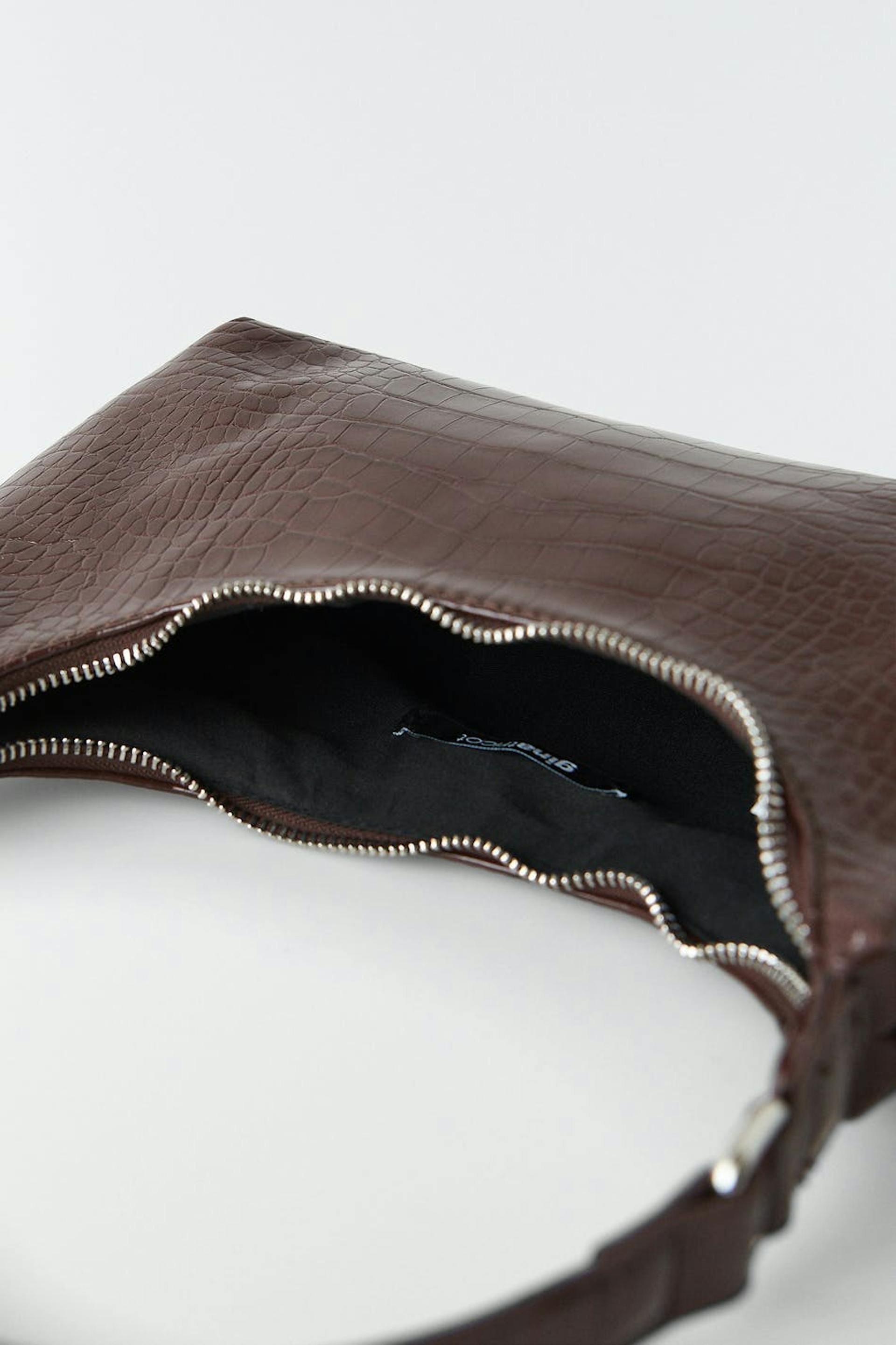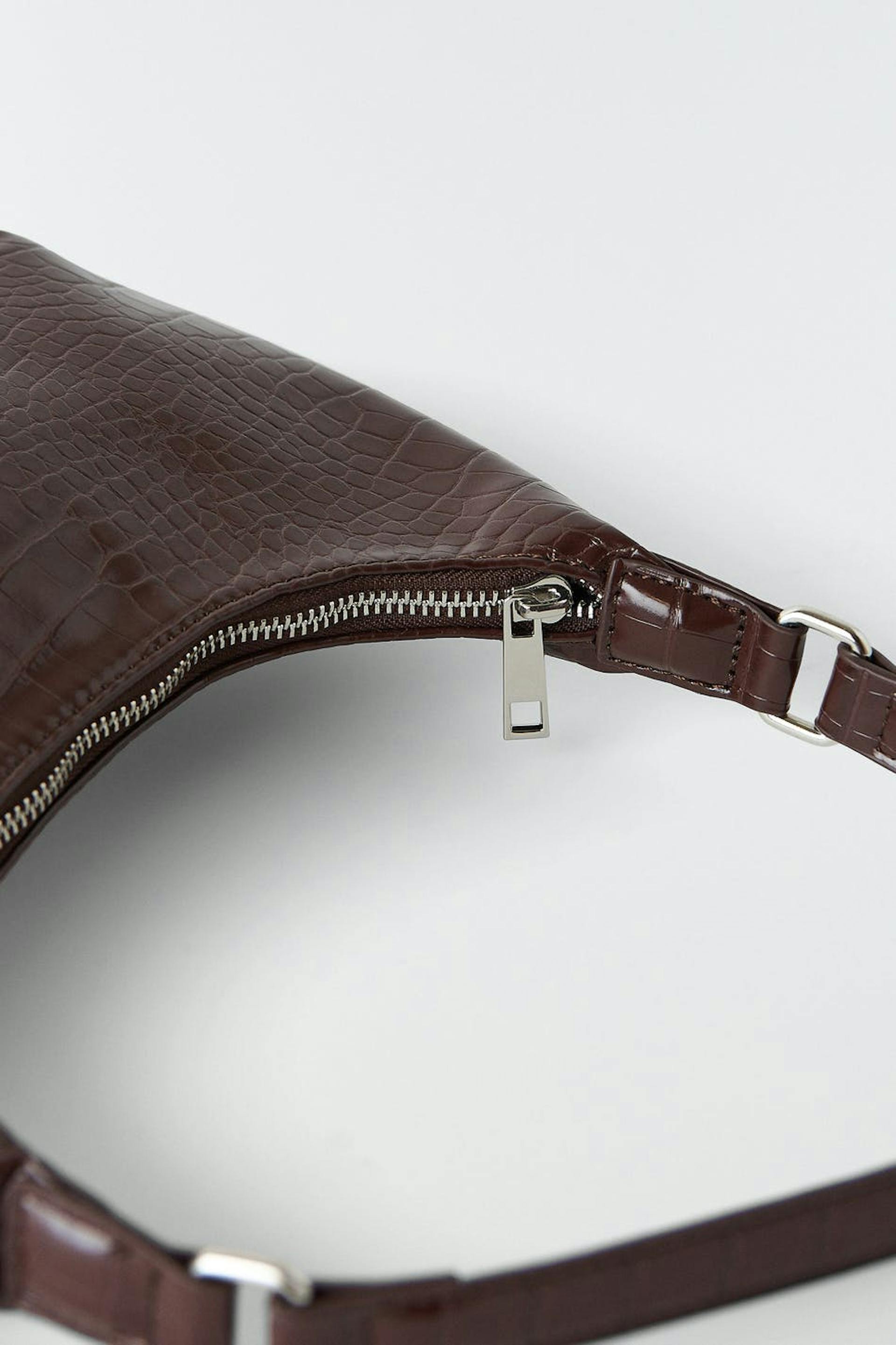 Bag with a faux-leather material. The bag is brown and has a short shoulder strap. It has a zip on top.