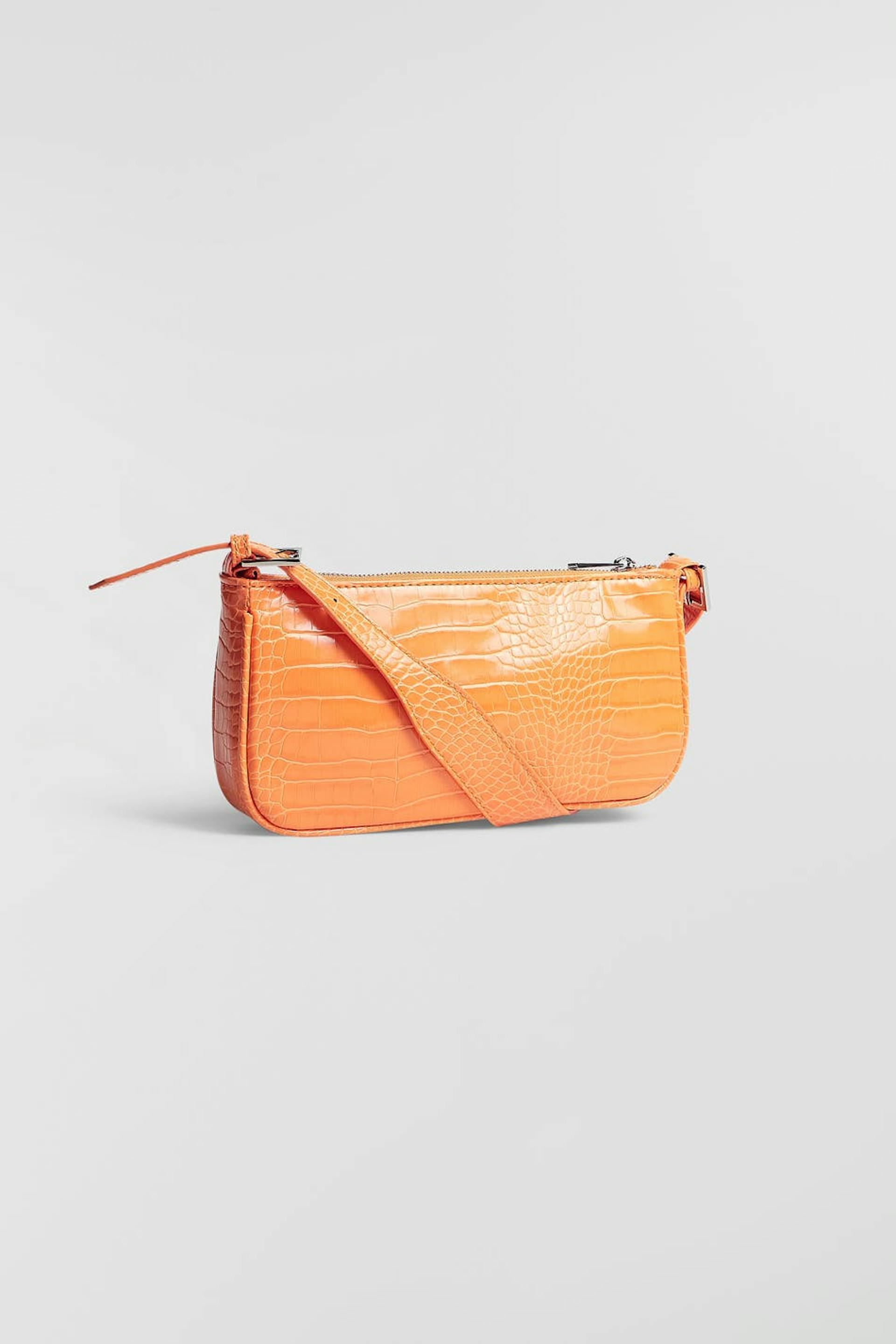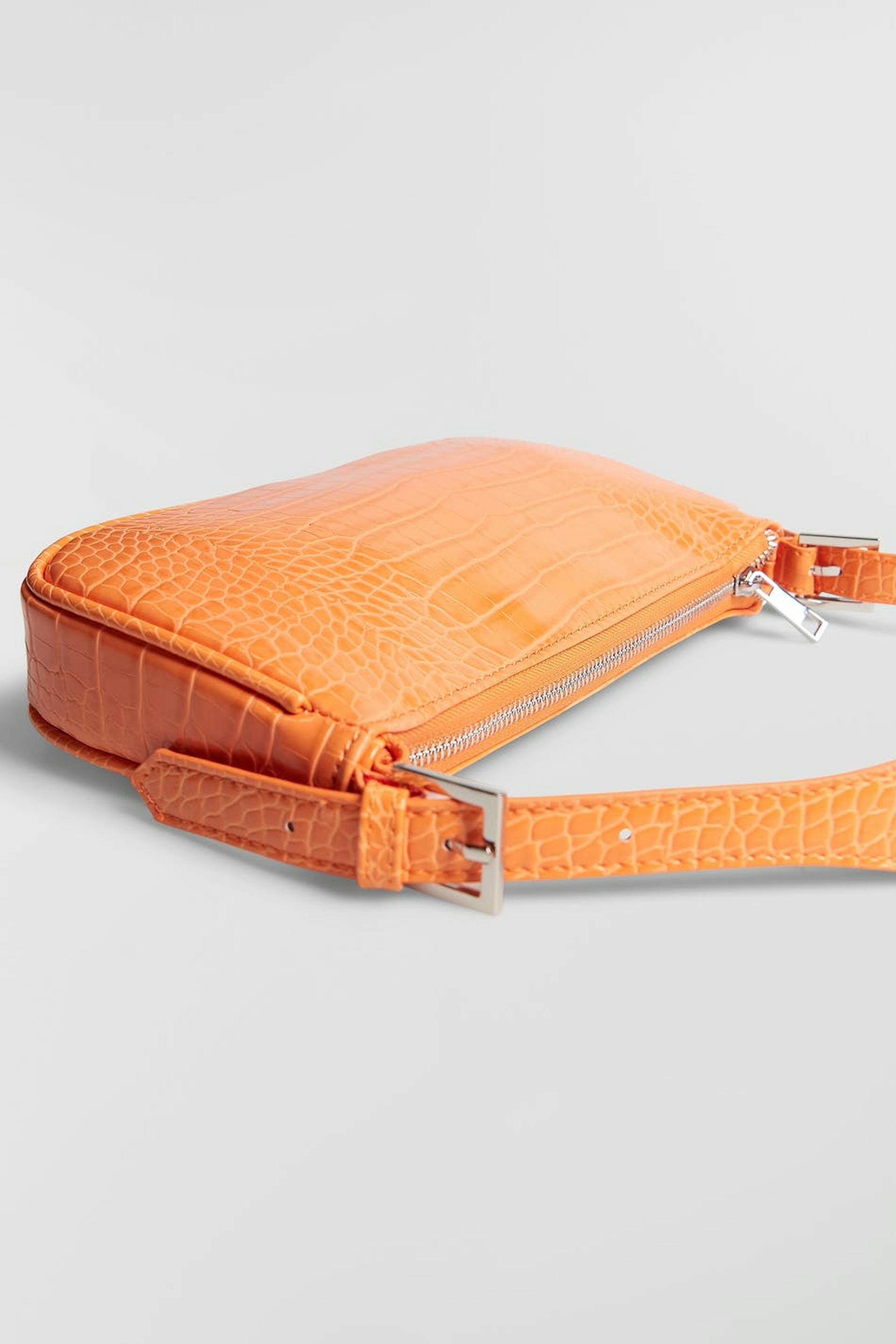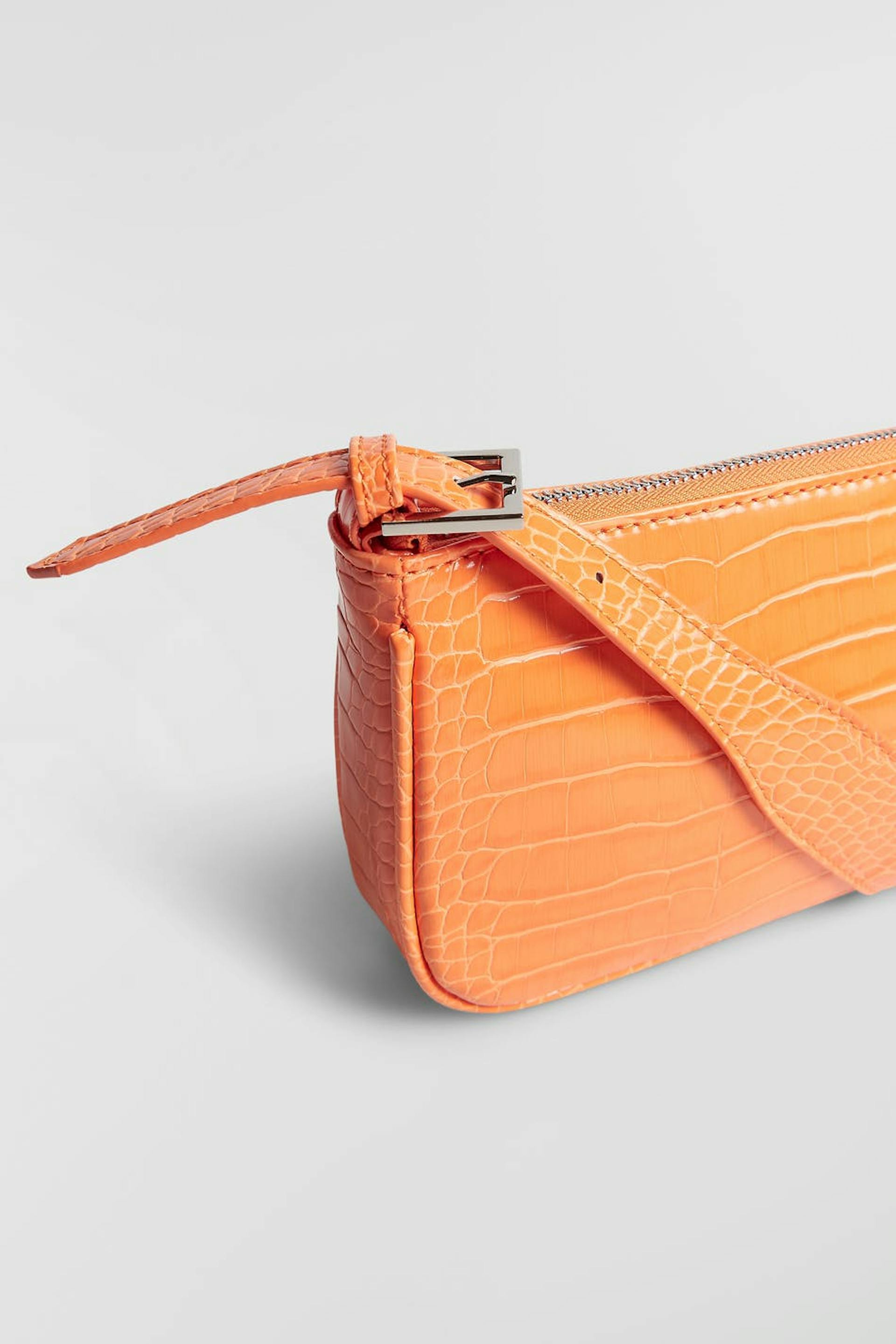 Baguette bag with a short, adjustable shoulder strap. The bag is orange and has a zip at the top.
