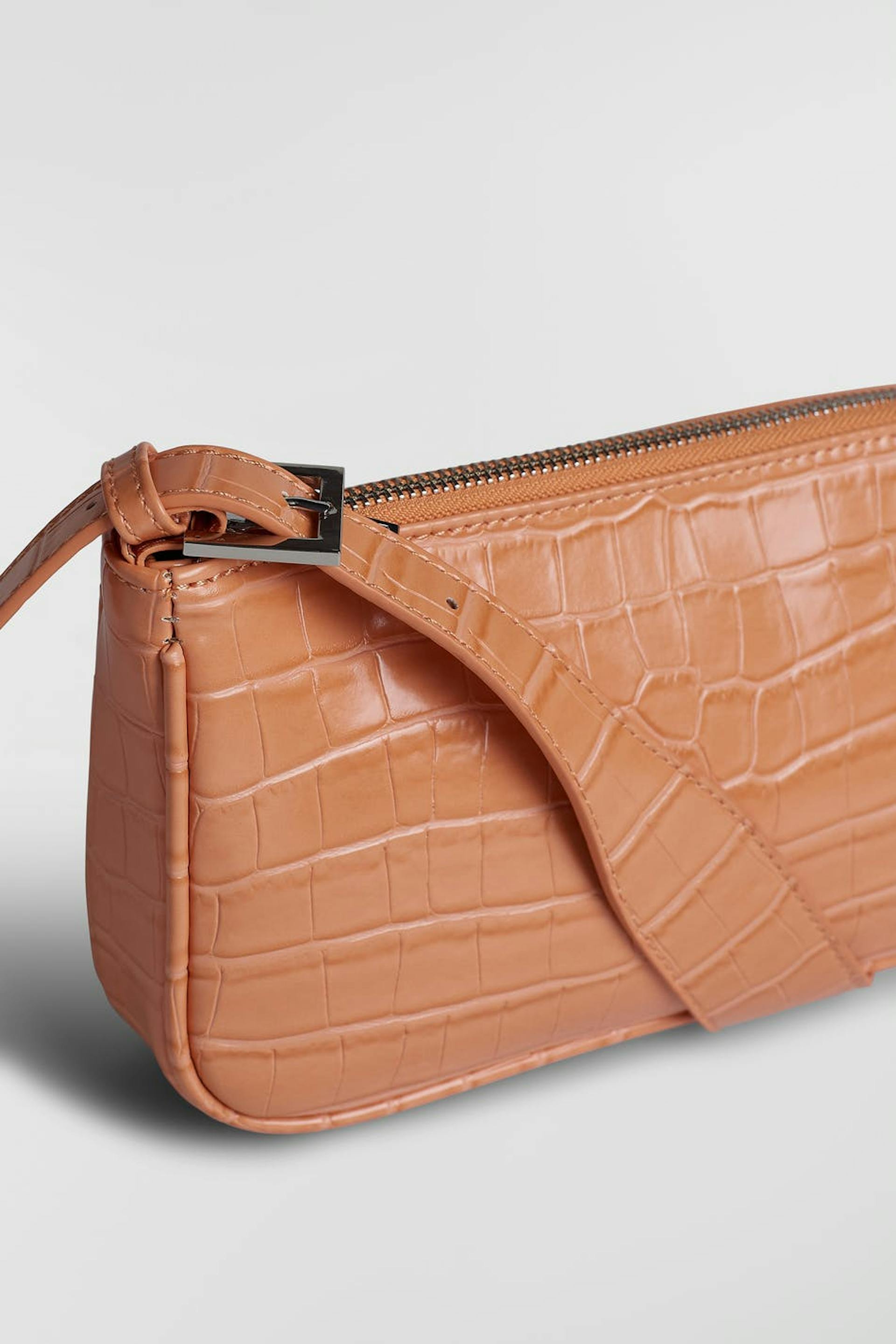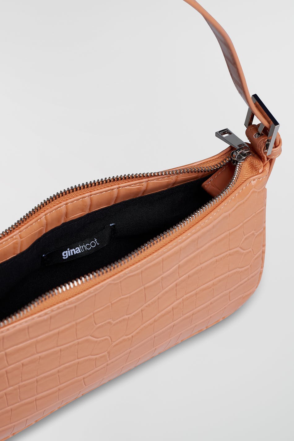Baguette bag with a short, adjustable shoulder strap. The bag is orange and has a zip at the top.