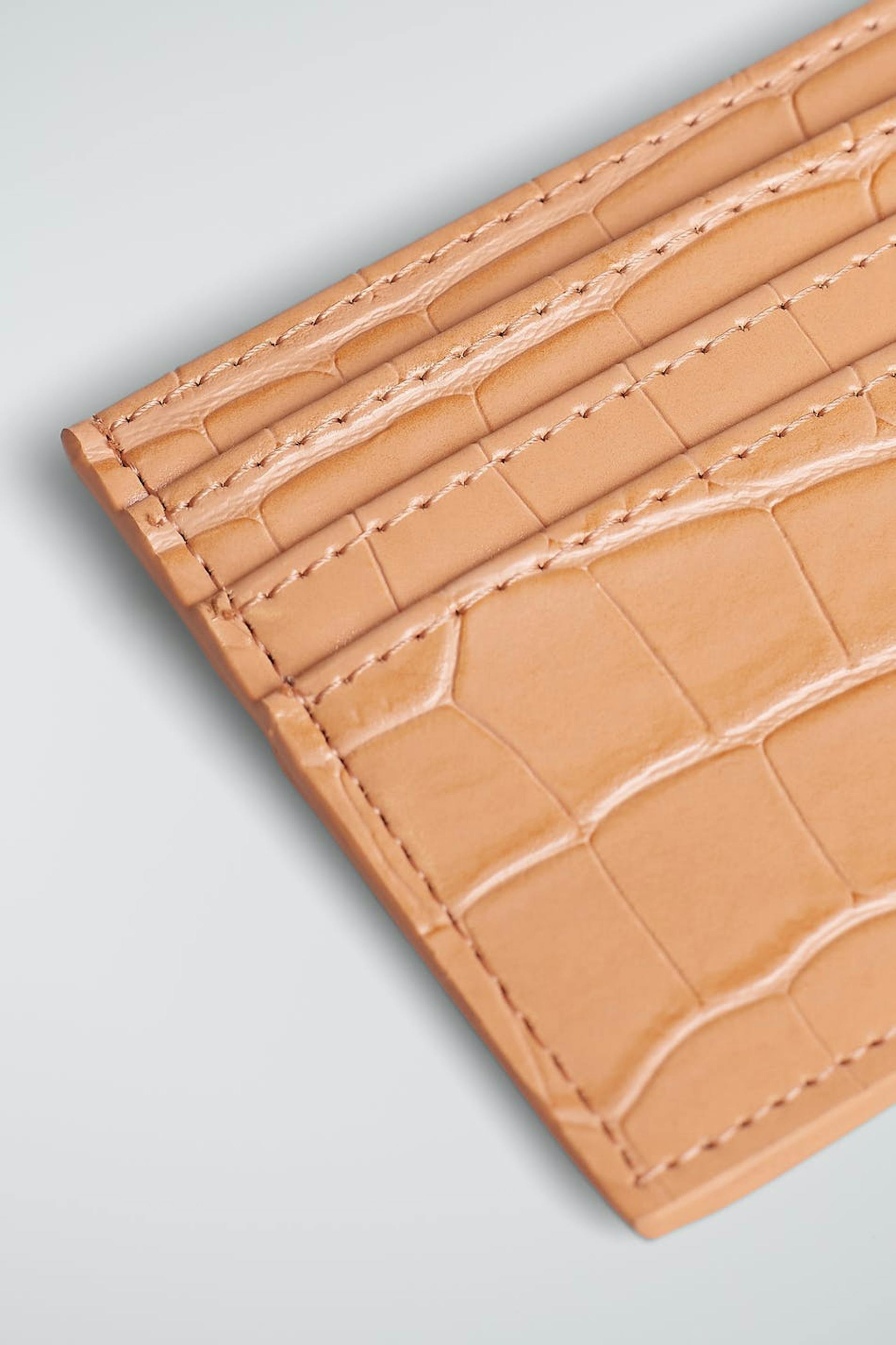 Card holder with a crocodile pattern and multiple compartments. The card holder is orange.