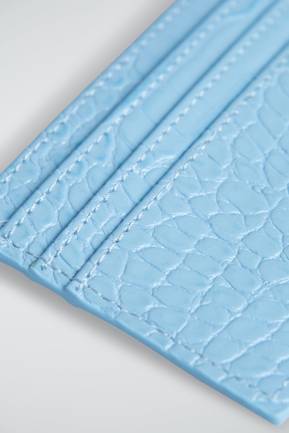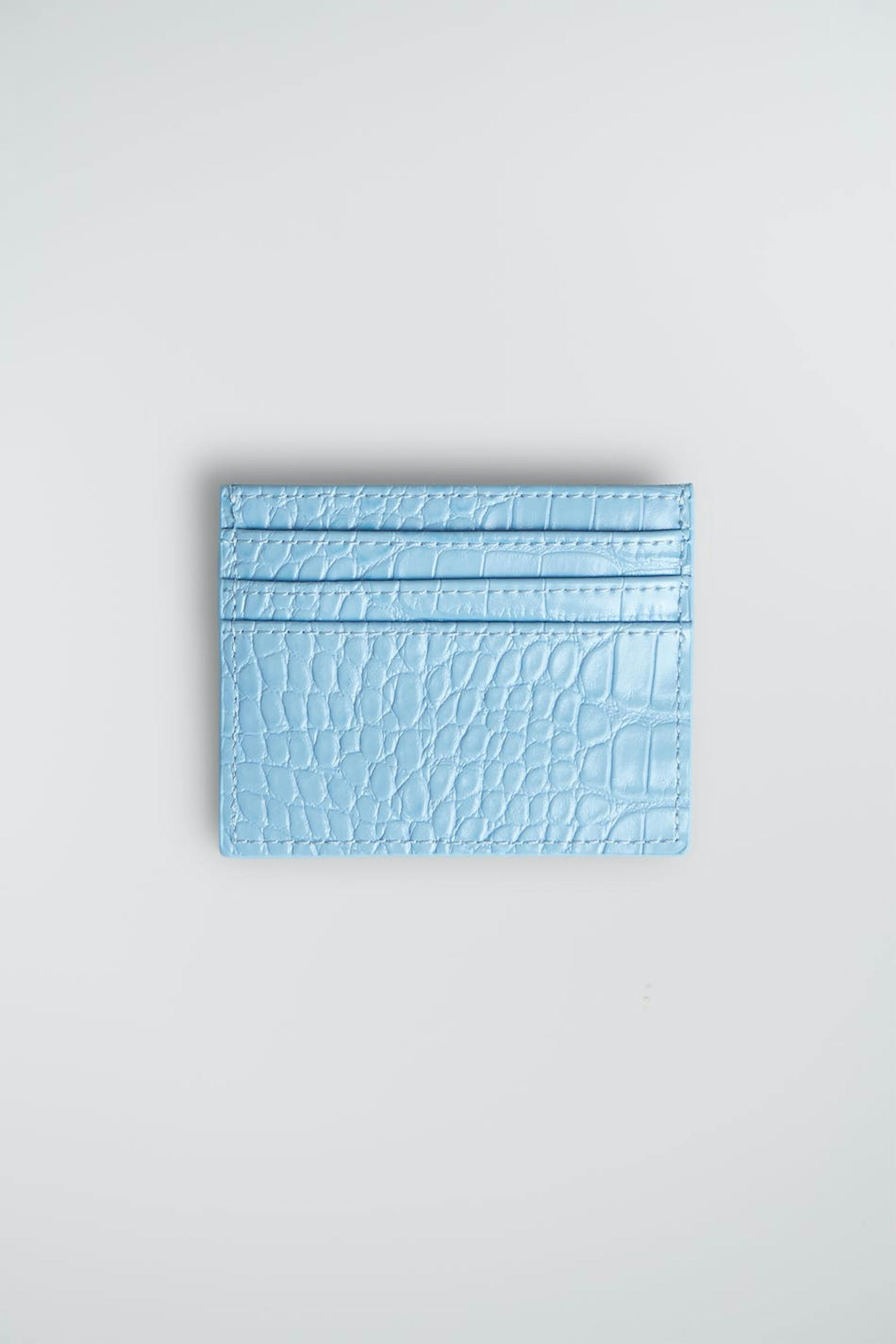 Card holder with a crocodile pattern. The card holder is light-blue.