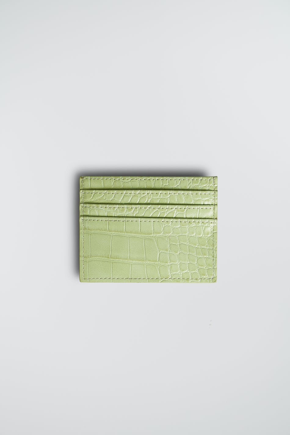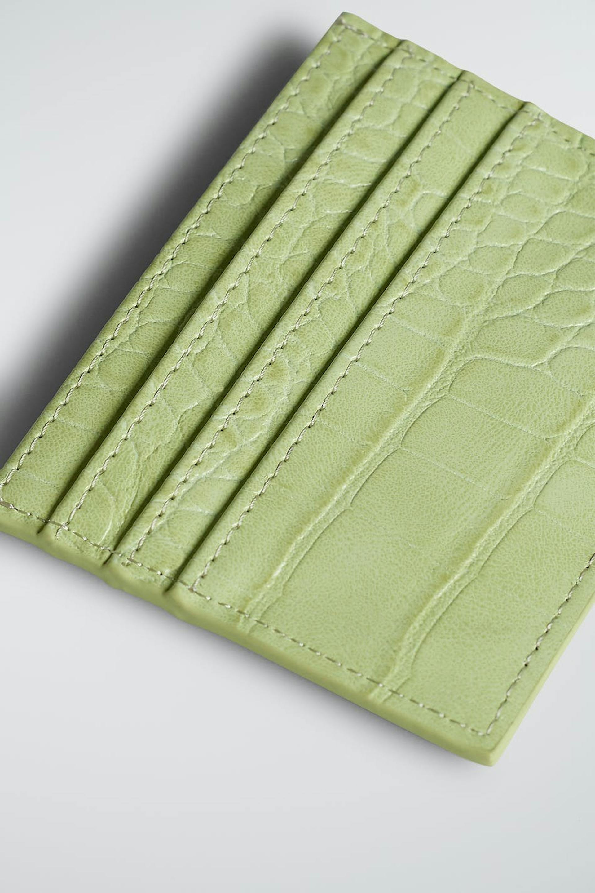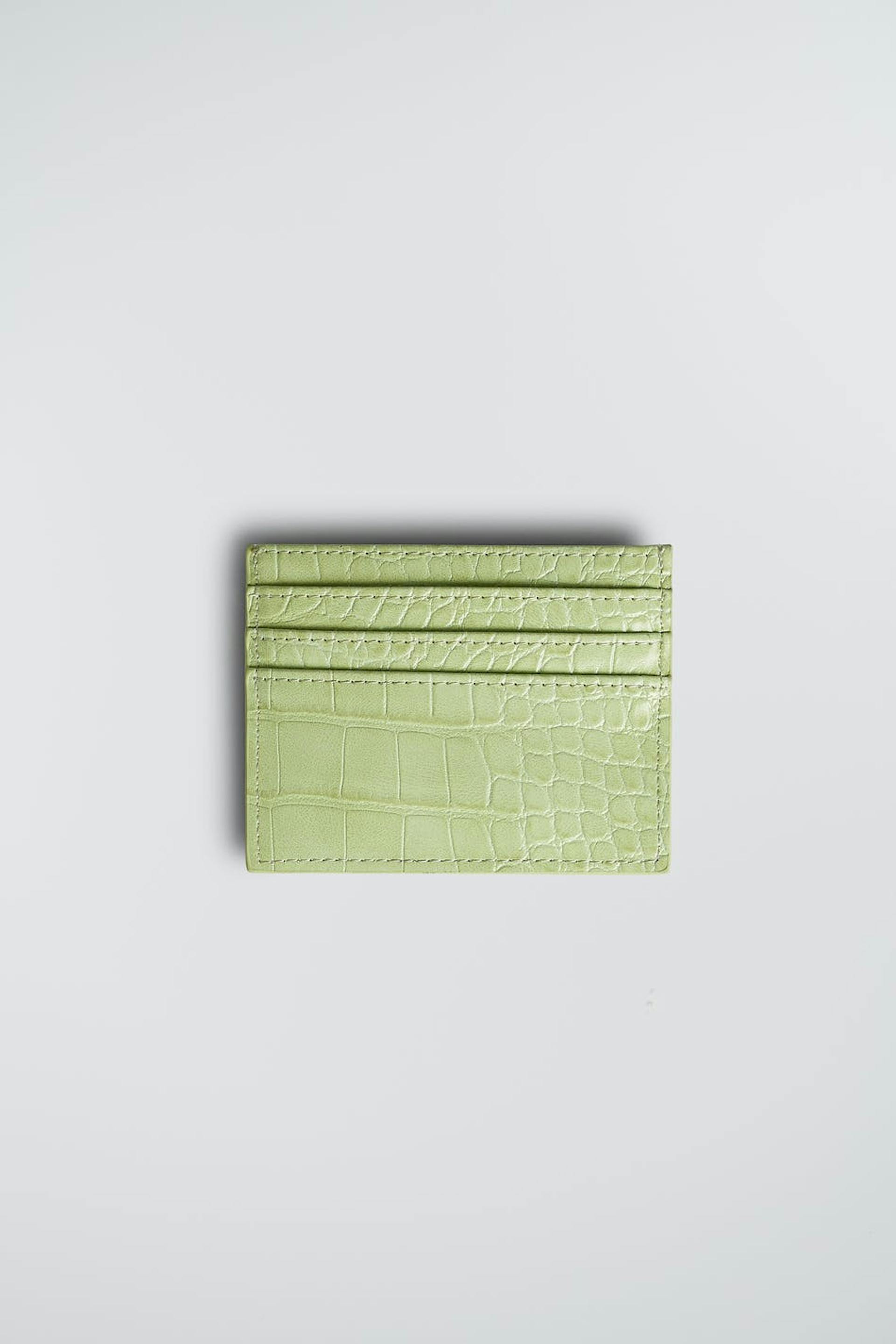 Card holder with a crocodile pattern. The card holder is light green.