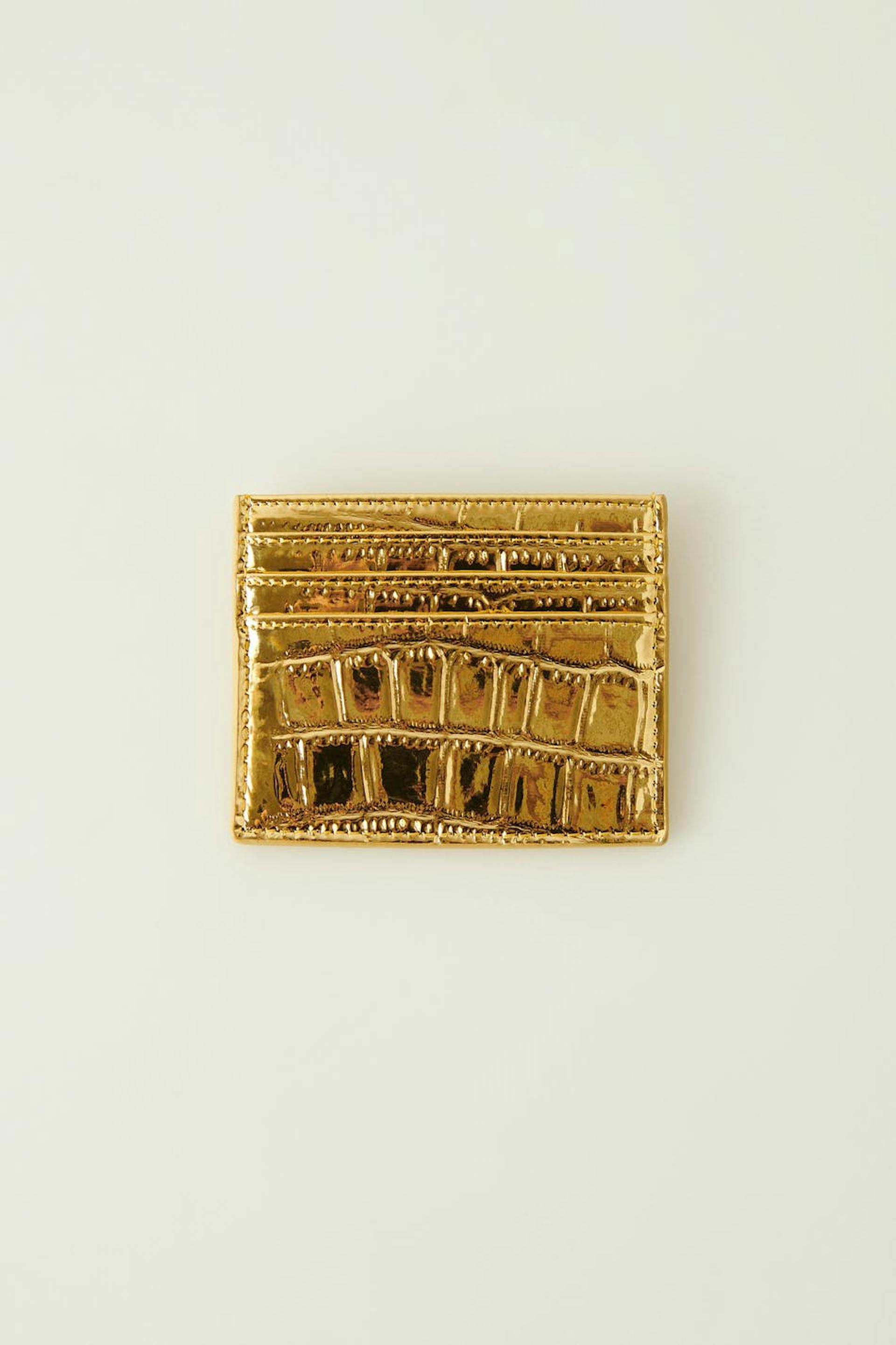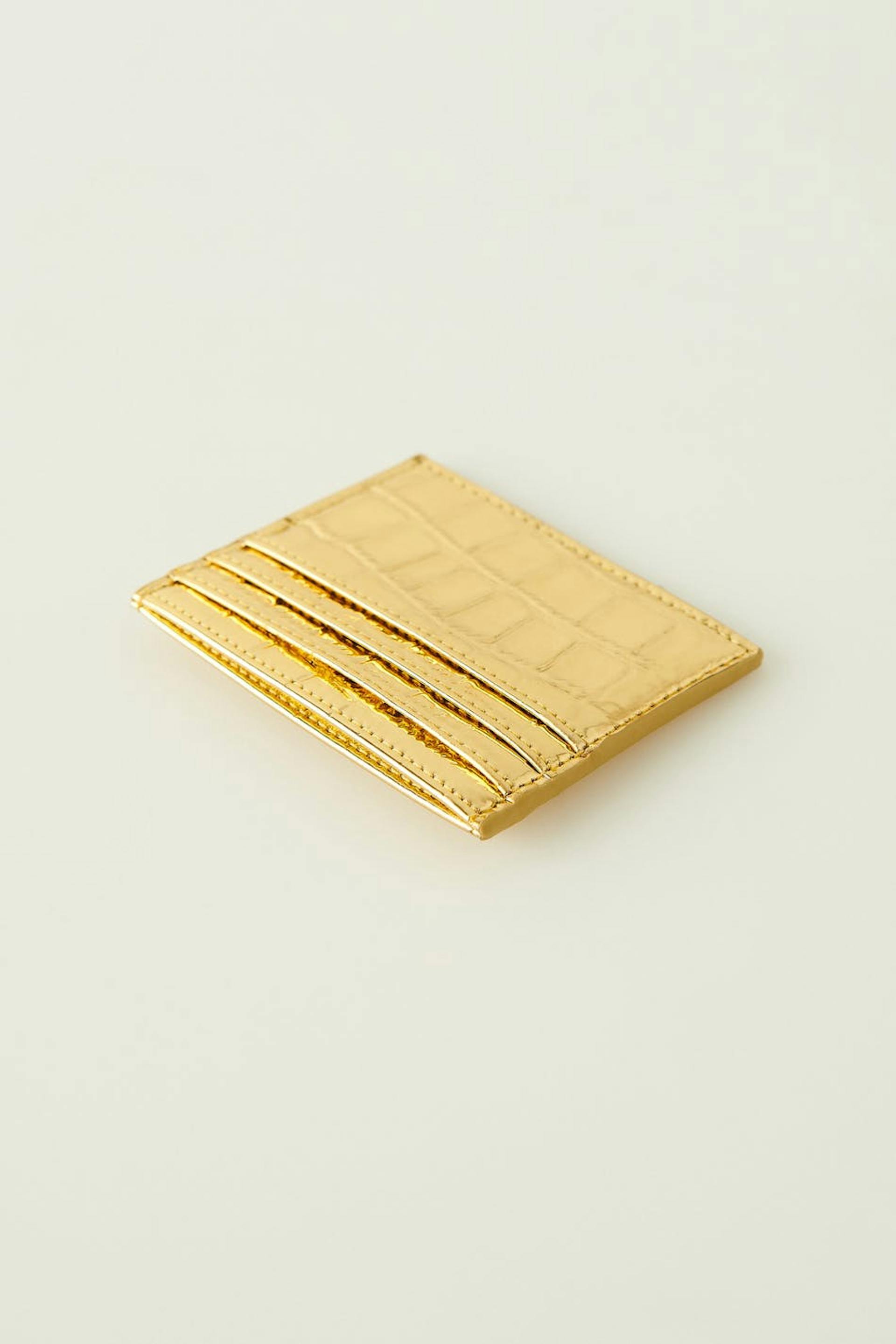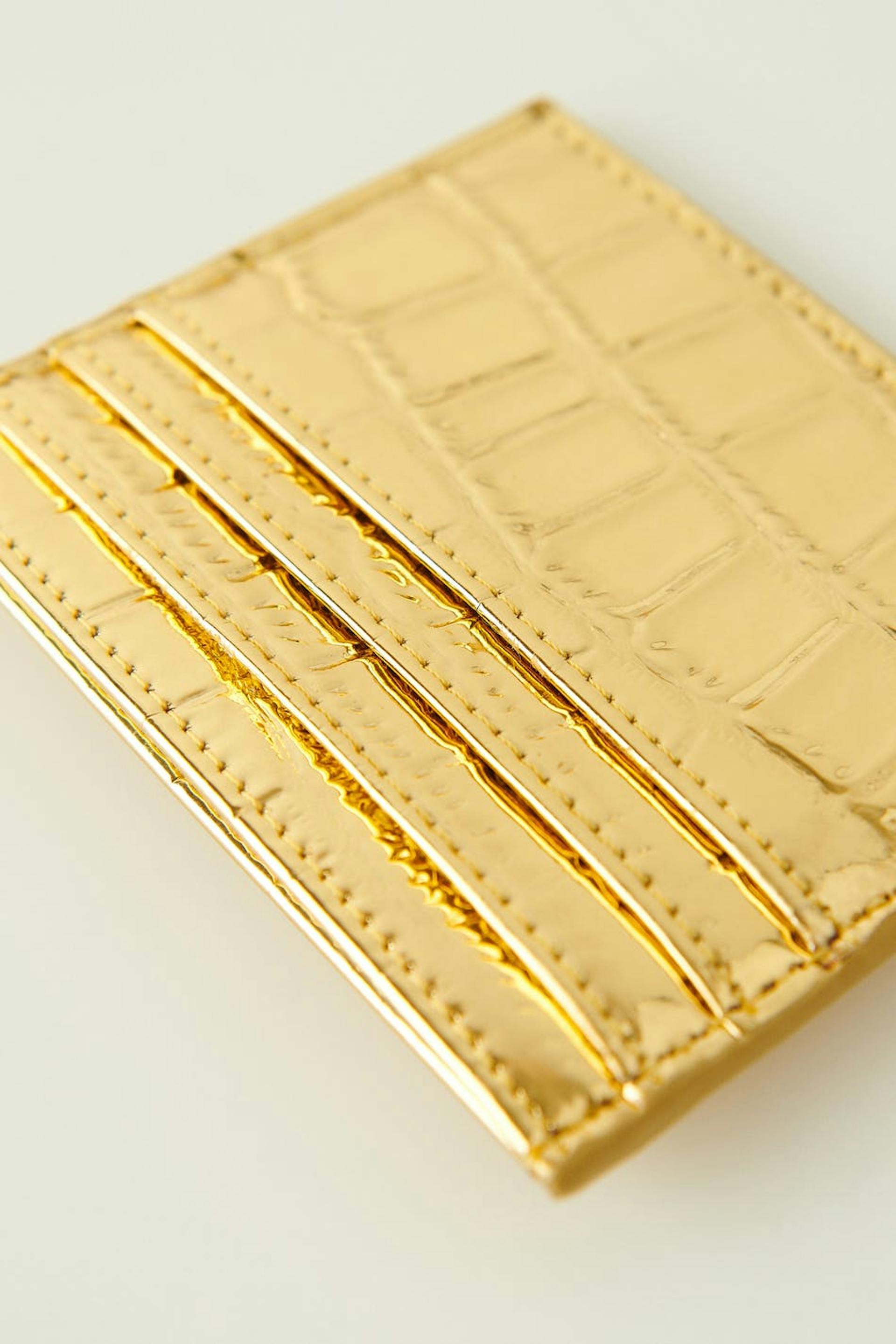 Card holder with a crocodile pattern and multiple compartments. The card holder is gold coloured.